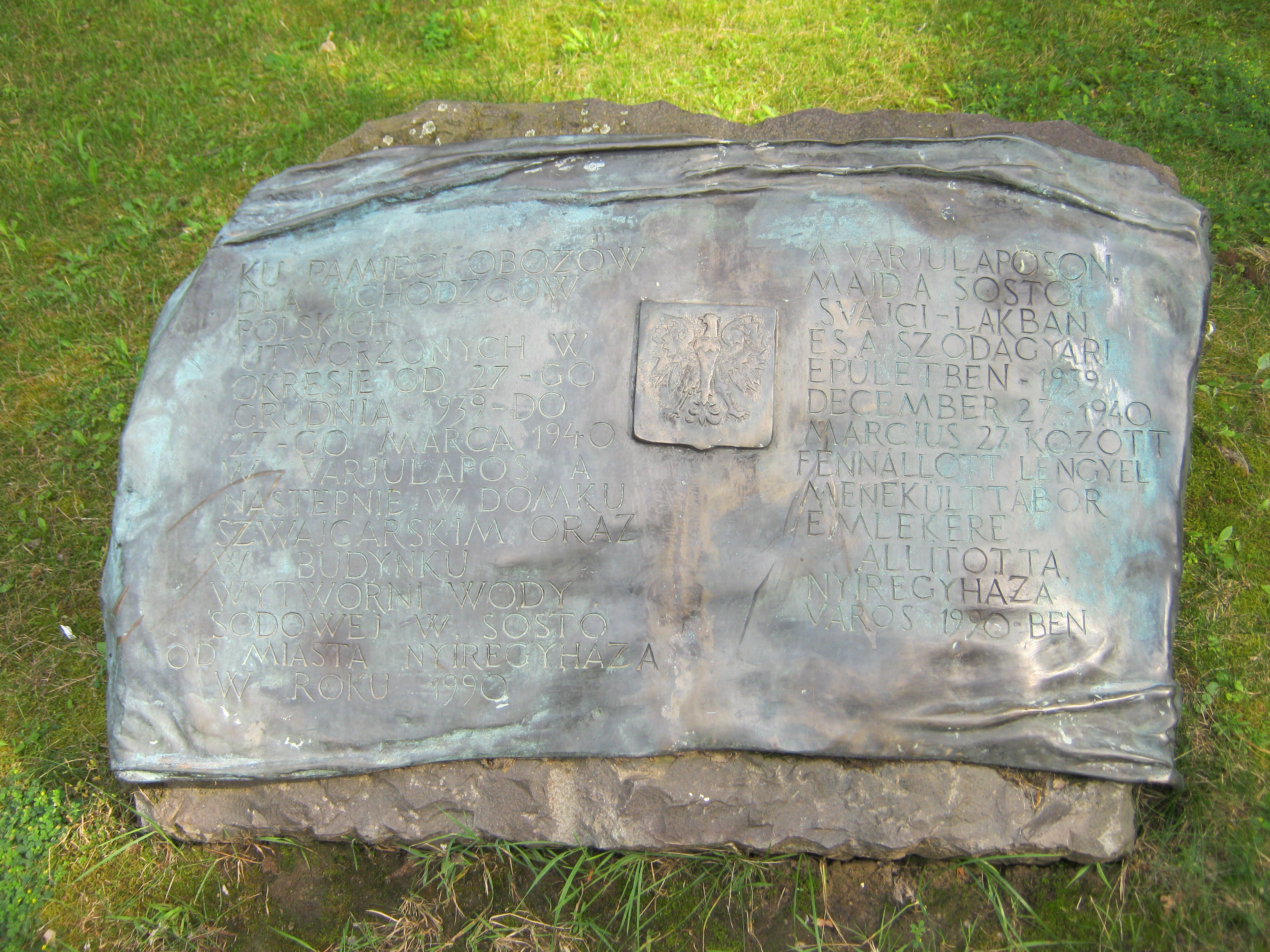 Nyilvános 1038 | 1398 | Nyíregyháza-Sóstó, Svájci lak | A Svájci lak előtt kétnyelvű emlékkő idézi azt az időszakot, amikor a szálloda és a környező épületek 1939/40-ben lengyel menekülttábornak adtak helyet. A fénykép 2010 augusztus elején készült |