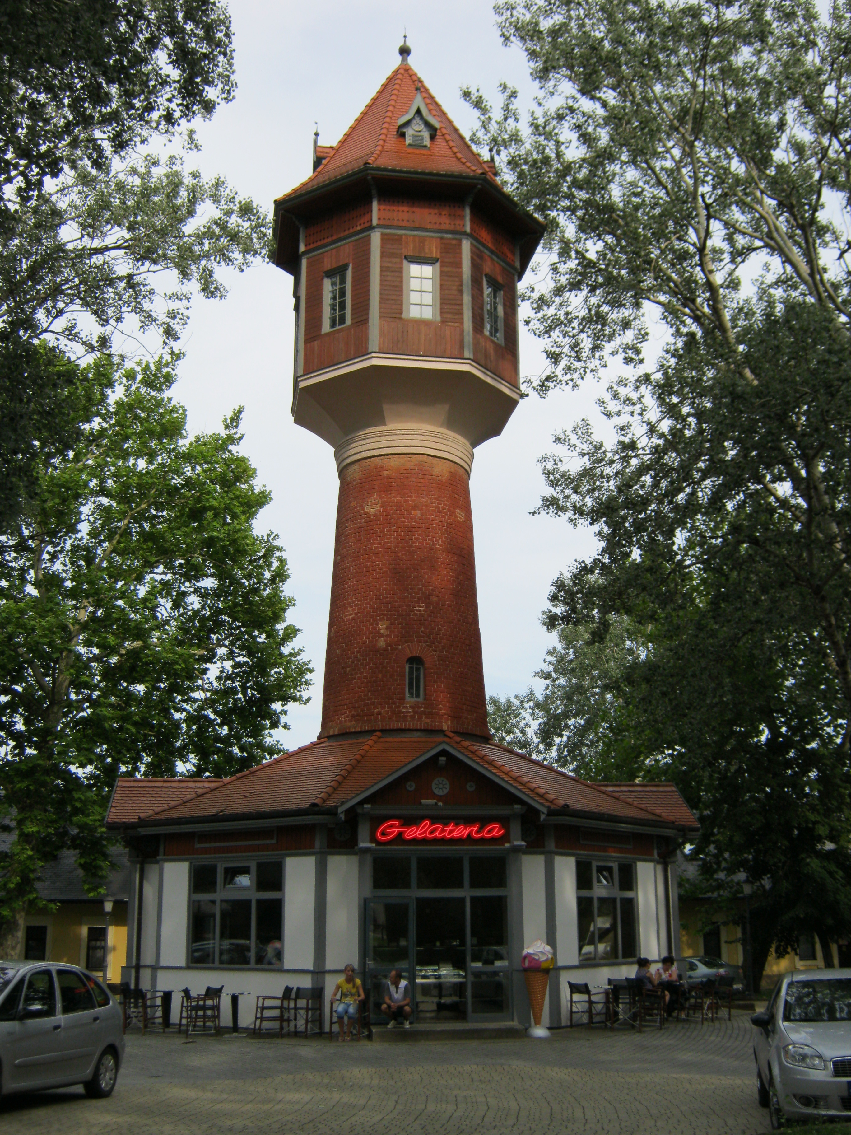 Nyilvános 1149 | 4305 | Nyíregyháza-Sóstó, Víztorony | Sóstófürdő szimbóluma a szintén Pazár István által 1911-ben tervezett víztorony. A felfelé keskenyedő vörös téglaoszlopot kiszélesedő, nyolcszögletű toronyrész koronázza. A 60 köbméteres víztorony ma már nem működik, ipari műemlékké nyilvánították. Földszintjén idegenforgalmi iroda és pizzabár működik. Felh. irod.: Látnivalók Szabolcs-Szatmár-Bereg megyében. Miskolc, Well-PRess, 1990 A fénykép 2010 augusztus elején készült |