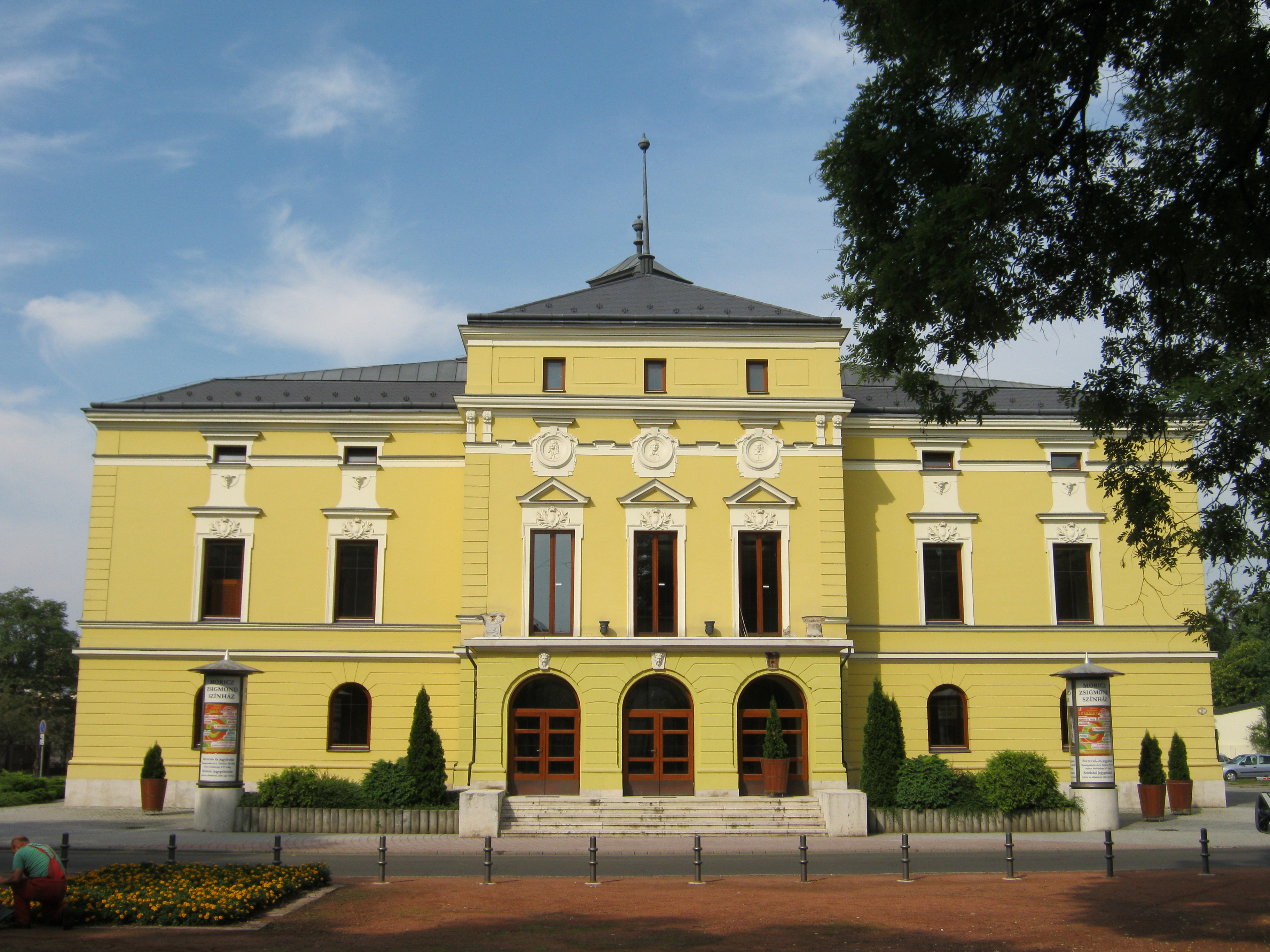 Nyilvános 1056 | 1471 | Nyíregyháza, Bessenyei tér 13. | Nyíregyháza első állandó kőszínháza 1894-ben épült Alpár Ignác tervei szerint eklektikus stílusban. 1955-ben teljesen felújították, csak a színpadi nyílás körüli négy fal maradt meg a régiekből, az épület minden irányban kitágult. Saját társulattal 1981 óta rendelkezik. Felh. irod.: Látnivalók Szabolcs-Szatmár-Bereg megyében. Miskolc. Well-PRess, 1999 www.moriczszinhaz.hu A fénykép 2010 augusztus elején készült. |