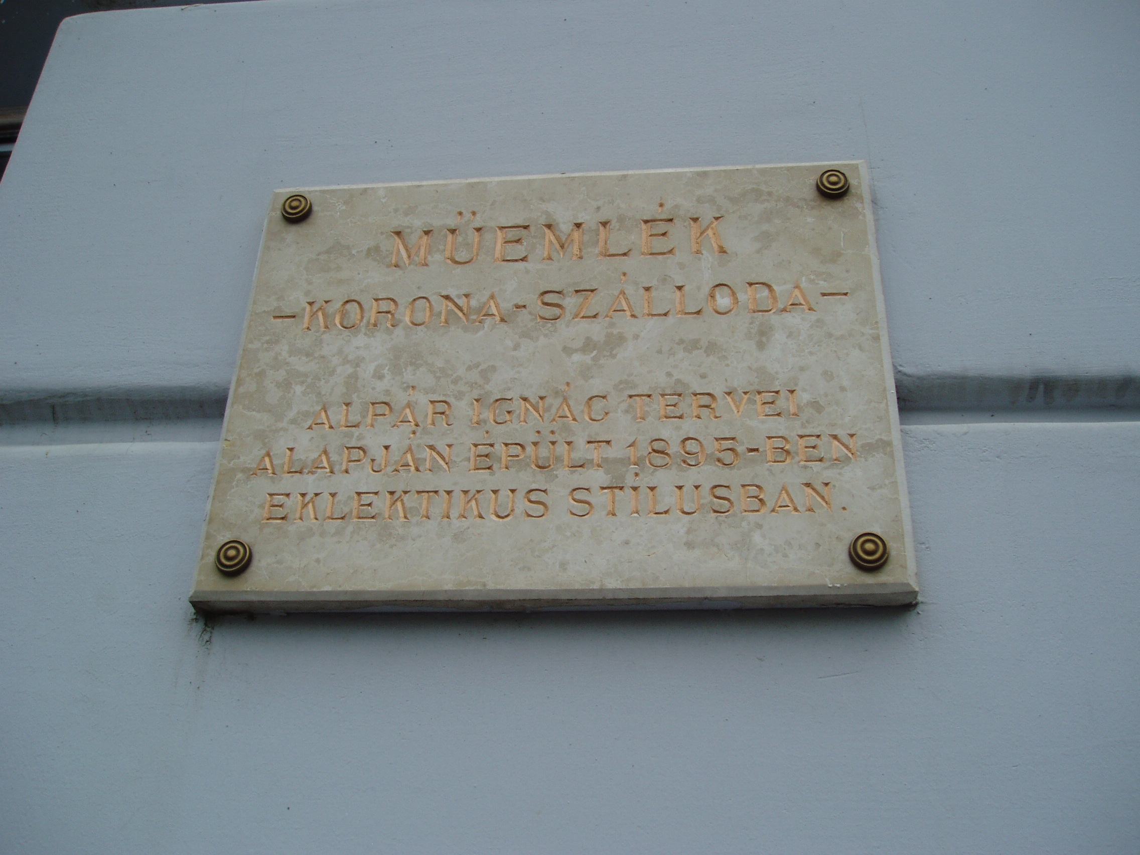Nyilvános 1039 | 1433 | Nyíregyháza, Dózsa György utca 1. Korona szálló | Az eklektikus stílusú szálloda Nyíregyháza központi terének fő ékessége. 1895-ben épült Alpár Ignác tervei szerint. A neves budapesti építész több épületet is tervezett a városnak: az evangélikus elemi iskolát, a megyeházát és a szállodával majdnem egyidőben épült színházat (lásd: Nyíregyháza, Bessenyei tér 13.). A Korona nagyterme Nyíregyháza életében fontos szerepet játszott. Itt zajlottak a városi protokoll–események és bálok. Híres prímása volt a városnak Benczi Gyula, aki gyakran szórakoztatta muzsikájával a báli vendégeket. A terem helyet adott a közművelődésnek is. Nem sokkal a Korona megnyitása után alakult meg a Szabolcs vármegyei Bessenyei Kör, mely főleg a XX. század első évtizedeiben töltött be jelentős kulturális missziót. Felh. irod.: Látnivalók Szabolcs-Szatmár-Bereg megyében. Miskolc, Well-PRess, 1999 Margócsy József: Utcák, terek, emléktáblák [1.] Nyíregyháza, Városi Tanács – Bp., Közgazd. és Jogi Kiadó, 1984 A fénykép 2010 augusztus elején készült. |