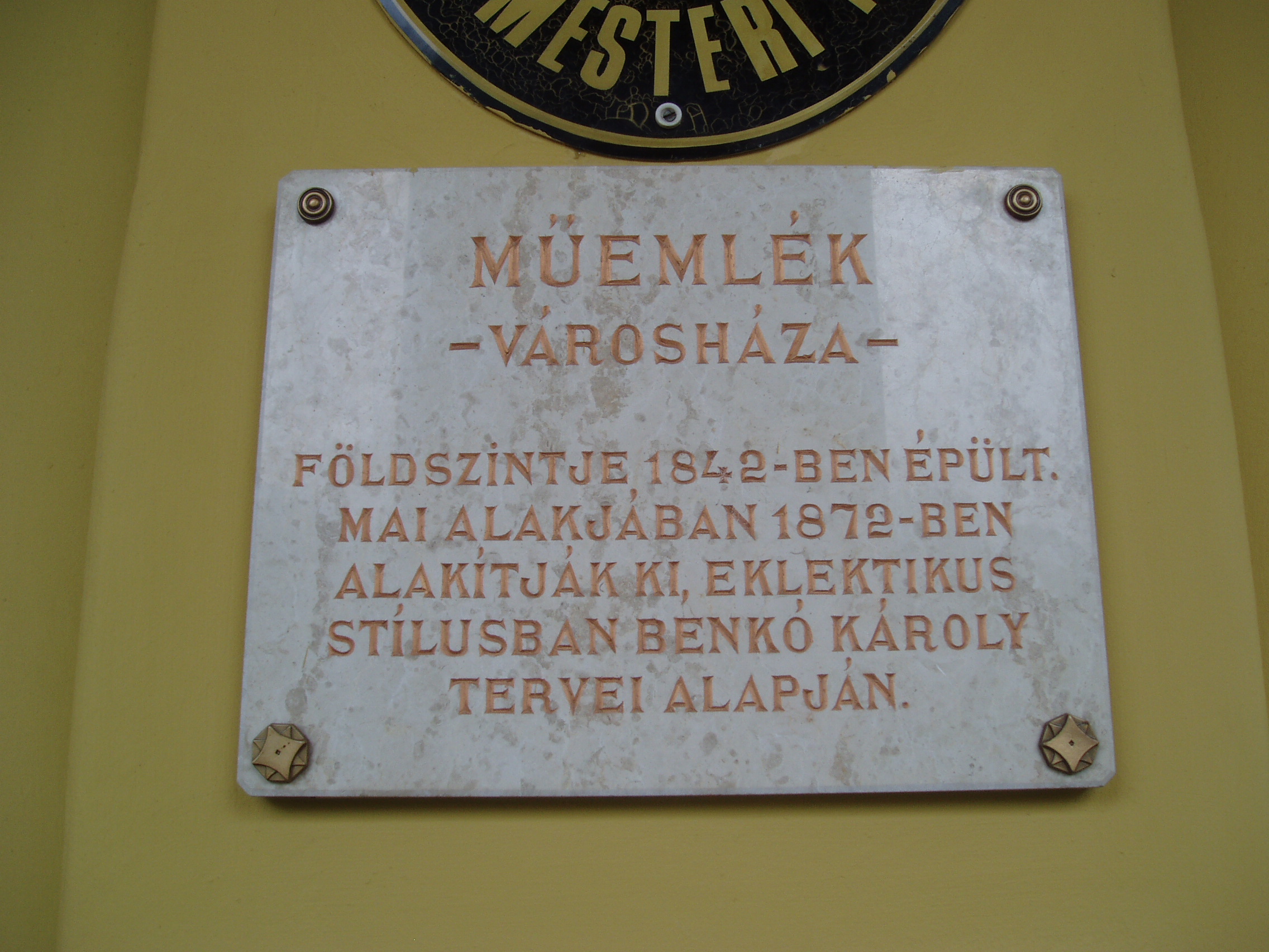 Nyilvános 1058 | 1446 | Nyíregyháza, Kossuth tér 1. Városháza | Nyíregyháza központi terének nyugati oldalát foglalja el a Városháza. Az eklektikus stílusú, reneszánsz hangulatú, árkádos bejáratú épületet Benkó Károly tervezte az eredetileg itt álló ún. Báthori-ház földszintjének felhasználásával. Mai alakjában 1872-ben alakult ki. A későbbiekben még több épületrésszel bővítették. 1876-tól 1892-ig, a megyeháza (lásd: Hősök tere 5.) felépüléséig a megyei közigazgatás központja is itt működött. Az épületen több emléktábla is tanúskodik a város és a városháza múltjáról. Felh. irod.: Látnivalók Szabolcs-Szatmár-Bereg megyében. Miskolc, Well-PRess, 1999 A fénykép 2010 augusztus elején készült. |