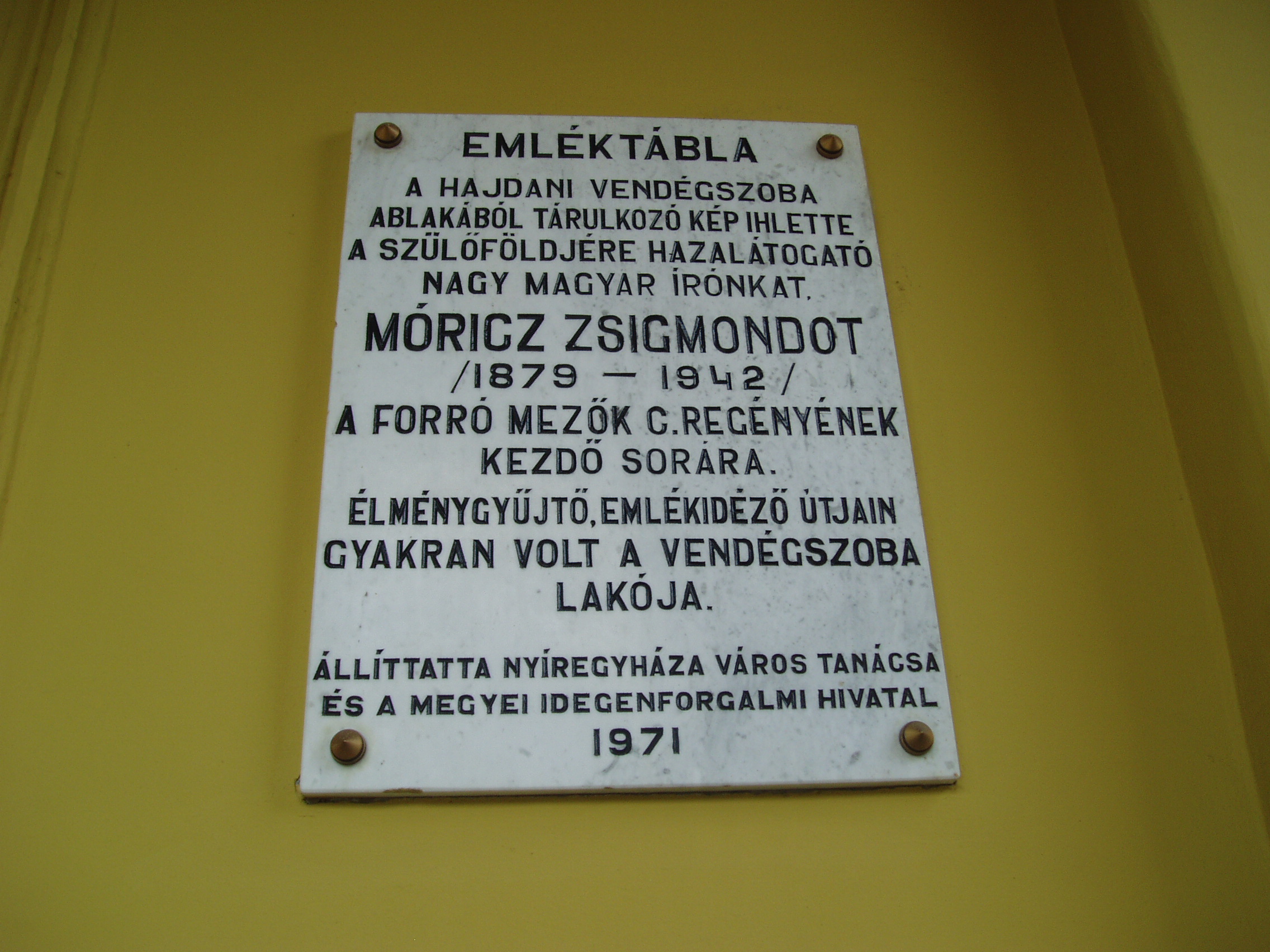 Nyilvános 1065 | 1499 | Nyíregyháza, Kossuth tér 1. Városháza | Nyíregyháza központi terének nyugati oldalát foglalja el a mai alakjában 1872-re felépült Városháza. Az eklektikus stílusú, reneszánsz hangulatú, árkádos bejáratú épületet Benkó Károly tervezte. Az épületen több emléktábla is tanúskodik a város és a városháza múltjáról. Gyakran megfordult a szállodában Móricz Zsigmond. Emléktáblája szerint a hajdani vendégszoba ablakából elébe táruló kép ihlette Forró mezők című regényének kezdetét: "Perzselt a meleg. Még alkonyatkor is. Semmi levegő. A piac olyan volt, mint egy sivatag, a gömbakácok levelei össze voltak zsugorodva s porral fedve. Minden porba volt temetve, az út, a háztetők, az ablakok, az emberek, minden poros volt, még az ég is. A Hungária-hotel nyitott ablakaival tüdővészesen lihegve nézett le a piacra..." Felh. irod.: Látnivalók Szabolcs-Szatmár-Bereg megyében. Miskolc, Well-PRess, 1999 A fénykép 2010 augusztus elején készült. |