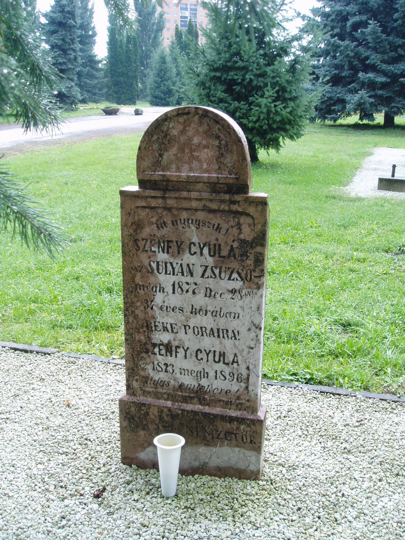 Nyilvános 1081 | 1663 | Nyíregyháza, Pazonyi tér, Északi temető: Szénfy Gyula | A Dózsa György út vezet Nyíregyháza Északi temetőjébe. A ravatalozó és a főbejárat közötti részen találjuk Szénfy Gyula (1823-1896) ügyvéd, tanító, zeneszerző, az 1848/49-es szabadságharc önkéntese sírkövét, amelyet 1990-ben helyeztek ide a megszűnt Déli temetőből. Felh. irod.: Fazekas Árpád - Szekrényes András: Nyíregyháza temetői. Nyíregyháza, 1990 A fénykép 2010 augusztus elején készült |