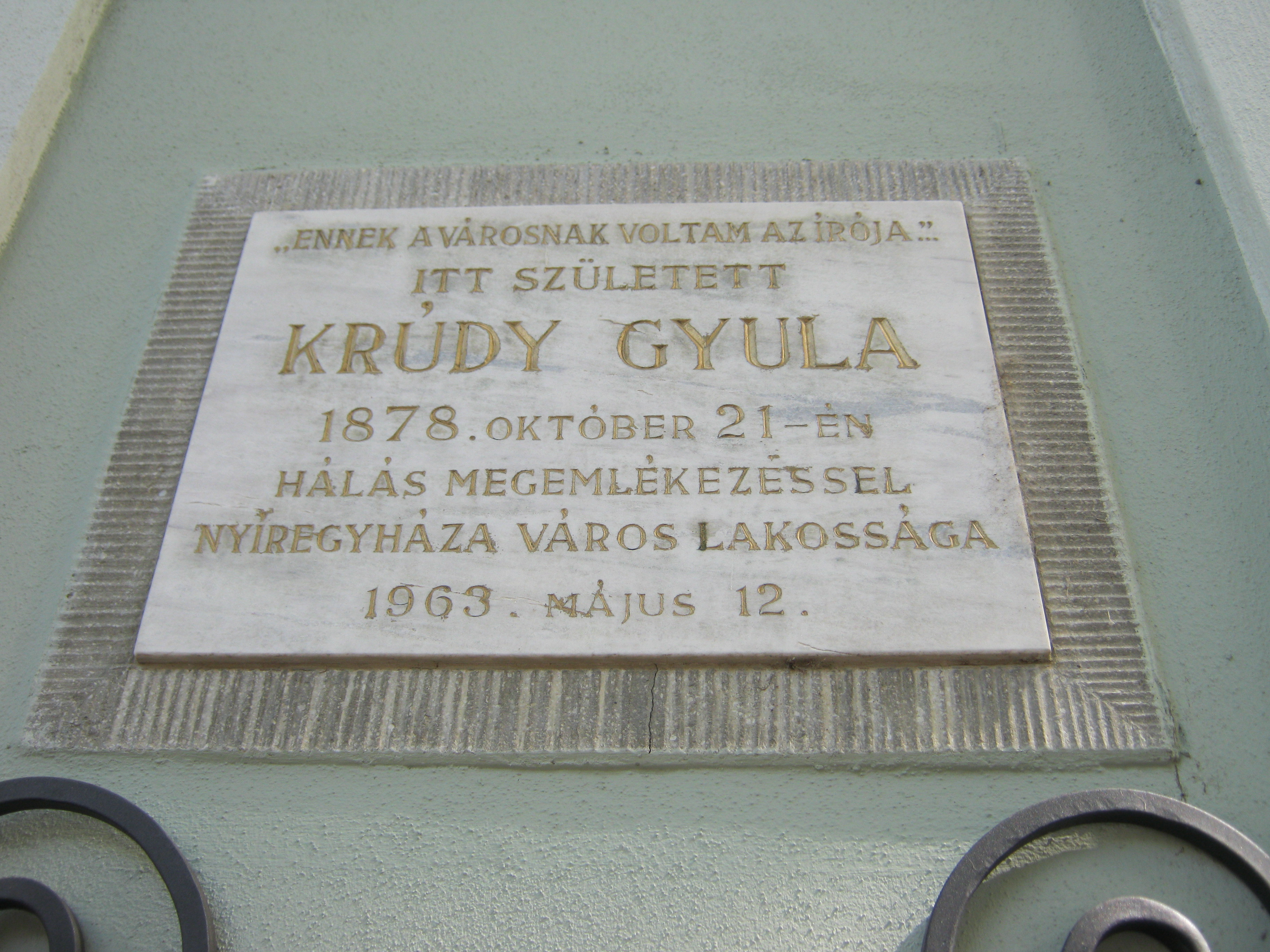 Nyilvános 1074 | 1407 | Nyíregyháza, Szent István utca 8. | 1963-as keltezésű emléktáblája szerint ebben a házban született 1878. október 21-én Krúdy Gyula. A róla szóló irodalomból viszont az böngészhető ki, hogy ez már nem az eredeti épület. Apja, id. Krúdy Gyula ügyvéd volt. Az író törvénytelen gyermekként született: az ügyvéd beleszeretett cselédlányukba, Csákányi Juliannába, és csak a tizedik gyerek születése után házasodtak össze. Krúdy elemi iskolai tanulmányait Nyíregyházán kezdte, majd 1887 őszén a ma Romániában található Szatmárnémetibe került, ott lett kisgimnazista. Gimnáziumi tanulmányait Podolinban folytatta. Hazatérve, 1891-’95 között az evangélikus gimnáziumban tanult. A Kossuth Gimnázium falán emléktábla örökíti meg, hogy ott érettségizett (lásd: Nyíregyháza, Szent István utca 19.). A közelmúltban még létezett emlékszobája a Jósa András Múzeumban (lásd: Nyíregyháza, Benczúr tér 21.), 2010-ben Nyíregyházán járva azonban már nem találtam. Van viszont egy szép emlékműve a városban (lásd: Nyíregyháza, Bessenyei tér). Felh. irod.: Látnivalók Szabolcs-Szatmár-Bereg megyében. Miskolc, Well-PRess, 1990 Szabó Ede: Krúdy Gyula. Bp. Szépirodalmi Kiadó, 1970 Fráter Zoltán: Krúdy Gyula. Bp., Elektra Kiadóház, 2003 A fénykép 2010 augusztus elején készült |