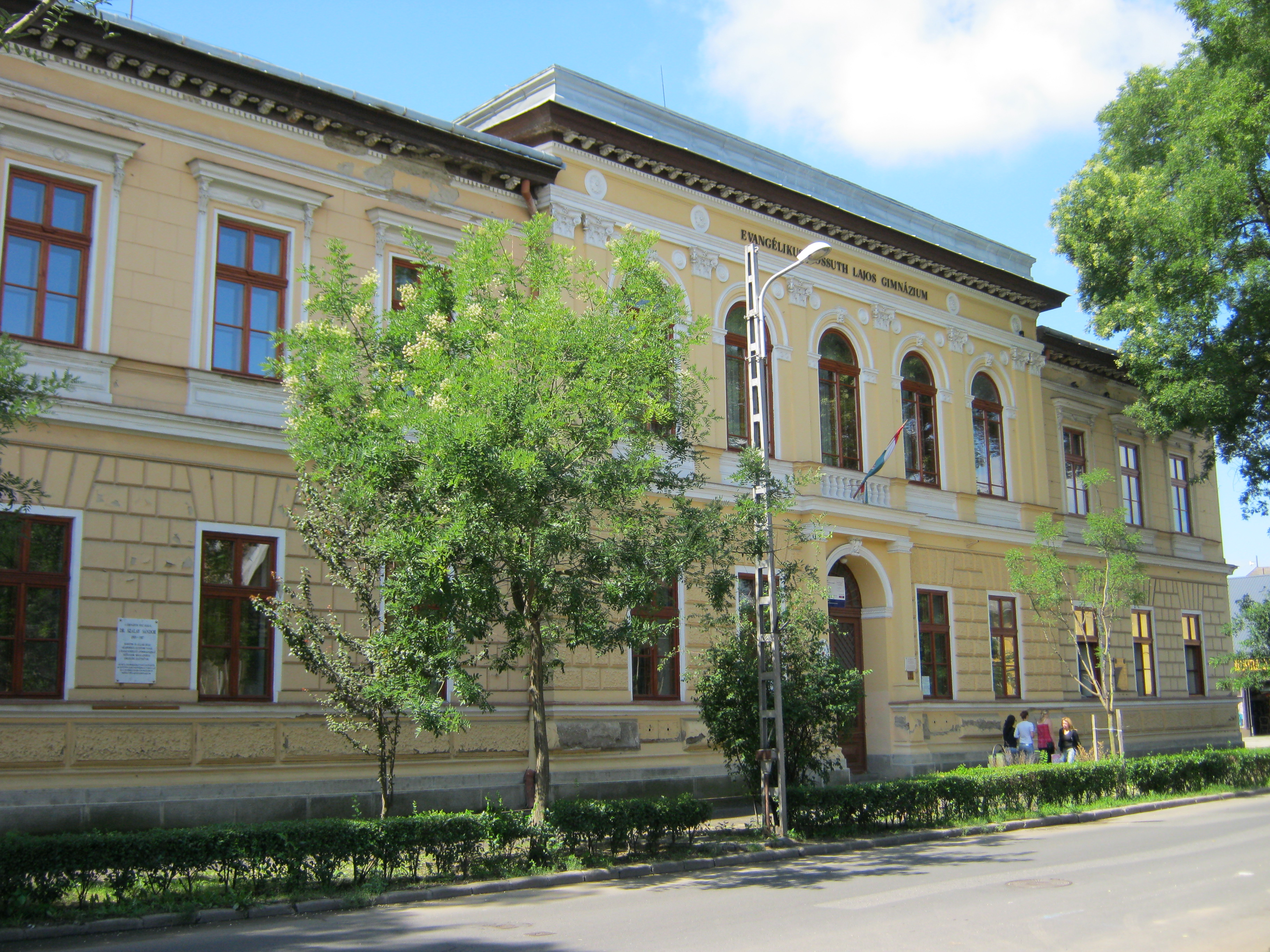 Nyilvános 1032 | 1426 | Nyíregyháza, Szent István utca 19. Evangélikus Kossuth Lajos Gimnázium | A megye legrégibb középiskolája. 1808-ban alapították mint evangélikus professzori iskolát (lásd: Nyíregyháza, Luther utca 5.). Nyolc osztályos gimnáziummá 1888-ra fejlesztették fel. Mai épületét ekkoriban, 1887-ben emelték Bobula János tervei szerint. Kossuth Lajos nevét 1921-ben vette fel. Az 1948-ban államosított iskolát 1992-ben kapta vissza az evangélikus egyház. Homlokzatán számos márványtábla emlékezik kiváló diákjaira, tanáraira. Felh. irod.: www.eklg.hu A fénykép 2010 augusztus elején készült |
