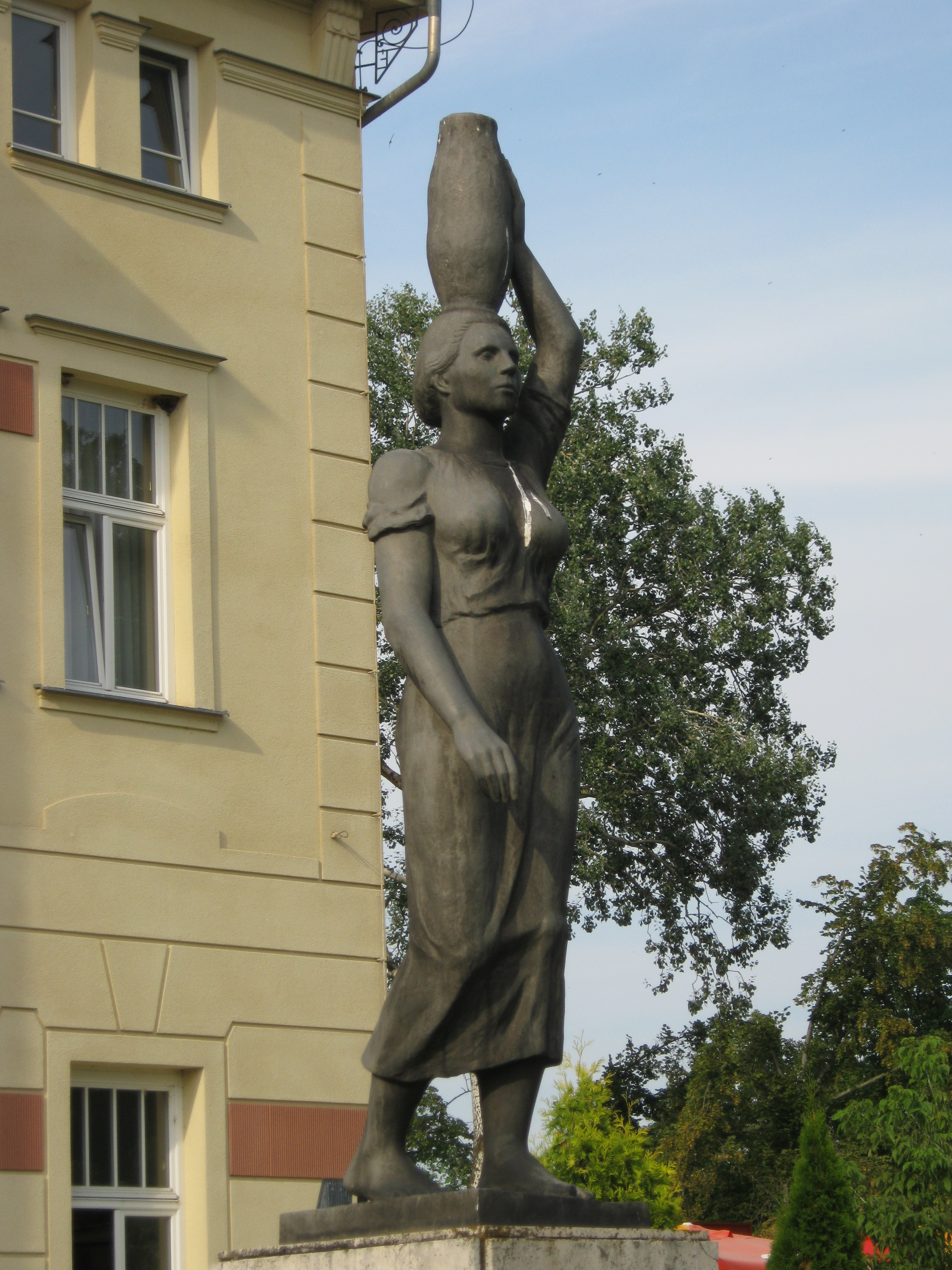 Nyilvános 1033 | 1526 | Nyíregyháza-Sóstó, Krúdy-Vigadó előtt: Korsóvivő | Nyíregyháza-Sóstó első köztéri szobra, Halmágyi István: Koesósvivő című alkotása (1940) a Krúdy Vigadó előtt áll. Felh. irod.: www.szoborlap,hu A fénykép 2010 augusztus elején készült |