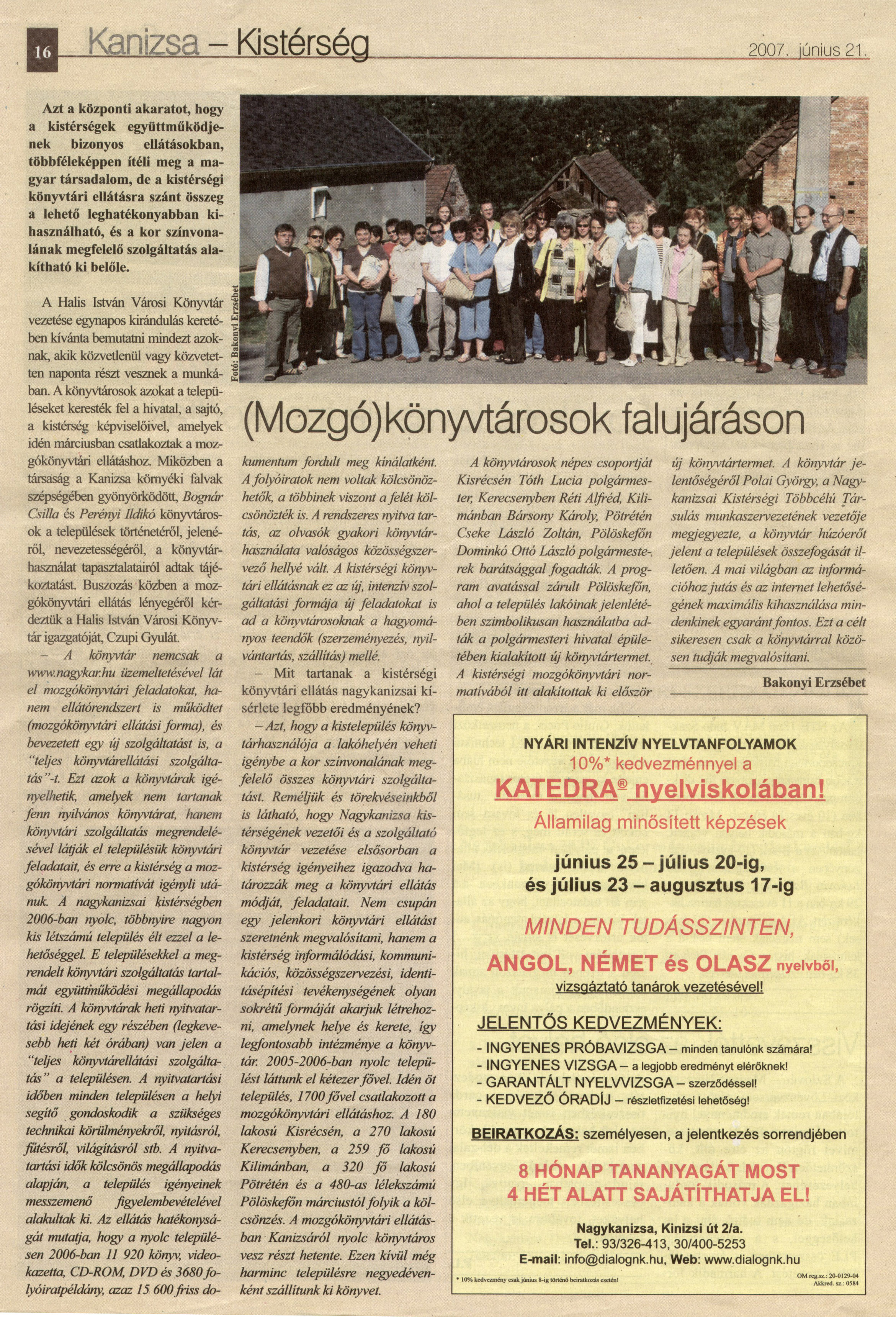 Nyilvános 2589 | 5331 | Kanizsa 2007 06 21 025sz 16old | (Mozgó)könyvtárosok falujáráson Kanizsa - Kistérség 2007. június 21. Azt a központi akaratot, hogy a kistérségek együttműködjenek bizonyos ellátásokban, többféleképpen ítéli meg a magyar társadalom, de a kistérségi könyvtári ellátásra szánt összeg a lehető leghatékonyabban kihasználható, és a kor színvonalának megfelelő szolgáltatás alakítható ki belőle. A Halis István Városi Könyvtár vezetése egynapos kirándulás keretében kívánta bemutatni mindezt azoknak, akik közvetlenül vagy közvetetten naponta részt vesznek a munkában. A könyvtárosok azokat a településeket keresték fel a hivatal, a sajtó, a kistérség képviselőivel, amelyek idén márciusban csatlakoztak a mozgókönyvtári ellátáshoz. Miközben a társaság a Kanizsa környéki falvak szépségében gyönyörködött, Bognár Csilla és Perényi Ildikó könyvtárosok a települések történetéről, jelenéről, nevezetességéről, a könyvtárhasználat tapasztalatairól adtak tájékoztatást. Buszozás közben a mozgókönyvtári ellátás lényegéről kérdeztük a Halis István Városi Könyvtár igazgatóját, Czupi Gyulát. – A könyvtár nemcsak a www.nagykar.hu üzemeltetésével lát el mozgókönyvtári feladatokat, hanem ellátórendszert is működtet (mozgókönyvtári ellátási forma), és bevezetett egy új szolgáltatást is, a „teljes könyvtárellátási szolgáltatás”-t. Ezt azok a könyvtárak igényelhetik, amelyek nem tartanak fenn nyilvános könyvtárat, hanem könyvtári szolgáltatás megrendelésével látják el településük könyvtári feladatait, és erre a kistérség a mozgókönyvtári normatívát igényli utánuk. A nagykanizsai kistérségben 2006-ban nyolc, többnyire nagyon kis létszámú település élt ezzel a lehetőséggel. E településekkel a megrendelt könyvtári szolgáltatás tartalmát együttműködési megállapodás rögzíti. A könyvtárak heti nyitvatartási idejének egy részében (legkevesebb heti két órában) van jelen a „teljes könyvtárellátási szolgáltatás” a településen. A nyitvatartási időben minden településen a helyi segítő gondoskodik a szükséges technikai körülményekről, nyitásról, fűtésről, világításról stb. A nyitvatartási idők kölcsönös megállapodás alapján, a település igényeinek messzemenő figyelembevételével alakultak ki. Az ellátás hatékonyságát mutatja, hogy a nyolc településen 2006-ban 11 920 könyv, videokazetta, CD-ROM, DVD és 3680 folyóiratpéldány, azaz 15 600 friss dokumentum fordult meg kínálatként. A folyóiratok nem voltak kölcsönözhetők, a többinek viszont a felét kölcsönözték is. A rendszeres nyitva tartás, az olvasók gyakori könyvtárhasználata valóságos közösségszervező hellyé vált. A kistérségi könyvtári ellátásnak ez az új, intenzív szolgáltatási formája új feladatokat is ad a könyvtárosoknak a hagyományos teendők (szerzeményezés, nyilvántartás, szállítás) mellé. – Mit tartanak a kistérségi könyvtári ellátás nagykanizsai kísérlete legfőbb eredményének? – Azt, hogy a kistelepülés könyvtárhasználója a lakóhelyén veheti igénybe a kor színvonalának megfelelő összes könyvtári szolgáltatást. Reméljük és törekvéseinkből is látható, hogy Nagykanizsa kistérségének vezetői és a szolgáltató könyvtár vezetése elsősorban a kistérség igényeihez igazodva határozzák meg a könyvtári ellátás módját, feladatait. Nem csupán egy jelenkori könyvtári ellátást szeretnénk megvalósítani, hanem a kistérség informálódási, kommunikációs, közösségszervezési, identitásépítési tevékenységének olyan sokrétű formáját akarjuk létrehozni, amelynek helye és kerete, így legfontosabb intézménye a könyvtár. 2005-2006-ban nyolc települést láttunk el kétezer fővel. Idén öt település, 1700 fővel csatlakozott a mozgókönyvtári ellátáshoz. A 180 lakosú Kisrécsén, a 270 lakosú Kerecsenyben, a 259 fő lakosú Kilimánban, a 320 fő lakosú Pötrétén és a 480-as lélekszámú Pölöskefőn márciustól folyik a kölcsönzés. A mozgókönyvtári ellátásban Kanizsáról nyolc könyvtáros vesz részt hetente. Ezen kívül még harminc településre negyedévenként szállítunk ki könyvet. A könyvtárosok népes csoportját Kisrécsén Tóth Lucia polgármester, Kerecsenyben Réti Alfréd, Kilimánban Bársony Károly, Pötrétén Cseke László Zoltán, Pölöskefőn Dominkó Ottó László polgármesterek barátsággal fogadták. A program avatással zárult Pölöskefőn, ahol a település lakóinak jelenlétében szimbolikusan használatba adták a polgármesteri hivatal épületében kialakított új könyvtártermet. A kistérségi mozgókönyvtári normatívából itt alakítottak ki először új könyvtártermet. A könyvtár jelentőségéről Polai György, a Nagykanizsai Kistérségi Többcélú Társulás munkaszervezetének vezetője megjegyezte, a könyvtár húzóerőt jelent a települések összefogását illetően. A mai világban az információhoz jutás és az internet lehetőségének maximális kihasználása mindenkinek egyaránt fontos. Ezt a célt sikeresen csak a könyvtárral közösen tudják megvalósítani. Bakonyi Erzsébet |