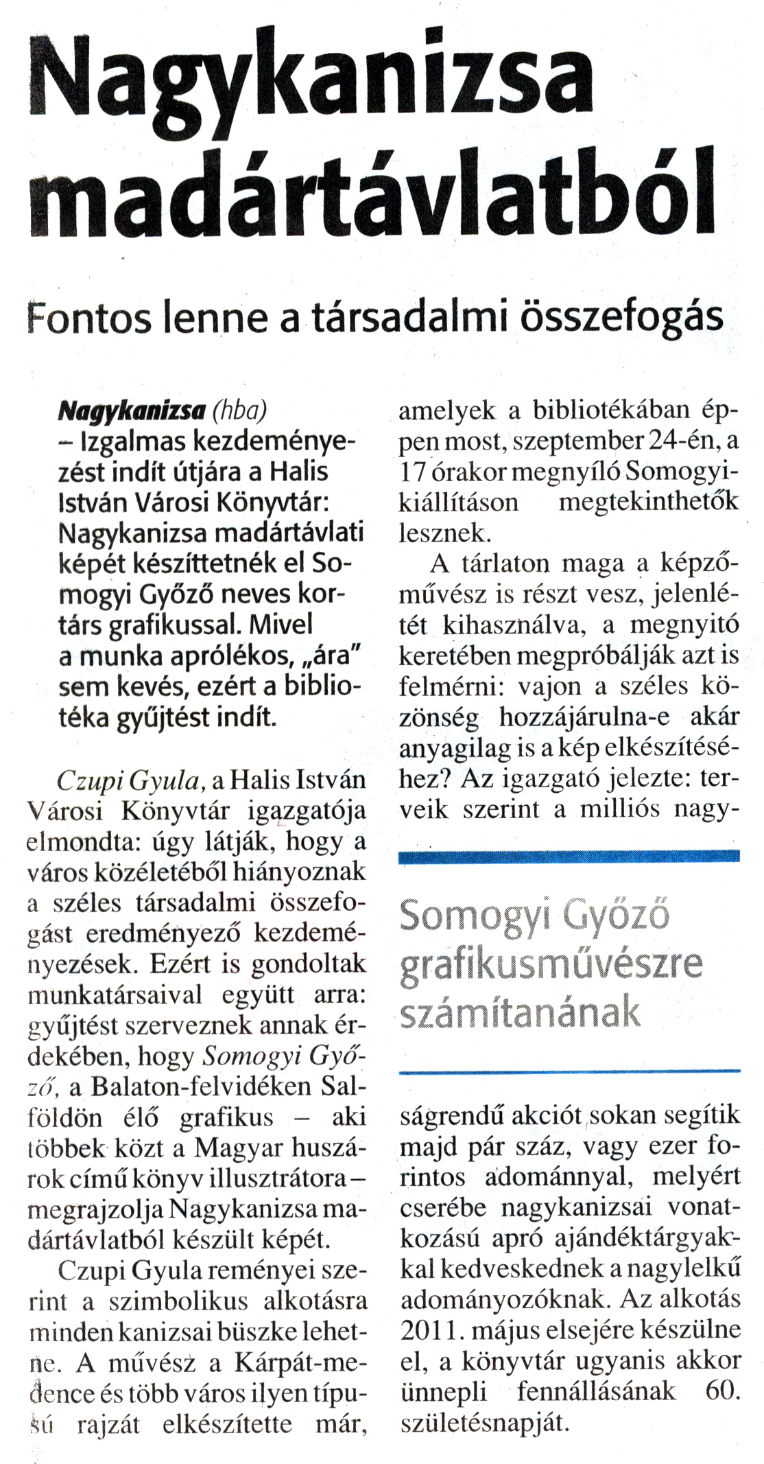 Nyilvános 1508 | 1757 | Zalai Hírlap 2009. szeptember 15. 216. szám 7. oldal - Nagykanizsa madártávlatból | A cikk szövege: Nagykanizsa madártávlatból Fontos lenne a társadalmi összefogás Somogyi Győző grafikusművészre számítanának Nagykanizsa (hba) - Izgalmas kezdeményezést indít útjára a Halis István Városi Könyvtár: Nagykanizsa madártávlati képét készíttetnék el Somogyi Győző neves kortárs grafikussal. Mivel a munka aprólékos, „ára" sem kevés, ezért a bibliotéka gyűjtést indít. Czupi Gyula, a Halis István Városi Könyvtár igazgatója elmondta: úgy látják, hogy a város közéletéből hiányoznak a széles társadalmi összefogást eredményező kezdeményezések. Ezért is gondoltak munkatársaival együtt arra: gyűjtést szerveznek annak érdekében, hogy Somogyi Győző, a Balaton-felvidéken Salföldön élő grafikus - aki többek közt a Magyar huszárok című könyv illusztrátora - megrajzolja Nagykanizsa madártávlatból készült képét. Czupi Gyula reményei szerint a szimbolikus alkotásra minden kanizsai büszke lehetne. A művész a Kárpát-medence és több város ilyen típusú rajzát elkészítette már, amelyek a bibliotékában éppen most, szeptember 24-én, a 17 órakor megnyíló Somogyikiállításon megtekinthetők lesznek. A tárlaton maga a képzőművész is részt vesz, jelenlétét kihasználva, a megnyitó keretében megpróbálják azt is felmérni: vajon a széles közönség hozzájárulna-e akár anyagilag is a kép elkészítéséhez? Az igazgató jelezte: terveik szerint a milliós nagyságrendű akciót sokan segítik majd pár száz, vagy ezer forintos adománnyal, melyért cserébe nagykanizsai vonatkozású apró ajándéktárgyakkal kedveskednek a nagylelkű adományozóknak. Az alkotás 2011. május elsejére készülne el, a könyvtár ugyanis akkor ünnepli fennállásának 60. születésnapját. |