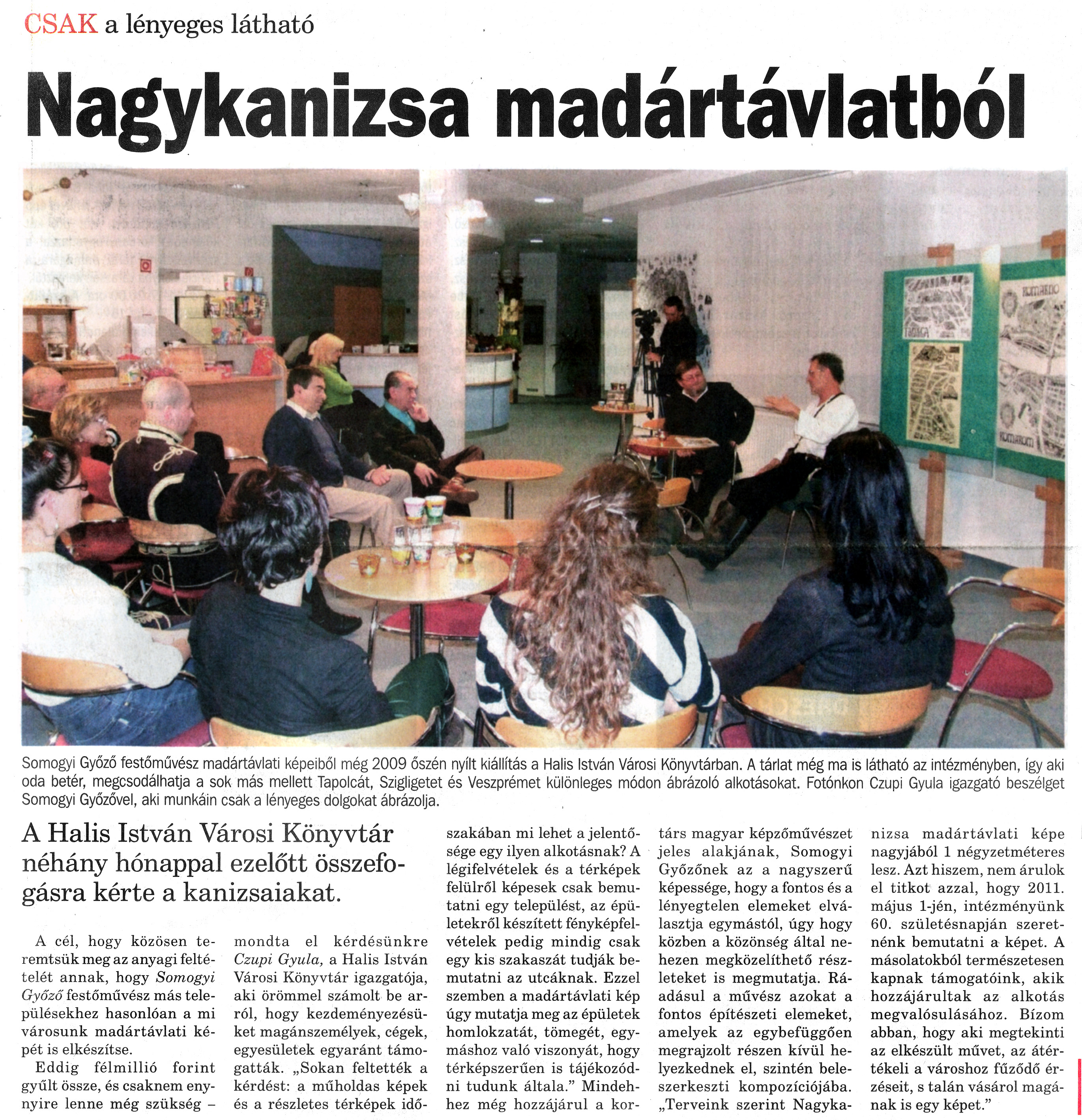 Nyilvános 1131 | 1876 | Nagykanizsai Maraton 2010. március 5. 9. szám 1. oldal - Nagykanizsa madártávlatból | A cikk szövege: CSAK a lényeges látható Nagykanizsa madártávlatból Somogyi Győző festőművész madártávlati képeiből még 2009 őszén nyílt kiállítás a Halis István Városi Könyvtárban. A tárlat még ma is látható az intézményben, így aki oda betér, megcsodálhatja a sok más mellett Tapolcát, Szigligetet és Veszprémet különleges módon ábrázoló alkotásokat. Fotónkon Czupi Gyula igazgató beszélget Somogyi Győzővel, aki munkáin csak a lényeges dolgokat ábrázolja. A Halis István Városi Könyvtár néhány hónappal ezelőtt összefogásra kérte a kanizsaiakat. A cél, hogy közösen teremtsük meg az anyagi feltételét annak, hogy Somogyi Győző festőművész más településekhez hasonlóan a mi városunk madártávlati képét is elkészítse. Eddig félmillió forint gyűlt össze, és csaknem ennyire lenne még szükség - mondta el kérdésünkre Czupi Gyula, a Halis István Városi Könyvtár igazgatója, aki örömmel számolt be arról, hogy kezdeményezésüket magánszemélyek, cégek, egyesületek egyaránt támogatták. „Sokan feltették a kérdést: a műholdas képek és a részletes térképek időszakában mi lehet a jelentősége egy ilyen alkotásnak? A légifelvételek és a térképek felülről képesek csak bemutatni egy települést, az épületekről készített fényképfelvételek pedig mindig csak egy kis szakaszát tudják bemutatni az utcáknak. Ezzel szemben a madártávlati kép úgy mutatja meg az épületek homlokzatát, tömegét, egymáshoz való viszonyát, hogy térképszerűen is tájékozódni tudunk általa." Mindehhez még hozzájárul a kortárs magyar képzőművészet jeles alakjának, Somogyi Győzőnek az a nagyszerű képessége, hogy a fontos és a lényegtelen elemeket elválasztja egymástól, úgy hogy közben a közönség által nehezen megközelíthető részleteket is megmutatja. Ráadásul a művész azokat a fontos építészeti elemeket, amelyek az egybefüggően megrajzolt részen kívül helyezkednek el, szintén beleszerkeszti kompozíciójába. „Terveink szerint Nagykanizsa madártávlati képe nagyjából 1 négyzetméteres lesz. Azt hiszem, nem árulok el titkot azzal, hogy 2011. május 1-jén, intézményünk 60. születésnapján szeretnénk bemutatni a képet. A másolatokból természetesen kapnak támogatóink, akik hozzájárultak az alkotás megvalósulásához. Bízom abban, hogy aki megtekinti az elkészült művet, az átértékeli a városhoz fűződő érzéseit, s talán vásárol magának is egy képet." |