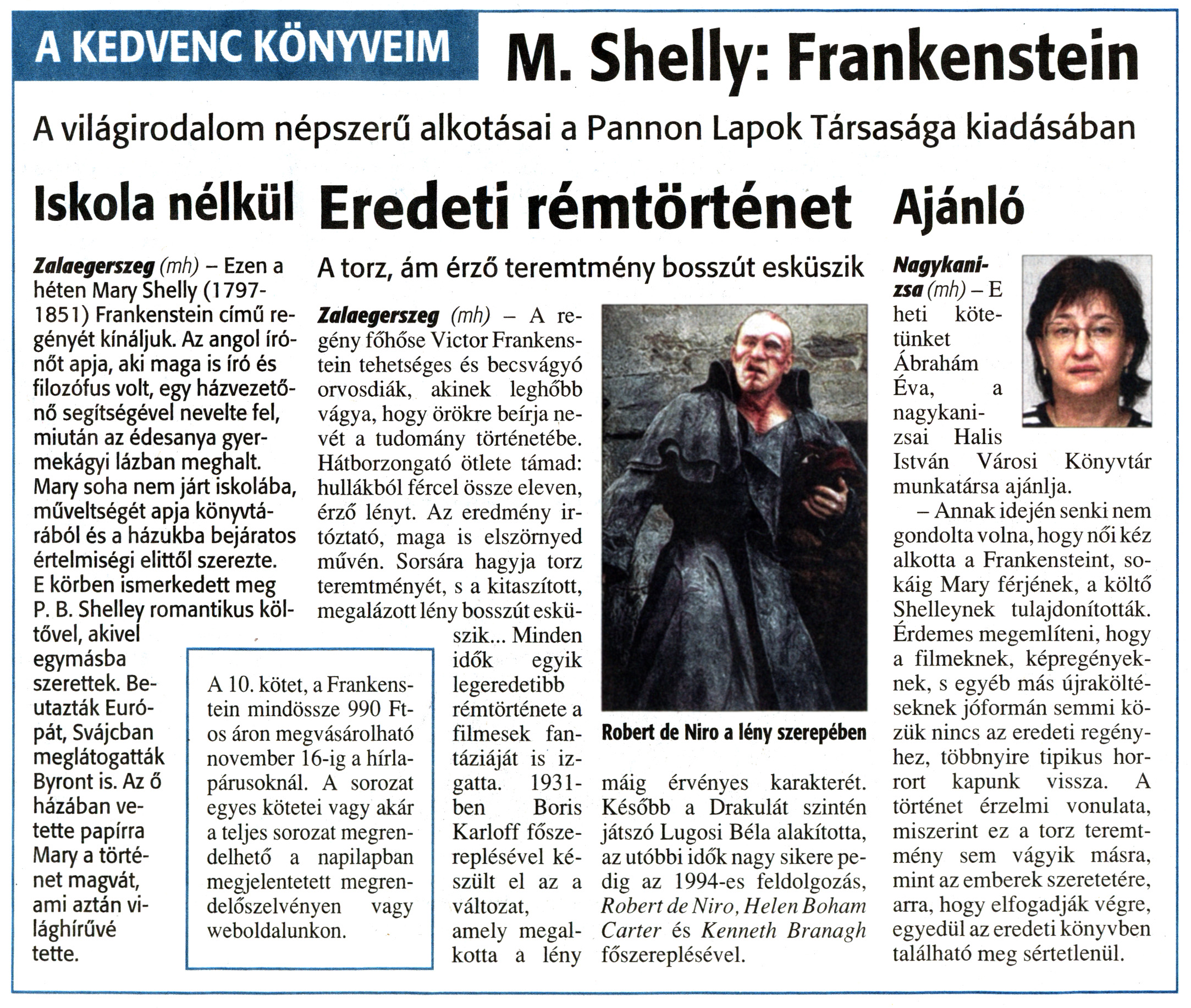 Nyilvános 1109 | 1315 | Zalai Hírlap 2010. november 10. 261. szám 7. oldal - Könyvajánló | A cikk szövege: A KEDVENC KÖNYVEIM M. Shelly: Frankenstein A világirodalom népszerű alkotásai a Pannon Lapok Társasága kiadásában Iskola nélkül Zalaegerszeg (mh) - Ezen a héten Mary Shelly (1797-1851) Frankenstein című regényét kínáljuk. Az angol írónőt apja, aki maga is író és filozófus volt, egy házvezetőnő segítségével nevelte fel, miután az édesanya gyermekágyi lázban meghalt. Mary soha nem járt iskolába, műveltségét apja könyvtárából és a házukba bejáratos értelmiségi elittől szerezte. E körben ismerkedett meg P. B. Shelley romantikus költővel, akivel egymásba szerettek. Beutazták Európát, Svájcban meglátogatták Byront is. Az ő házában vetette papírra Mary a történet magvát, ami aztán világhírűvé tette. Eredeti rémtörténet A torz, ám érző teremtmény bosszút esküszik Zalaegerszeg (mh) - A regény főhőse Victor Frankenstein tehetséges és becsvágyó orvosdiák, akinek leghőbb vágya, hogy örökre beírja nevét a tudomány történetébe. Hátborzongató ötlete támad: hullákból fércei össze eleven, érző lényt. Az eredmény irtóztató, maga is elszörnyed művén. Sorsára hagyja torz teremtményét, s a kitaszított, megalázott lény bosszút esküszik... Minden idők egyik legeredetibb rémtörténete a filmesek fantáziáját is izgatta. 1931-ben Boris Karloff főszereplésével készült el az a változat, amely megalkotta a lény máig érvényes karakterét. Később a Drakulát szintén játszó Lugosi Béla alakította, az utóbbi idők nagy sikere pedig az 1994-es feldolgozás, Robert de Niro, Helen Boham Carter és Kenneth Branagh főszereplésével. A 10. kötet, a Frankenstein mindössze 990 Ft-os áron megvásárolható november 16-ig a hírlapárusoknál. A sorozat egyes kötetei vagy akár a teljes sorozat megrendelhető a napilapban megjelentetett megrendelőszelvényen vagy weboldalunkon. Ajánló Nagykanizsa (mh)-E heti kötetünket Ábrahám Éva, a nagykanizsai Halis István Városi Könyvtár munkatársa ajánlja. - Annak idején senki nem gondolta volna, hogy női kéz alkotta a Frankensteint, sokáig Mary férjének, a költő Shelleynek tulajdonították. Érdemes megemlíteni, hogy a filmeknek, képregényeknek, s egyéb más újraköltéseknek jóformán semmi közük nincs az eredeti regényhez, többnyire tipikus horrort kapunk vissza. A történet érzelmi vonulata, miszerint ez a torz teremtmény sem vágyik másra, mint az emberek szeretetére, arra, hogy elfogadják végre, egyedül az eredeti könyvben található meg sértetlenül. |