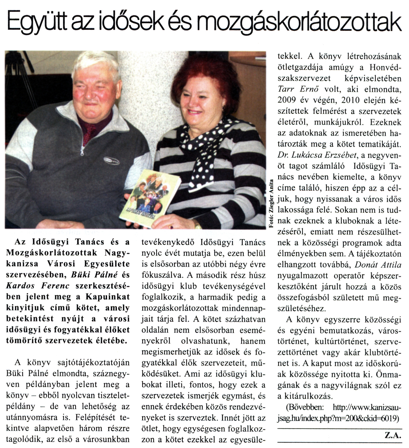 Nyilvános 2913 | 8343 | Kanizsa 2011. január 20. 2. szám 5. oldal - Együtt az idősek és mozgáskorlátozottak | A cikk szövege: Együtt az idősek és mozgáskorlátozottak Az Idősügyi Tanács és a Mozgáskorlátozottak Nagykanizsa Városi Egyesülete szervezésében, Büki Pálné és Kardos Ferenc szerkesztésében jelent meg a Kapuinkat kinyitjuk című kötet, amely betekintést nyújt a városi idősügyi és fogyatékkal élőket tömörítő szervezetek életébe. A könyv sajtótájékoztatóján Büki Pálné elmondta, száznegyven példányban jelent meg a könyv - ebből nyolcvan tiszteletpéldány - de van lehetőség az utánnyomásra is. Felépítését tekintve alapvetően három részre tagolódik, az első a városunkban tevékenykedő Idősügyi Tanács nyolc évét mutatja be, ezen belül is elsősorban az utóbbi négy évre fókuszálva. A második rész húsz idősügyi klub tevékenységével foglalkozik, a harmadik pedig a mozgáskorlátozottak mindennapjait tárja fel. A kötet százhatvan oldalán nem elsősorban eseményekről olvashatunk, hanem megismerhetjük az idősek és fogyatékkal élők szervezeteit, működésüket. Ami az idősügyi klubokat illeti, fontos, hogy ezek a szervezetek ismerjék egymást, és ennek érdekében közös rendezvényeket is szerveztek. Innét jött az ötlet, hogy egységesen foglalkozzon a kötet ezekkel az egyesületekkel. A könyv létrehozásának ötletgazdája amúgy a Honvédszakszervezet képviseletében Tarr Ernő volt, aki elmondta, 2009 év végén, 2010 elején készítettek felmérést a szervezetek életéről, munkájukról. Ezeknek az adatoknak az ismeretében határozták meg a kötet tematikáját. Dr. Lukácsa Erzsébet, a negyvenöt tagot számláló Idősügyi Tanács nevében kiemelte, a könyv címe találó, hiszen épp az a céljuk, hogy nyissanak a város idős lakossága felé. Sokan nem is tudnak ezeknek a kluboknak a létezéséről, emiatt nem részesülhetnek a közösségi programok adta élményekben sem. A tájékoztatón elhangzott továbbá, Donát Attila nyugalmazott operatőr képszerkesztőként járult hozzá a közös összefogásból született mű megszületéséhez. A könyv egyszerre közösségi és egyéni bemutatkozás, várostörténet, kultúrtörténet, szervezettörténet vagy akár klubtörténet is. A kaput most az időskorúak közössége nyitotta ki. Önmagának és a nagyvilágnak szól ez a kitárulkozás. (Bővebben: http://www.kanizsaujsag.hu/index.php?m=200&ckid=6019) Z.A. Fotó: Ziegler Anita |