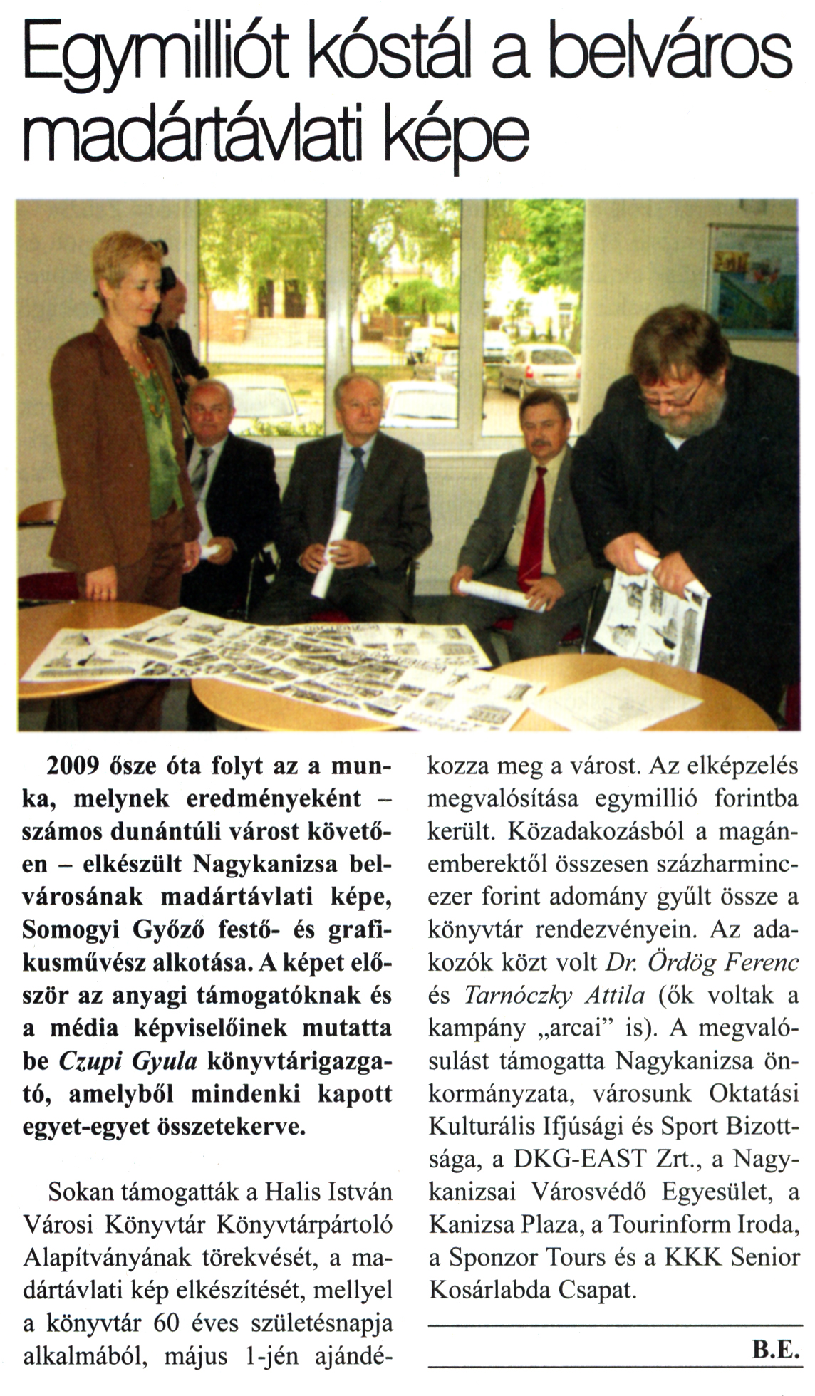 Nyilvános 2958 | 8754 | Kanizsa 2011. április 28. 16. szám 5. oldal - Egymilliót kóstál a belváros madártávlati képe | A cikk szövege: Egymilliót kóstál a belváros madártávlati képe 2009 ősze óta folyt az a munka, melynek eredményeként -számos dunántúli várost követően - elkészült Nagykanizsa belvárosának madártávlati képe, Somogyi Győző festő- és grafikusművész alkotása. A képet először az anyagi támogatóknak és a média képviselőinek mutatta be Czupi Gyula könyvtárigazgató, amelyből mindenki kapott egyet-egyet összetekerve. Sokan támogatták a Halis István Városi Könyvtár Könyvtárpártoló Alapítványának törekvését, a madártávlati kép elkészítését, mellyel a könyvtár 60 éves születésnapja alkalmából, május l-jén ajándékozza meg a várost. Az elképzelés megvalósítása egymillió forintba került. Közadakozásból a magánemberektől összesen százharmincezer forint adomány gyűlt össze a könyvtár rendezvényein. Az adakozók közt volt Dr. Ördög Ferenc és Tarnóczky Attila (ők voltak a kampány „arcai" is). A megvalósulást támogatta Nagykanizsa önkormányzata, városunk Oktatási Kulturális Ifjúsági és Sport Bizottsága, a DKG-EAST Zrt, a Nagykanizsai Városvédő Egyesület, a Kanizsa Plaza, a Tourinform Iroda, a Sponzor Tours és a KKK Senior Kosárlabda Csapat. B.E. |