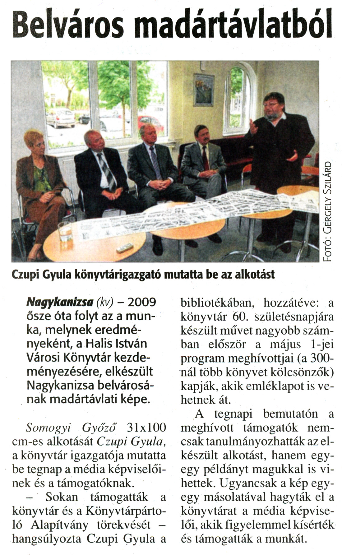 Nyilvános 1759 | 4770 | Zalai Hírlap 2011. április 27. 97. szám 4. oldal - Belváros madártávlatból | A cikk szövege: Belváros madártávlatból Czupi Gyula könyvtárigazgató mutatta be az alkotást Nagykanizsa (kv) - 2009 ősze óta folyt az a munka, melynek eredményeként, a Halis István Városi Könyvtár kezdeményezésére, elkészült Nagykanizsa belvárosának madártávlati képe. Somogyi Győző 31x100 cm-es alkotását Czupi Gyula, a könyvtár igazgatója mutatta be tegnap a média képviselőinek és a támogatóknak. - Sokan támogatták a könyvtár és a Könyvtárpártoló Alapítvány törekvését - hangsúlyozta Czupi Gyula a bibliotékában, hozzátéve: a könyvtár 60. születésnapjára készült művet nagyobb számban először a május 1-jei program meghívottjai (a 300-nál több könyvet kölcsönzők) kapják, akik emléklapot is vehetnek át. A tegnapi bemutatón a meghívott támogatók nemcsak tanulmányozhatták az elkészült alkotást, hanem egy-egy példányt magukkal is vihettek. Ugyancsak a kép egy-egy másolatával hagyták el a könyvtárat a média képviselői, akik figyelemmel kísérték és támogatták a munkát. Fotó: Gergely Szilárd |