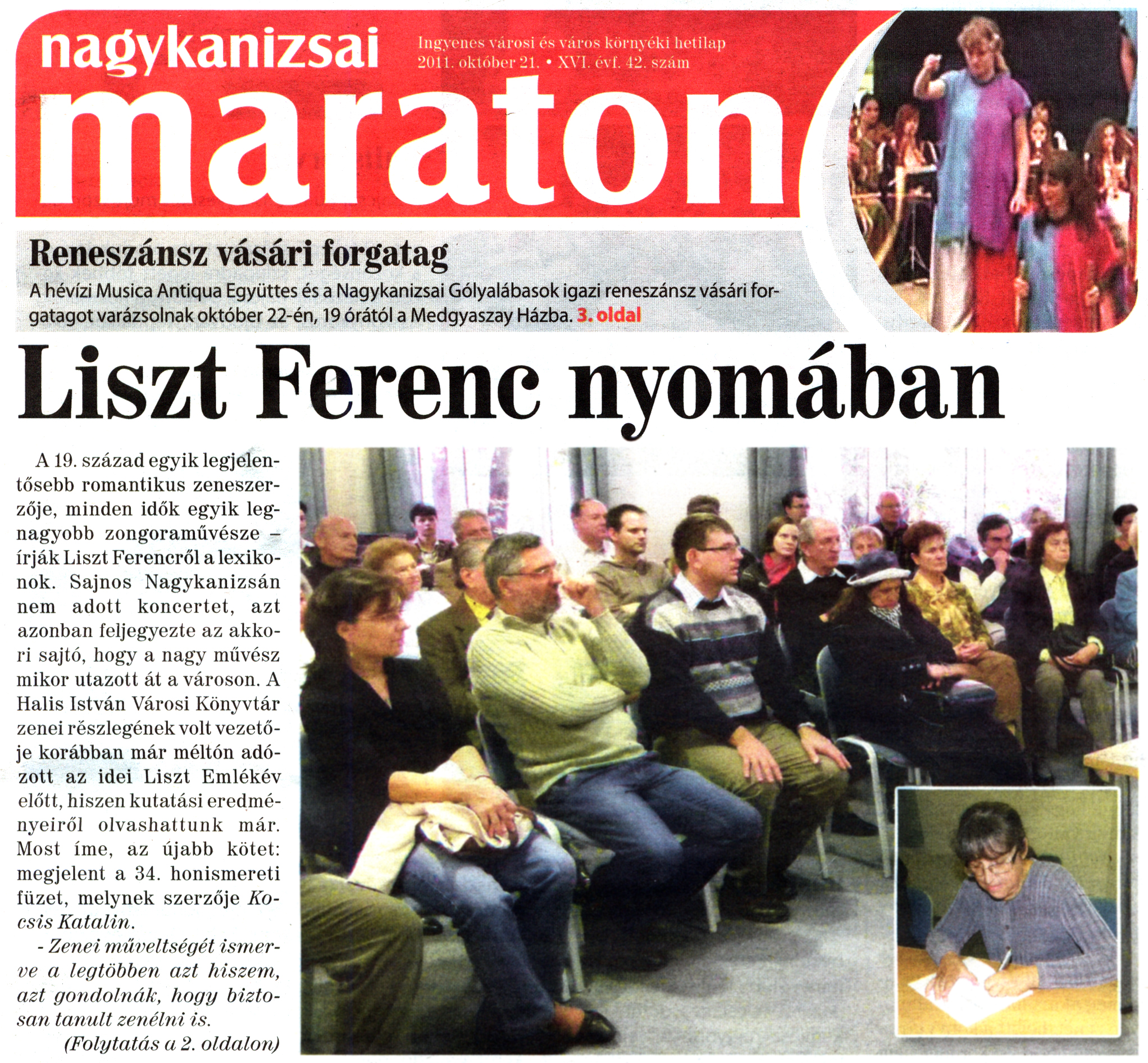Nyilvános 2573 | 7734 | Nagykanizsai Maraton 2011. október 21. 42. szám 1. oldal - Liszt Ferenc nyomában | A cikk szövege: Liszt Ferenc nyomában A19. század egyik legjelentősebb romantikus zeneszerzője, minden idők egyik legnagyobb zongoraművésze -írják Liszt Ferencről a lexikonok. Sajnos Nagykanizsán nem adott koncertet, azt azonban feljegyezte az akkori sajtó, hogy a nagy művész mikor utazott át a városon. A Halis István Városi Könyvtár zenei részlegének volt vezetője korábban már méltón adózott az idei Liszt Emlékév előtt, hiszen kutatási eredményeiről olvashattunk már. Most íme, az újabb kötet: megjelent a 34. honismereti füzet, melynek szerzője Kocsis Katalin. - Zenei műveltségét ismerve a legtöbben azt hiszem, azt gondolnák, hogy biztosan tanult zenélni is. (Folytatás a 2. oldalon) |