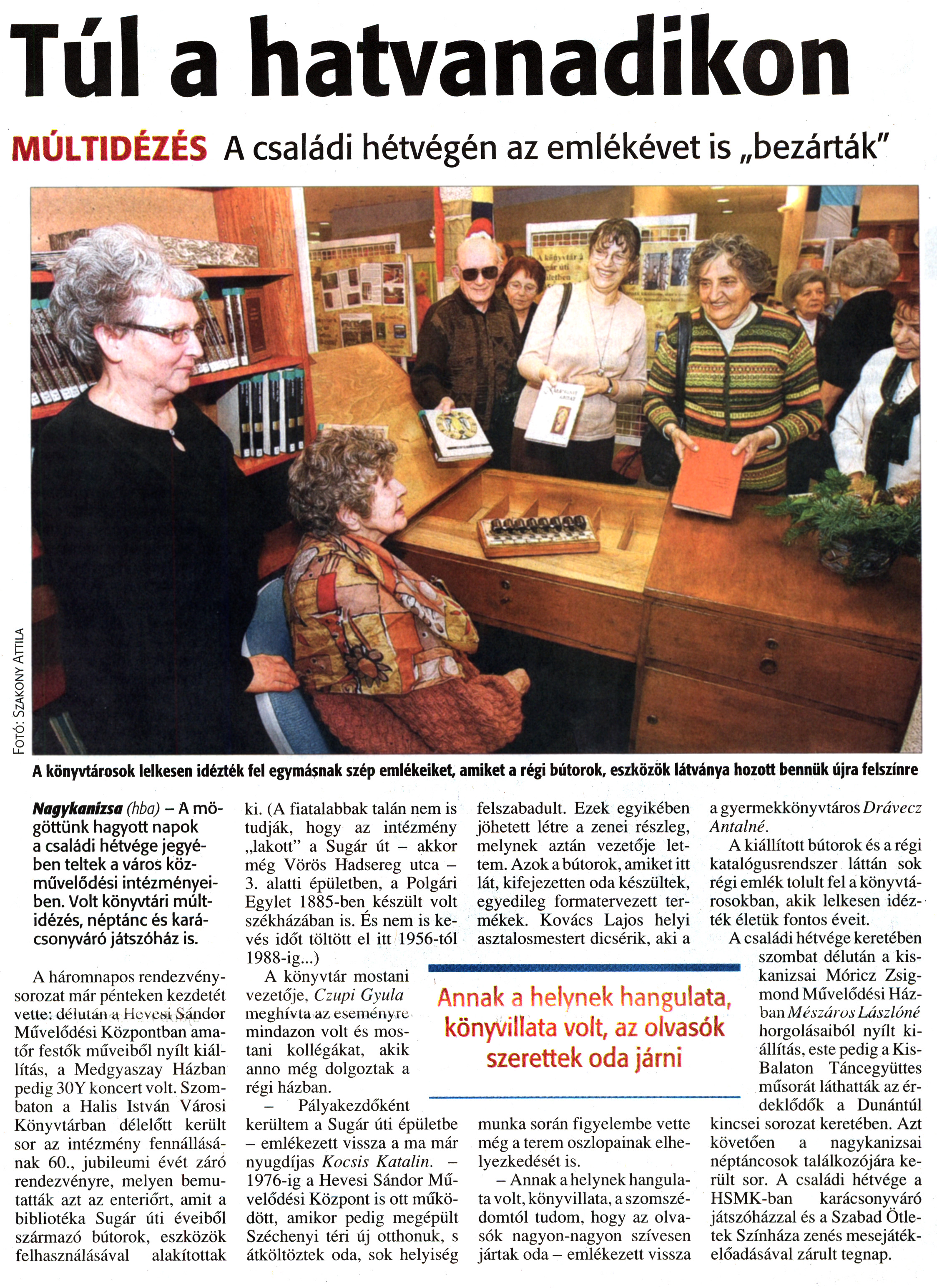 Nyilvános 1833 | 4405 | Zalai Hírlap 2011. december 12. 290. szám 11. oldal - Túl a hatvanadikon | Túl a hatvanadikon MÚLTIDÉZÉS A családi hétvégén az emlékévet is „bezárták" A könyvtárosok lelkesen idézték fel egymásnak szép emlékeiket, amiket a régi bútorok, eszközök látványa hozott bennük újra felszínre Nagykanizsa (hba) - A mögöttünk hagyott napok a családi hétvége jegyében teltek a város közművelődési intézményeiben. Volt könyvtári múltidézés, néptánc és karácsonyváró játszóház is. A háromnapos rendezvénysorozat már pénteken kezdetét vette: délután a Hevesi Sándor Művelődési Központban amatőr festők műveiből nyílt kiállítás, a Medgyaszay Házban pedig 30Y koncert volt. Szombaton a Halis István Városi Könyvtárban délelőtt került sor az intézmény fennállásának 60., jubileumi évét záró rendezvényre, melyen bemutatták azt az enteriőrt, amit a bibliotéka Sugár úti éveiből származó bútorok, eszközök felhasználásával alakítottak ki. (A fiatalabbak talán nem is tudják, hogy az intézmény „lakott" a Sugár út - akkor még Vörös Hadsereg utca -3. alatti épületben, a Polgári Egylet 1885-ben készült volt székházában is. És nem is kevés időt töltött el itt 1956-tól 1988-ig...) A könyvtár mostani vezetője, Czupi Gyula meghívta az eseményre mindazon volt és mostani kollégákat, akik anno még dolgoztak a régi házban. - Pályakezdőként kerültem a Sugár úti épületbe - emlékezett vissza a ma már nyugdíjas Kocsis Katalin. -1976-ig a Hevesi Sándor Művelődési Központ is ott működött, amikor pedig megépült Széchenyi téri új otthonuk, s átköltöztek oda, sok helyiség felszabadult. Ezek egyikében jöhetett létre a zenei részleg, melynek aztán vezetője lettem. Azok a bútorok, amiket itt lát, kifejezetten oda készültek, egyedileg formatervezett termékek. Kovács Lajos helyi asztalosmestert dicsérik, aki a munka során figyelembe vette még a terem oszlopainak elhelyezkedését is. - Annak a helynek hangulata volt, könyvillata, a szomszédomtól tudom, hogy az olvasók nagyon-nagyon szívesen jártak oda - emlékezett vissza a gyermekkönyvtáros Drávecz Antalné. A kiállított bútorok és a régi katalógusrendszer láttán sok régi emlék tolult fel a könyvtárosokban, akik lelkesen idézték életük fontos éveit. A családi hétvége keretében szombat délután a kis-kanizsai Móricz Zsigmond Művelődési Házban Mészáros László/lé horgolásaiból nyílt kiállítás, este pedig a Kis-Balaton Táncegyüttes műsorát láthatták az érdeklődők a Dunántúl kincsei sorozat keretében. Azt követően a nagykanizsai néptáncosok találkozójára került sor. A családi hétvége a HSMK-ban karácsonyváró játszóházzal és a Szabad Ötletek Színháza zenés mesejátékelőadásával zárult tegnap. Fotó: Szakony Attila |