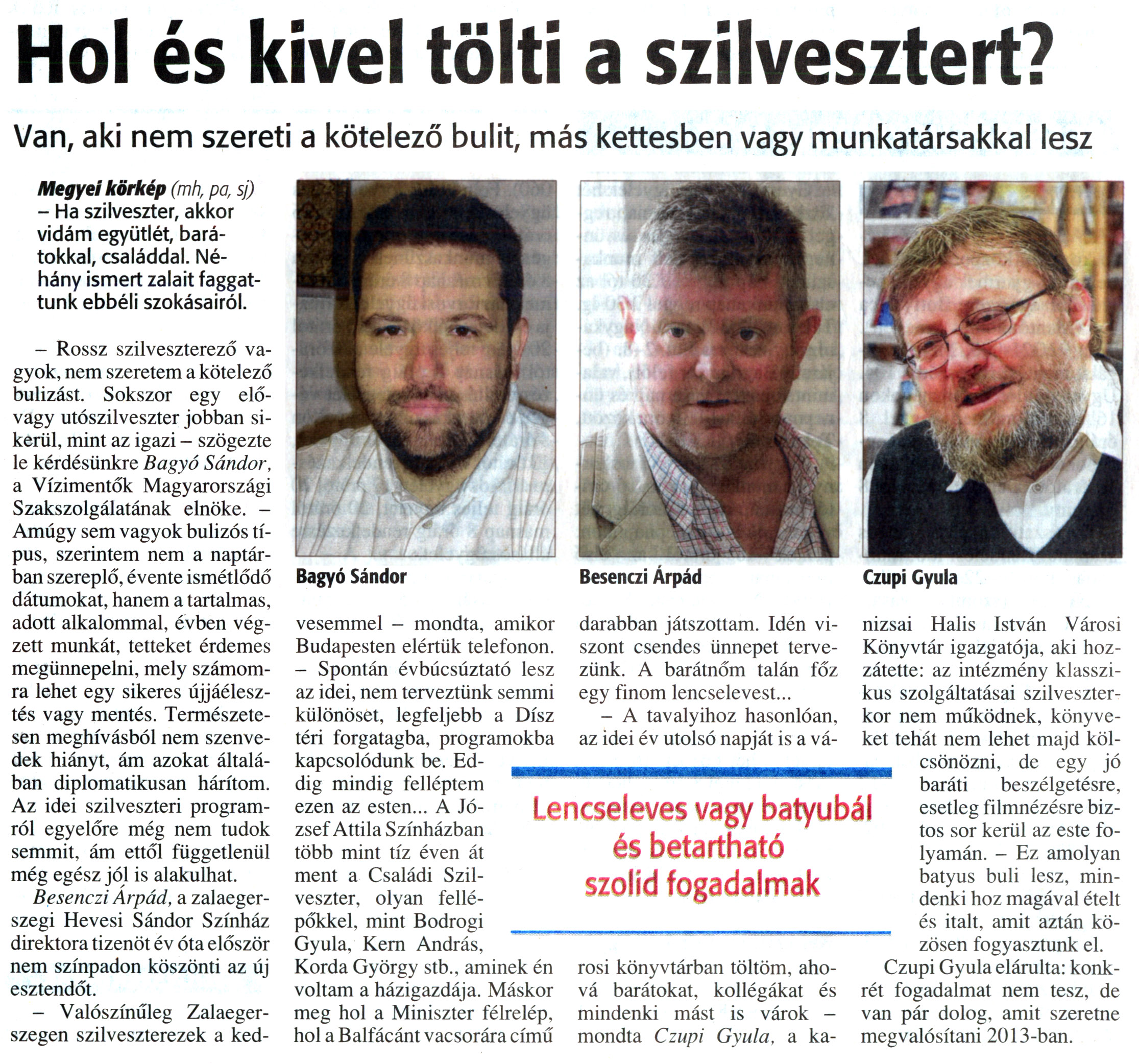 Nyilvános 1793 | 4604 | Zalai Hírlap 2012. december 31. 304. szám 3. oldal - Hol és kivel tölti a szilvesztert | Hol és kivel tölti a szilvesztert? Van, aki nem szereti a kötelező bulit, más kettesben vagy munkatársakkal lesz Lencseleves vagy batyubál és betartható szolid fogadalmak Bagyó Sándor Besenczi Árpád Czupi Gyula Megyei körkép (mh, pa, sj) - Ha szilveszter, akkor vidám együtlét, barátokkal, családdal. Néhány ismert zalait faggattunk ebbéli szokásairól. - Rossz szilveszterező vagyok, nem szeretem a kötelező bulizást. Sokszor egy elővagy utószilveszter jobban sikerül, mint az igazi - szögezte le kérdésünkre Bagyó Sándor, a Vízimentők Magyarországi Szakszolgálatának elnöke. -Amúgy sem vagyok bulizós típus, szerintem nem a naptárban szereplő, évente ismétlődő dátumokat, hanem a tartalmas, adott alkalommal, évben végzett munkát, tetteket érdemes megünnepelni, mely számomra lehet egy sikeres újjáélesztés vagy mentés. Természetesen meghívásból nem szenvedek hiányt, ám azokat általában diplomatikusan hárítom. Az idei szilveszteri programról egyelőre még nem tudok semmit, ám ettől függetlenül még egész jól is alakulhat. Besenczi Árpád, a zalaegerszegi Hevesi Sándor Színház direktora tizenöt év óta először nem színpadon köszönti az új esztendőt. - Valószínűleg Zalaegerszegen szilveszterezek a kedvesemmel - mondta, amikor Budapesten elértük telefonon. - Spontán évbúcsúztató lesz az idei, nem terveztünk semmi különöset, legfeljebb a Dísz téri forgatagba, programokba kapcsolódunk be. Eddig mindig felléptem ezen az esten... A József Attila Színházban több mint tíz éven át ment a Családi Szilveszter, olyan fellépőkkel, mint Bodrogi Gyula, Kern András, Korda György stb., aminek én voltam a házigazdája. Máskor meg hol a Miniszter félrelép, hol a Balfácánt vacsorára című darabban játszottam. Idén viszont csendes ünnepet tervezünk. A barátnőm talán főz egy finom lencselevest... - A tavalyihoz hasonlóan, az idei év utolsó napját is a városi könyvtárban töltöm, ahová barátokat, kollégákat és mindenki mást is várok -mondta Czupi Gyula, a kanizsai Halis István Városi Könyvtár igazgatója, aki hozzátette: az intézmény klasszikus szolgáltatásai szilveszterkor nem működnek, könyveket tehát nem lehet majd kölcsönözni, de egy jó baráti beszélgetésre, esetleg filmnézésre biztos sor kerül az este folyamán. - Ez amolyan batyus buli lesz, mindenki hoz magával ételt és italt, amit aztán közösen fogyasztunk el. Czupi Gyula elárulta: konkrét fogadalmat nem tesz, de van pár dolog, amit szeretne megvalósítani 2013-ban. |