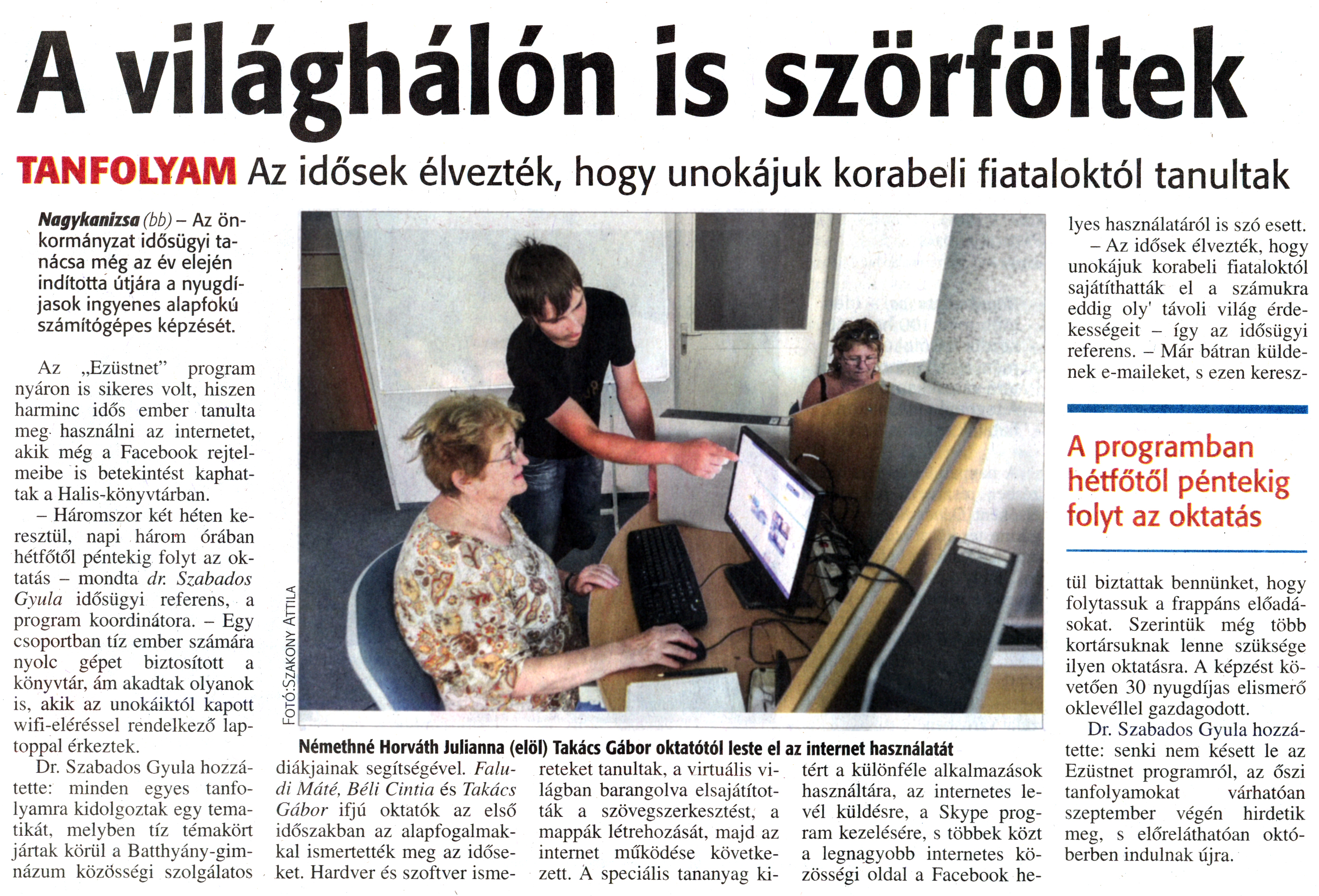 Nyilvános 1880 | 3573 | Zalai Hírlap 2014. szeptember 4. 206. szám 4. oldal | A világhálón is szörföltek TANFOLYAM Az idősek élvezték, hogy unokájuk korabeli fiataloktól tanultak Nagykanizsa (bb) - Az önkormányzat idősügyi tanácsa még az év elején indította útjára a nyugdíjasok ingyenes alapfokú számítógépes képzését. Az „Ezüstnet" program nyáron is sikeres volt, hiszen harminc idős ember tanulta meg használni az internetet, akik még a Facebook rejtelmeibe is betekintést kaphattak a Halis-könyvtárban. - Háromszor két héten keresztül, napi három órában hétfőtől péntekig folyt az oktatás - mondta dr. Szabados Gyula idősügyi referens, a program koordinátora. - Egy csoportban tíz ember számára nyolc gépet biztosított a könyvtár, ám akadtak olyanok is, akik az unokáiktól kapott wifi-eléréssel rendelkező laptoppal érkeztek. Dr. Szabados Gyula hozzátette: minden egyes tanfolyamra kidolgoztak egy tematikát, melyben tíz témakört jártak körül a Batthyány-gimnázum közösségi szolgálatos diákjainak segítségével. Faludi Máté, Béli Cintia és Takács Gábor ifjú oktatók az első időszakban az alapfogalmakkal ismertették meg az időseket. Hardver és szoftver ismereteket tanultak, a virtuális világban barangolva elsajátították a szövegszerkesztést, a mappák létrehozását, majd az internet működése következett. A speciális tananyag kitért a különféle alkalmazások használatára, az internetes levél küldésre, a Skype program kezelésére, s többek közt a legnagyobb internetes közösségi oldal a Facebook helyes használatáról is szó esett. - Az idősek élvezték, hogy unokájuk korabeli fiataloktól sajátíthatták el a számukra eddig oly\' távoli világ érdekességeit - így az idősügyi referens. - Már bátran küldenek e-maileket, s ezen keresztül biztattak bennünket, hogy folytassuk a frappáns előadásokat. Szerintük még több kortársuknak lenne szüksége ilyen oktatásra. A képzést követően 30 nyugdíjas elismerő oklevéllel gazdagodott. Dr. Szabados Gyula hozzátette: senki nem késett le az Ezüstnet programról, az őszi tanfolyamokat várhatóan szeptember végén hirdetik meg, s előreláthatóan októberben indulnak újra. Némethné Horváth Julianna (elöl) Takács Gábor oktatótól leste el az internet használatát A programban hétfőtől péntekig folyt az oktatás |