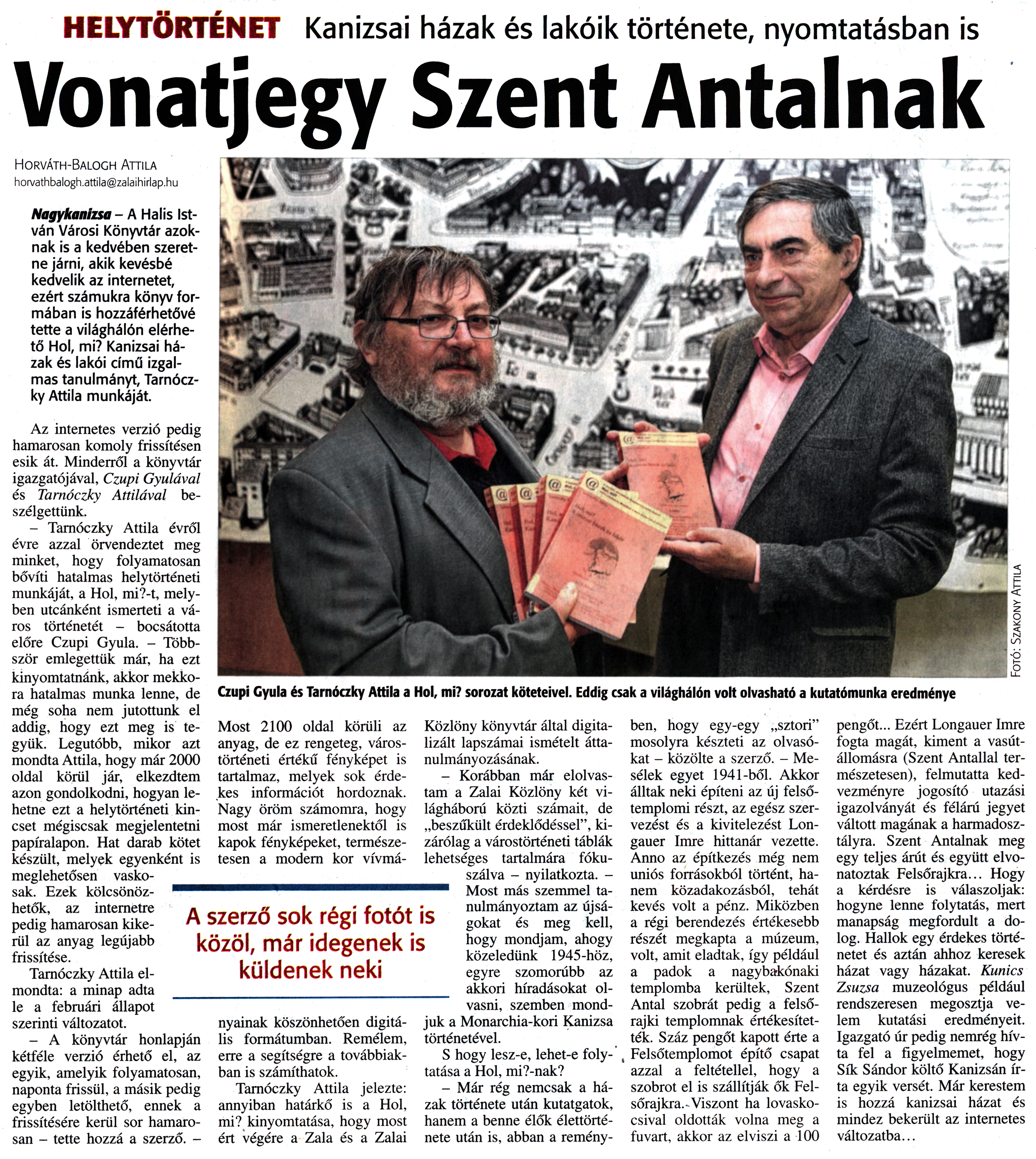| Nyilvános   1510 | 3678 | Zalai Hírlap 2016. február 26. 48. szám 5. oldal | HELYTÖRTÉNET Kanizsai házak és lakóik története, nyomtatásban is Vonatjegy Szent Antalnak Horváth-Balogh Attila horvathbalogh.attila@zalaihirlap.hu Nagykanizsa - A Halis István Városi Könyvtár azoknak is a kedvében szeretne járni, akik kevésbé kedvelik az internetet, ezért számukra könyv formában is hozzáférhetővé tette a világhálón elérhető Hol, mi? Kanizsai házak és lakói című izgalmas tanulmányt, Tarnóczky Attila munkáját. Az internetes verzió pedig hamarosan komoly frissítésen esik át. Minderről a könyvtár igazgatójával, Czupi Gyulával és Tarnóczky Attilával beszélgettünk. - Tarnóczky Attila évről évre azzal örvendeztet meg minket, hogy folyamatosan bővíti hatalmas helytörténeti munkáját, a Hol, mi?-t, melyben utcánként ismerteti a város történetét - bocsátotta előre Czupi Gyula. - Többször emlegettük már, ha ezt kinyomtatnánk, akkor mekkora hatalmas munka lenne, de még soha nem jutottunk el addig, hogy ezt meg is tegyük. Legutóbb, mikor azt mondta Attila, hogy már 2000 oldal körül jár, elkezdtem azon gondolkodni, hogyan lehetne ezt a helytörténeti kincset mégiscsak megjelentetni papíralapon. Hat darab kötet készült, melyek egyenként is meglehetősen vaskosak. Ezek kölcsönözhetők, az internetre pedig hamarosan kikerül az anyag legújabb frissítése. Tarnóczky Attila elmondta: a minap adta le a februári állapot szerinti változatot. - A könyvtár honlapján kétféle verzió érhető el, az egyik, amelyik folyamatosan, naponta frissül, a másik pedig egyben letölthető, ennek a frissítésére kerül sor hamarosan - tette hozzá a szerző. - Czupi Gyula és Tarnóczky Attila a Hol, mi? sorozat köteteivel. Eddig csak a világhálón volt olvasható a kutatómunka eredménye Most 2100 oldal körüli az anyag, de ez rengeteg, várostörténeti értékű fényképet is tartalmaz, melyek sok érdekes információt hordoznak. Nagy öröm számomra, hogy most már ismeretlenektől is kapok fényképeket, természetesen a modern kor vívmányainak köszönhetően digitális formátumban. Remélem, erre a segítségre a továbbiakban is számíthatok. Tarnóczky Attila jelezte: annyiban határkő is a Hol, mi? kinyomtatása, hogy most ért végére a Zala és a Zalai Közlöny könyvtár által digitalizált lapszámai ismételt áttanulmányozásának. - Korábban már elolvastam a Zalai Közlöny két világháború közti számait, de „beszűkült érdeklődéssel", kizárólag a várostörténeti táblák lehetséges tartalmára fókuszálva - nyilatkozta. -Most más szemmel tanulmányoztam az újságokat és meg kell, hogy mondjam, ahogy közeledünk 1945-höz, egyre szomorúbb az akkori híradásokat olvasni, szemben mondjuk a Monarchia-kori Kanizsa történetével. S hogy lesz-e, lehet-e folytatása a Hol, mi?-nak? - Már rég nemcsak a házak története után kutatgatok, hanem a benne élők élettörténete után is, abban a reményben, hogy egy-egy „sztori" mosolyra készteti az olvasókat - közölte a szerző. - Mesélek egyet 1941-ből. Akkor álltak neki építeni az új felsőtemplomi részt, az egész szervezést és a kivitelezést Longauer Imre hittanár vezette. Anno az építkezés még nem uniós forrásokból történt, hanem közadakozásból, tehát kevés volt a pénz. Miközben a régi berendezés értékesebb részét megkapta a múzeum, volt, amit eladtak, így például a padok a nagybakónaki templomba kerültek, Szent Antal szobrát pedig a felső-rajki templomnak értékesítették. Száz pengőt kapott érte a Felsőtemplomot építő csapat azzal a feltétellel, hogy a szobrot el is szállítják ők Fel-sőrajkra. Viszont ha lovaskocsival oldották volna meg a fuvart, akkor az elviszi a 100 pengőt... Ezért Longauer Imre fogta magát, kiment a vasútállomásra (Szent Antallal természetesen), felmutatta kedvezményre jogosító utazási igazolványát és félárú jegyet váltott magának a harmadosztályra. Szent Antalnak meg egy teljes árút és együtt elvonatoztak Felsőrajkra... Hogy a kérdésre is válaszoljak: hogyne lenne folytatás, mert manapság megfordult a dolog. Hallok egy érdekes történetet és aztán ahhoz keresek házat vagy házakat. Kunics Zsuzsa muzeológus például rendszeresen megosztja velem kutatási eredményeit. Igazgató úr pedig nemrég hívta fel a figyelmemet, hogy Sík Sándor költő Kanizsán írta egyik versét. Már kerestem is hozzá kanizsai házat és mindez bekerült az internetes változatba... |