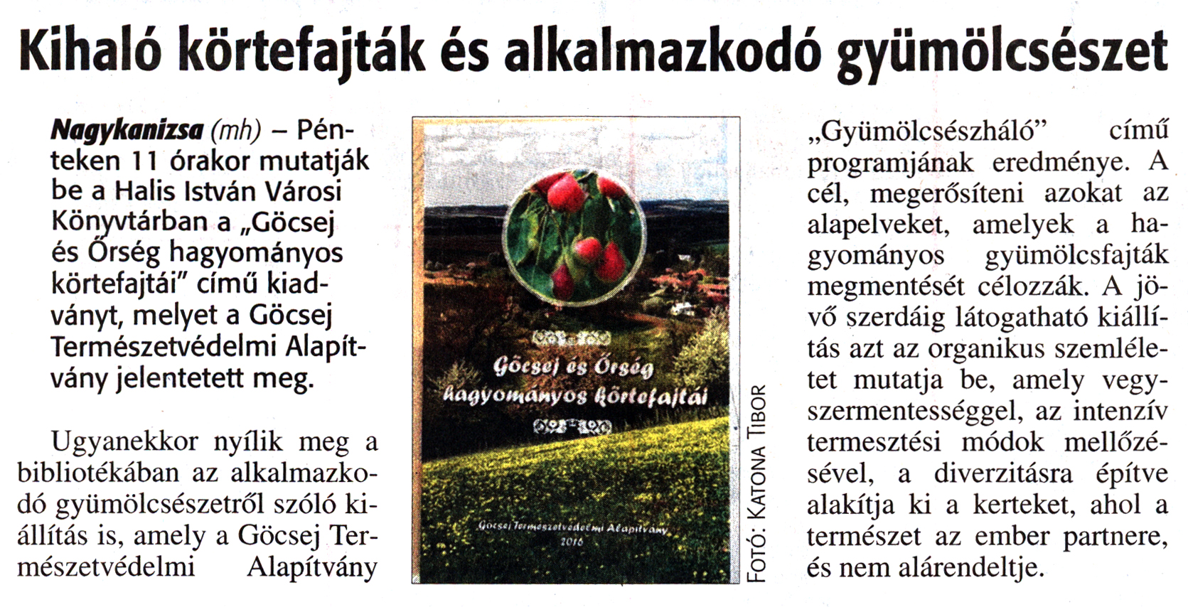 Nyilvános 2092 | 3737 | Zalai Hírlap 2016. június 22. 145. szám 7. oldal | Kihaló körtefajták és alkalmazkodó gyümölcsészet Nagykanizsa (mh) - Pénteken 11 órakor mutatják be a Halis István Városi Könyvtárban a „Göcsej és Őrség hagyományos körtefajtái" című kiadványt, melyet a Göcsej Természetvédelmi Alapítvány jelentetett meg. Ugyanekkor nyílik meg a bibliotékában az alkalmazkodó gyümölcsészetről szóló kiállítás is, amely a Göcsej Természetvédelmi Alapítvány „Gyümölcsészháló" című programjának eredménye. A cél, megerősíteni azokat az alapelveket, amelyek a hagyományos gyümölcsfajták megmentését célozzák. A jövő szerdáig látogatható kiállítás azt az organikus szemléletet mutatja be, amely vegyszermentességgel, az intenzív termesztési módok mellőzésével, a diverzitásra építve alakítja ki a kerteket, ahol a természet az ember partnere, és nem alárendeltje. |