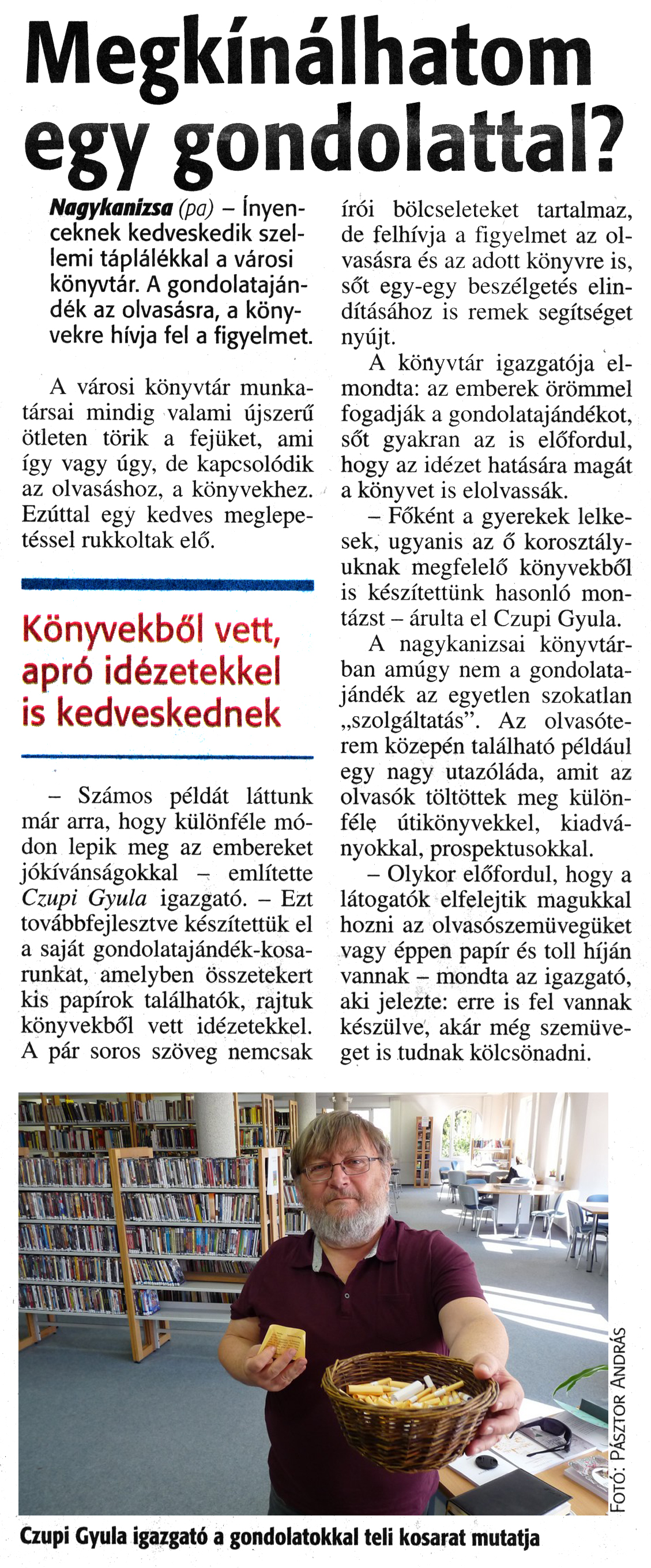 Nyilvános 1723 | 3290 | Zalai Hírlap 2017. március 28. 73. szám 2. oldal | Megkínálhatom egy gondolattal? Nagykanizsa (pa) - Ínyenceknek kedveskedik szellemi táplálékkal a városi könyvtár. A gondolatajándék az olvasásra, a könyvekre hívja fel a figyelmet. A városi könyvtár munkatársai mindig valami újszerű ötleten törik a fejüket, ami így vagy úgy, de kapcsolódik az olvasáshoz, a könyvekhez. Ezúttal egy kedves meglepetéssel rukkoltak elő. Könyvekből vett, apró idézetekkel is kedveskednek - Számos példát láttunk már arra, hogy különféle módon lepik meg az embereket jókívánságokkal - említette Czupi Gyula igazgató. - Ezt továbbfejlesztve készítettük el a saját gondolatajándék-kosarunkat, amelyben összetekert kis papírok találhatók, rajtuk könyvekből vett idézetekkel. A pár soros szöveg nemcsak írói bölcseleteket tartalmaz, de felhívja a figyelmet az olvasásra és az adott könyvre is, sőt egy-egy beszélgetés elindításához is remek segítséget nyújt. A könyvtár igazgatója elmondta: az emberek örömmel fogadják a gondolatajándékot, sőt gyakran az is előfordul, hogy az idézet hatására magát a könyvet is elolvassák. - Főként a gyerekek lelkesek, ugyanis az ő korosztályuknak megfelelő könyvekből is készítettünk hasonló montázst - árulta el Czupi Gyula. A nagykanizsai könyvtárban amúgy nem a gondolatajándék az egyetlen szokatlan „szolgáltatás". Az olvasóterem közepén található például egy nagy utazóláda, amit az olvasók töltöttek meg különféle útikönyvekkel, kiadványokkal, prospektusokkal. - Olykor előfordul, hogy a látogatók elfelejtik magukkal hozni az olvasószemüvegüket vagy éppen papír és toll híján vannak - mondta az igazgató, aki jelezte: erre is fel vannak készülve, akár még szemüveget is tudnak kölcsönadni. Czupi Gyula igazgató a gondolatokkal teli kosarat mutatja |