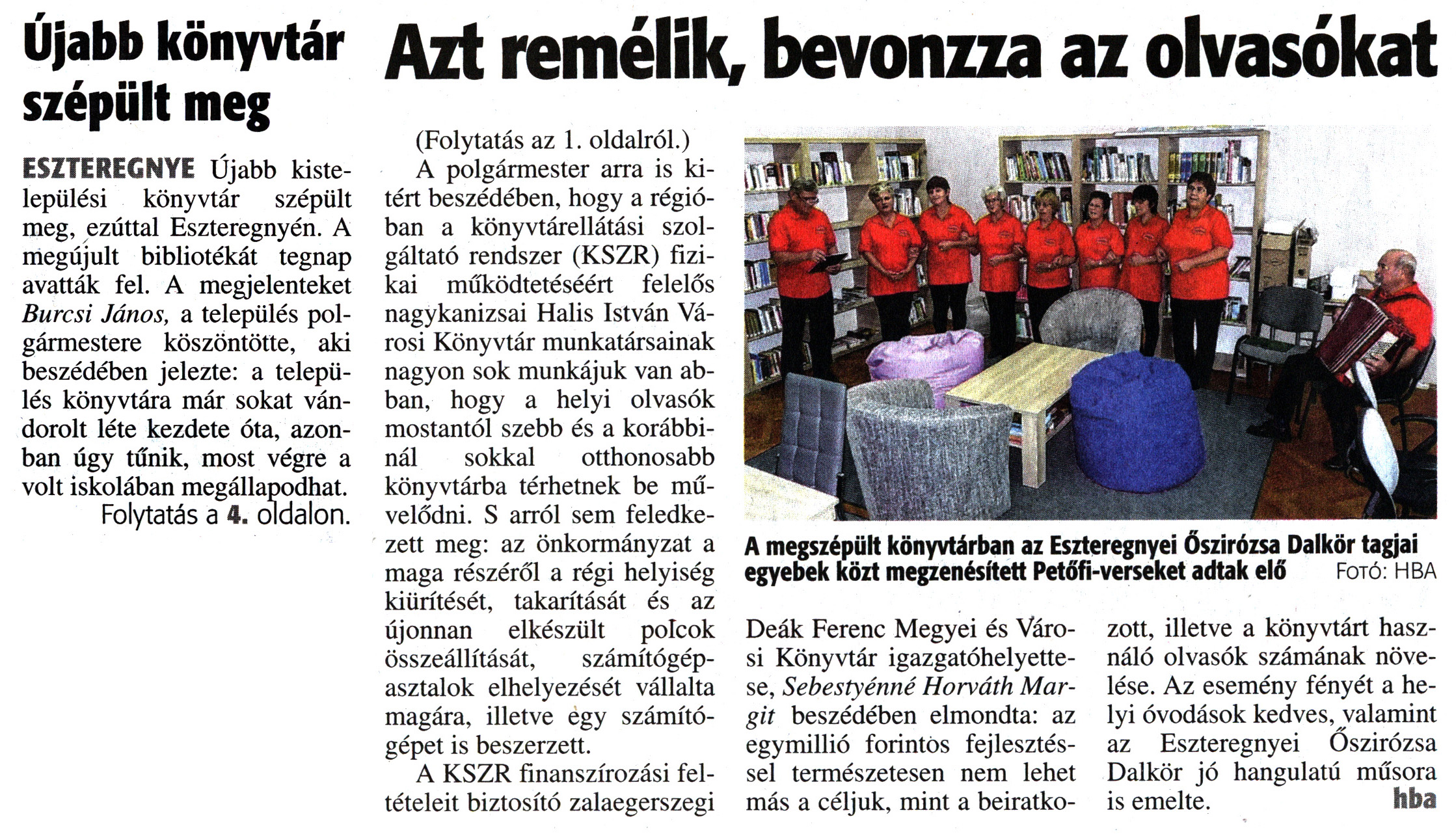 Nyilvános 1587 | 3055 | Zalai Hírlap 2017. november 11. 263. szám 1, 4. oldal | Újabb könyvtár szépült meg ESZTEREGNYE Újabb kistelepülési könyvtár szépült meg, ezúttal Eszteregnyén. A megújult bibliotékát tegnap avatták fel. A megjelenteket Burcsi János, a település polgármestere köszöntötte, aki beszédében jelezte: a település könyvtára már sokat vándorolt léte kezdete óta, azonban úgy tűnik, most végre a volt iskolában megállapodhat. Folytatás a 4. oldalon. Azt remelik, bevonzza az olvasókat A megszépült könyvtárban az Eszteregnyei Őszirózsa Dalkör tagjai egyebek közt megzenésített Petőfi-verseket adtak elő Fotó: hba (Folytatás az 1. oldalról.) A polgármester arra is kitért beszédében, hogy a régióban a könyvtárellátási szolgáltató rendszer (KSZR) fizikai működtetéséért felelős nagykanizsai Halis István Városi Könyvtár munkatársainak nagyon sok munkájuk van abban, hogy a helyi olvasók mostantól szebb és a korábbinál sokkal otthonosabb könyvtárba térhetnek be művelődni. S arról sem feledkezett meg: az önkormányzat a maga részéről a régi helyiség kiürítését, takarítását és az újonnan elkészült polcok összeállítását, számítógépasztalok elhelyezését vállalta magára, illetve egy számítógépet is beszerzett. A KSZR finanszírozási feltételeit biztosító zalaegerszegi Deák Ferenc Megyei és Városi Könyvtár igazgatóhelyettese, Sebestyénné Horváth Margit beszédében elmondta: az egymillió forintos fejlesztéssel természetesen nem lehet más a céljuk, mint a beiratkozott, illetve a könyvtárt használó olvasók számának növelése. Az esemény fényét a helyi óvodások kedves, valamint az Eszteregnyei Őszirózsa Dalkör jó hangulatú műsora is emelte. hba |