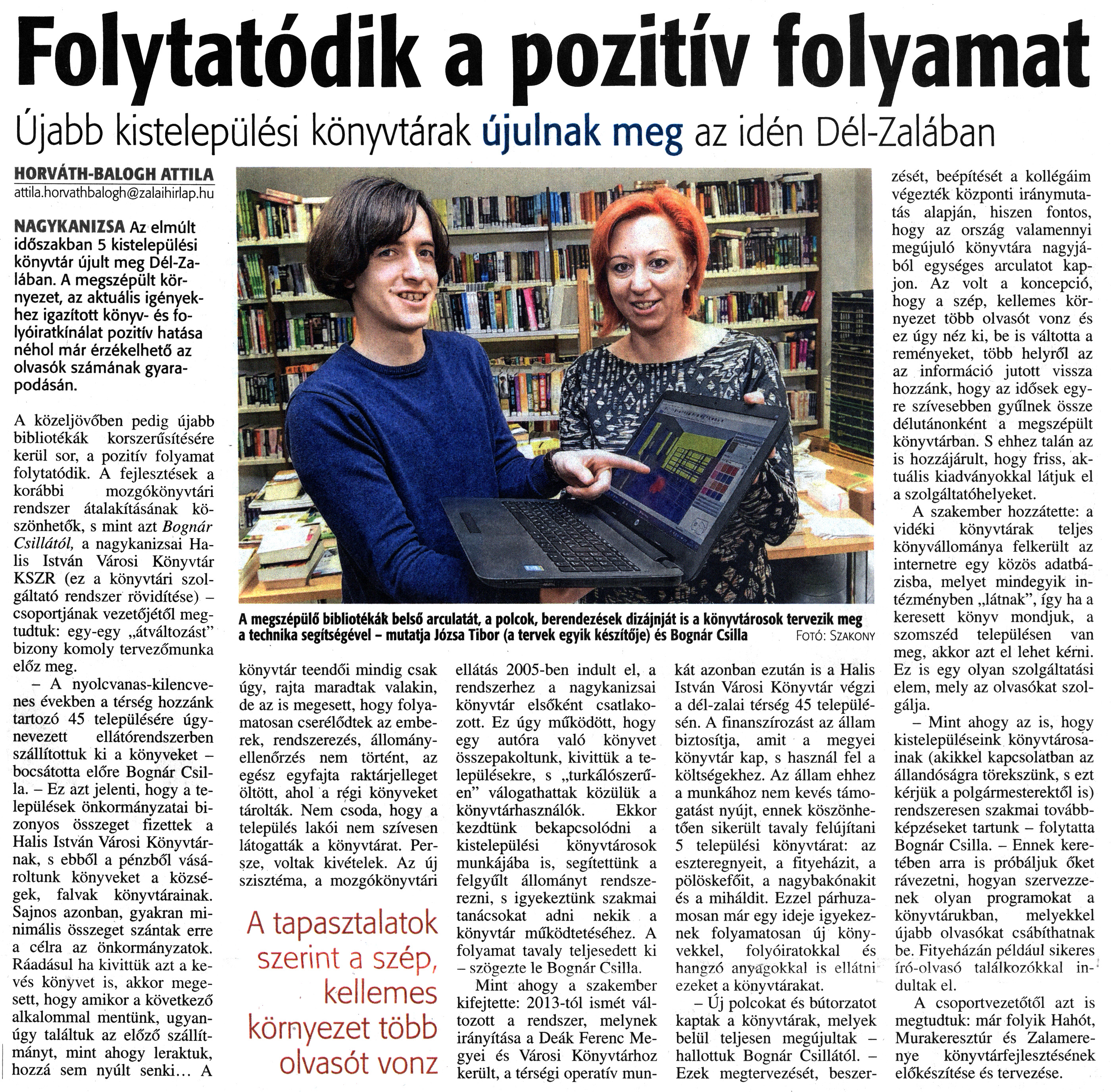Nyilvános 1477 | 2873 | Zalai Hírlap 2018. február 15. 39. szám 6. oldal | Folytatódik a pozitív folyamat Újabb kistelepülési könyvtárak újulnak meg az idén Dél-Zalában A megszépülő bibliotékák belső arculatát, a polcok, berendezések dizájnját is a könyvtárosok tervezik meg a technika segítségével - mutatja Józsa Tibor (a tervek egyik készítője) és Bognár Csilla Fotó: Szakony HORVÁTH-BALOGH ATTILA attila.horvathbalogh@zalaihirlap.hu NAGYKANIZSA Az elmúlt időszakban 5 kistelepülési könyvtár újult meg Dél-Zalában. A megszépült környezet, az aktuális igényekhez igazított könyv- és folyóiratkínálat pozitív hatása néhol már érzékelhető az olvasók számának gyarapodásán. A közeljövőben pedig újabb bibliotékák korszerűsítésére kerül sor, a pozitív folyamat folytatódik. A fejlesztések a korábbi mozgókönyvtári rendszer átalakításának köszönhetők, s mint azt Bognár Csillától, a nagykanizsai Ha-lis István Városi Könyvtár KSZR (ez a könyvtári szolgáltató rendszer rövidítése) -csoportjának vezetőjétől megtudtuk: egy-egy „átváltozást" bizony komoly tervezőmunka előz meg. - A nyolcvanas-kilencvenes években a térség hozzánk tartozó 45 településére úgynevezett ellátórendszerben szállítottuk ki a könyveket -bocsátotta előre Bognár Csilla. - Ez azt jelenti, hogy a települések önkormányzatai bizonyos összeget fizettek a Halis István Városi Könyvtárnak, s ebből a pénzből vásároltunk könyveket a községek, falvak könyvtárainak. Sajnos azonban, gyakran minimális összeget szántak erre a célra az önkormányzatok. Ráadásul ha kivittük azt a kevés könyvet is, akkor megesett, hogy amikor a következő alkalommal mentünk, ugyanúgy találtuk az előző szállítmányt, mint ahogy leraktuk, hozzá sem nyúlt senki... A könyvtár teendői mindig csak úgy, rajta maradtak valakin, de az is megesett, hogy folyamatosan cserélődtek az emberek, rendszerezés, állományellenőrzés nem történt, az egész egyfajta raktárjelleget öltött, ahol a régi könyveket tárolták. Nem csoda, hogy a település lakói nem szívesen látogatták a könyvtárat. Persze, voltak kivételek. Az új szisztéma, a mozgókönyvtári A tapasztalatok szerint a szép, kellemes környezet több olvasót vonz ellátás 2005-ben indult el, a rendszerhez a nagykanizsai könyvtár elsőként csatlakozott. Ez úgy működött, hogy egy autóra való könyvet összepakoltunk, kivittük a településekre, s „turkálószerűen" válogathattak közülük a könyvtárhasználók. Ekkor kezdtünk bekapcsolódni a kistelepülési könyvtárosok munkájába is, segítettünk a felgyűlt állományt rendszerezni, s igyekeztünk szakmai tanácsokat adni nekik a könyvtár működtetéséhez. A folyamat tavaly teljesedett ki - szögezte le Bognár Csilla. Mint ahogy a szakember kifejtette: 2013-tól ismét változott a rendszer, melynek irányítása a Deák Ferenc Megyei és Városi Könyvtárhoz került, a térségi operatív mun- kát azonban ezután is a Halis István Városi Könyvtár végzi a dél-zalai térség 45 településén. A finanszírozást az állam biztosítja, amit a megyei könyvtár kap, s használ fel a költségekhez. Az állam ehhez a munkához nem kevés támogatást nyújt, ennek köszönhetően sikerült tavaly felújítani 5 települési könyvtárat: az eszteregnyeit, a fityeházit, a pölöskefőit, a nagybakónakit és a miháldit. Ezzel párhuzamosan már egy ideje igyekeznek folyamatosan új könyvekkel, folyóiratokkal és hangzó anyagokkal is ellátni ezeket a könyvtárakat. - Új polcokat és bútorzatot kaptak a könyvtárak, melyek belül teljesen megújultak -hallottuk Bognár Csillától. - Ezek megtervezését, beszerzését, beépítését a kollégáim végezték központi iránymutatás alapján, hiszen fontos, hogy az ország valamennyi megújuló könyvtára nagyjából egységes arculatot kapjon. Az volt a koncepció, hogy a szép, kellemes környezet több olvasót vonz és ez úgy néz ki, be is váltotta a reményeket, több helyről az az információ jutott vissza hozzánk, hogy az idősek egyre szívesebben gyűlnek össze délutánonként a megszépült könyvtárban. S ehhez talán az is hozzájárult, hogy friss, aktuális kiadványokkal látjuk el a szolgáltatóhelyeket. A szakember hozzátette: a vidéki könyvtárak teljes könyvállománya felkerült az internetre egy közös adatbázisba, melyet mindegyik intézményben „látnak", így ha a keresett könyv mondjuk, a szomszéd településen van meg, akkor azt el lehet kérni. Ez is egy olyan szolgáltatási elem, mely az olvasókat szolgálja. - Mint ahogy az is, hogy kistelepüléseink könyvtárosainak (akikkel kapcsolatban az állandóságra törekszünk, s ezt kérjük a polgármesterektől is) rendszeresen szakmai továbbképzéseket tartunk - folytatta Bognár Csilla. - Ennek keretében arra is próbáljuk őket rávezetni, hogyan szervezzenek olyan programokat a könyvtárukban, melyekkel újabb olvasókat csábíthatnak be. Fityeházán például sikeres író-olvasó találkozókkal indultak el. A csoportvezetőtől azt is megtudtuk: már folyik Hahót, Murakeresztúr és Zalamerenye könyvtárfejlesztésének előkészítése és tervezése. |