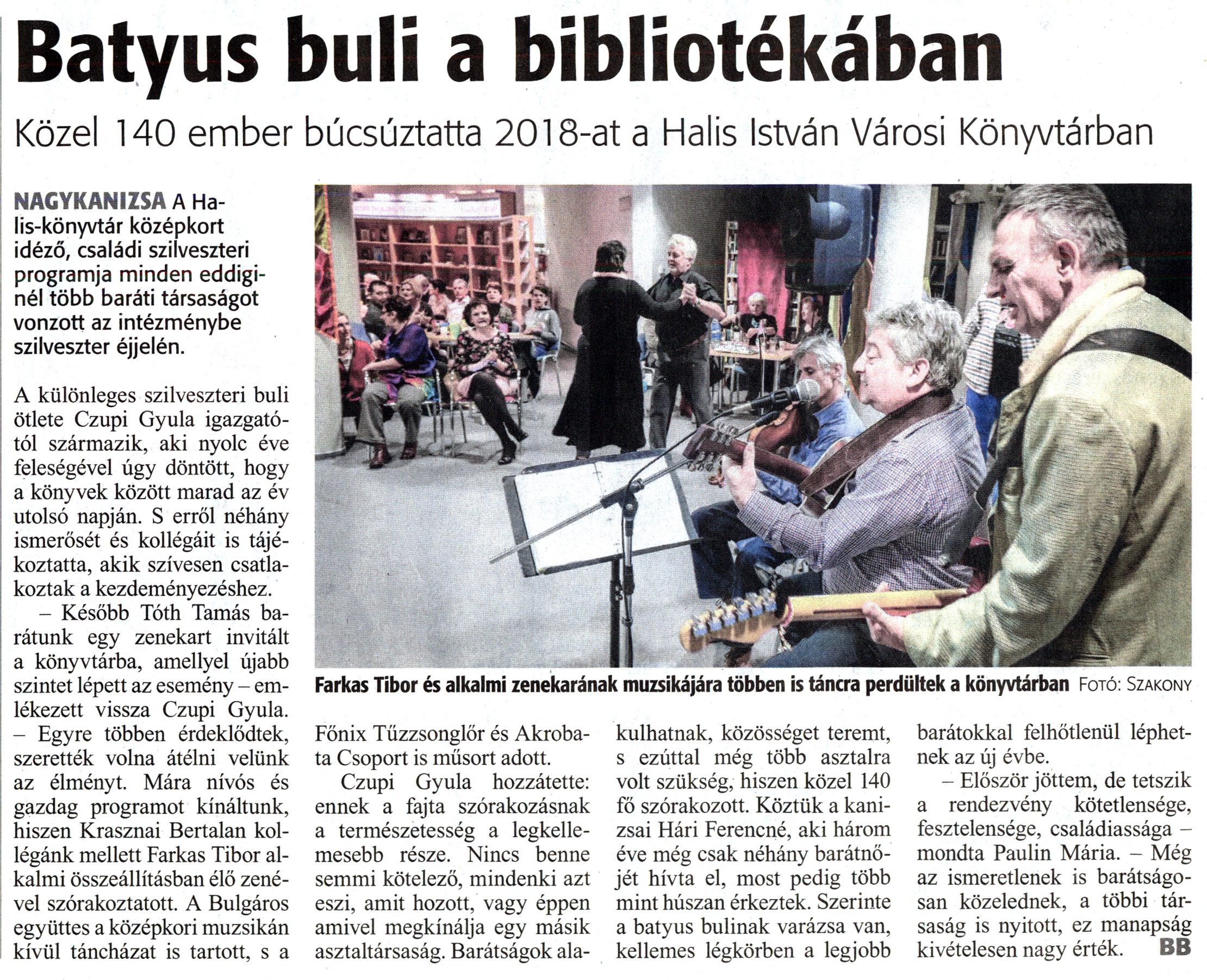 Nyilvános 2004 | 5354 | Zalai Hírlap 2019. január 2. 1. szám 3. oldal | Batyus buli a bibliotékában Közel 140 ember búcsúztatta 2018-at a Halis István Városi Könyvtárban Farkas Tibor és alkalmi zenekarának muzsikájára többen is táncra perdültek a könyvtárban Fotó: Szakony NAGYKANIZSA A Halis-könyvtár középkort idéző, családi szilveszteri programja minden eddiginél több baráti társaságot vonzott az intézménybe szilveszter éjjelén. A különleges szilveszteri buli ötlete Czupi Gyula igazgatótól származik, aki nyolc éve feleségével úgy döntött, hogy a könyvek között marad az év utolsó napján. S erről néhány ismerősét és kollégáit is tájékoztatta, akik szívesen csatlakoztak a kezdeményezéshez. - Később Tóth Tamás barátunk egy zenekart invitált a könyvtárba, amellyel újabb szintet lépett az esemény - emlékezett vissza Czupi Gyula. - Egyre többen érdeklődtek, szerették volna átélni velünk az élményt. Mára nívós és gazdag programot kínáltunk, hiszen Krasznai Bertalan kollégánk mellett Farkas Tibor alkalmi összeállításban élő zenével szórakoztatott. A Bulgáros együttes a középkori muzsikán kívül táncházat is tartott, s a Főnix Tűzzsonglőr és Akrobata Csoport is műsort adott. Czupi Gyula hozzátette: ennek a fajta szórakozásnak a természetesség a legkellemesebb része. Nincs benne semmi kötelező, mindenki azt eszi, amit hozott, vagy éppen amivel megkínálja egy másik asztaltársaság. Barátságok alakulhatnak, közösséget teremt, s ezúttal még több asztalra volt szükség, hiszen közel 140 fő szórakozott. Köztük a kanizsai Hári Ferencné, aki három éve még csak néhány barátnőjét hívta el, most pedig több mint húszan érkeztek. Szerinte a batyus bulinak varázsa van, kellemes légkörben a legjobb barátokkal felhőtlenül léphetnek az új évbe. - Először jöttem, de tetszik a rendezvény kötetlensége, fesztelensége, családiassága -mondta Paulin Mária. - Még az ismeretlenek is barátságosan közelednek, a többi társaság is nyitott, ez manapság kivételesen nagy érték. BB |