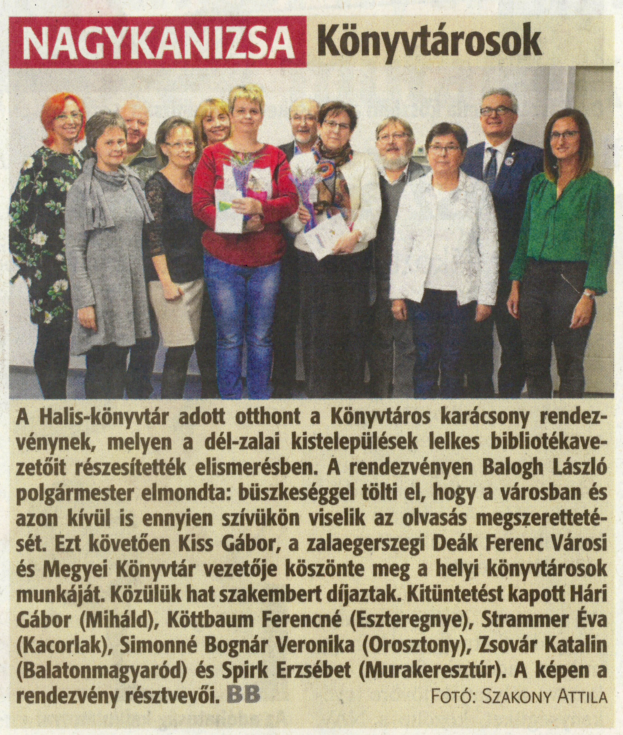 Nyilvános 1358 | 2015 | Zalai Hírlap 2019. december 11. 287.sz. 3.old. - NAGYKANIZSA Könyvtárosok | A Halis-könyvtár adott otthont a Könyvtáros karácsony rendezvénynek, melyen a dél-zalai kistelepülések lelkes bibliotékavezetőit részesítették elismerésben. A rendezvényen Balogh László polgármester elmondta: büszkeséggel tölti el, hogy a városban és azon kívül is ennyien szívükön viselik az olvasás megszerettetését. Ezt követően Kiss Gábor, a zalaegerszegi Deák Ferenc Városi és Megyei Könyvtár vezetője köszönte meg a helyi könyvtárosok munkáját. Közülük hat szakembert díjaztak. Kitüntetést kapott Hári Gábor (Miháld), Köttbaum Ferencné (Eszteregnye), Strammer Éva (Kacorlak), Simonné Bognár Veronika (Orosztony), Zsovár Katalin (Balatonmagyaród) és Spirk Erzsébet (Murakeresztúr). A képen a rendezvény résztvevői. FOTÓ: SZAKONY ATTILA |