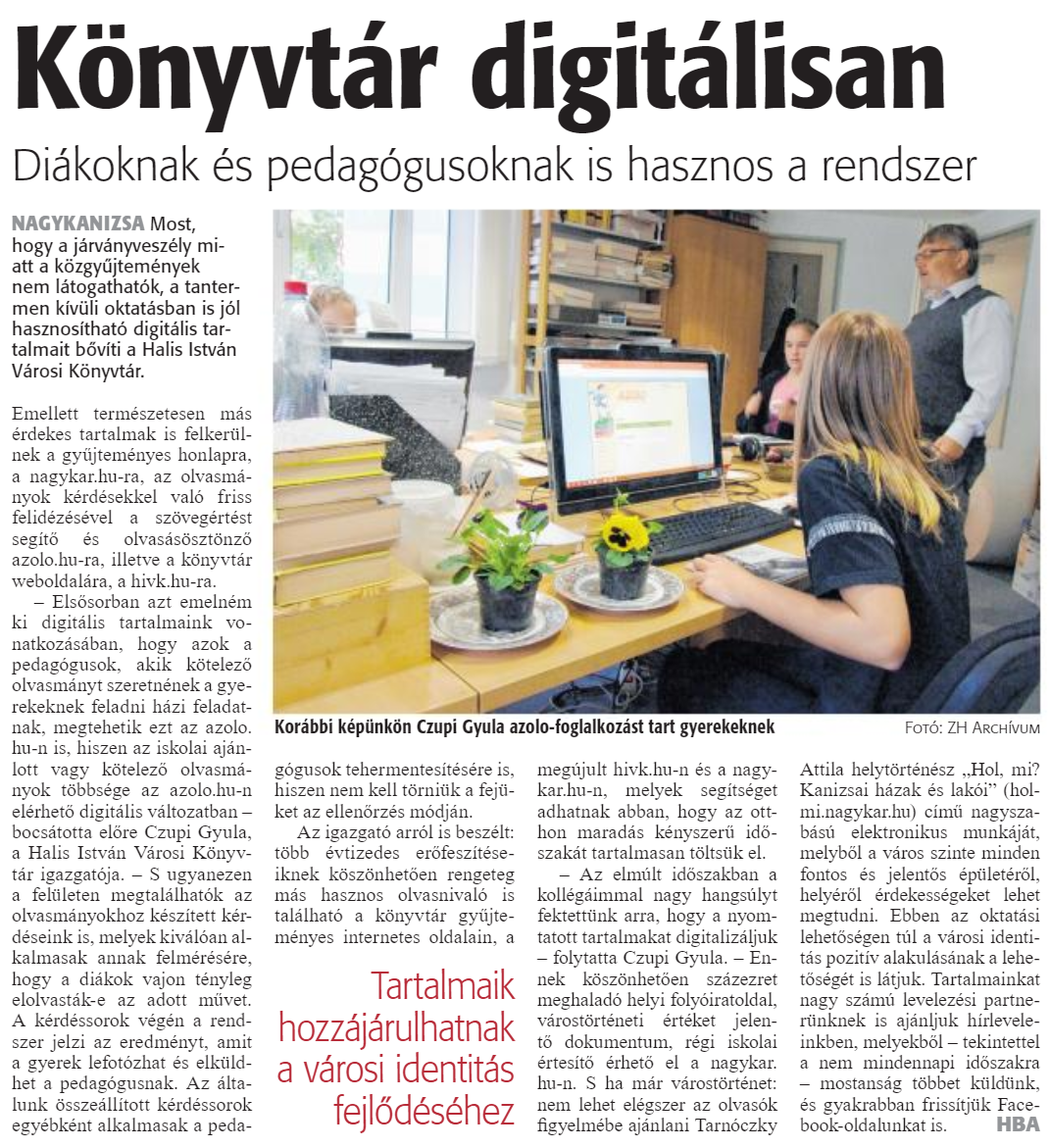 Nyilvános 1347 | 1992 | Könyvtár digitálisan | Diákoknak és pedagógusoknak is hasznos a rendszer Korábbi képünkön Czupi Gyula azolo-foglalkozást tart gyerekeknek Fotó: ZH Archívum NAGYKANIZSA Most, hogy a járványveszély miatt a közgyűjtemények nem látogathatók, a tantermen kívüli oktatásban is jól hasznosítható digitális tartalmait bővíti a Halis István Városi Könyvtár. Emellett természetesen más érdekes tartalmak is felkerülnek a gyűjteményes honlapra, a nagykar.hu-ra, az olvasmányok kérdésekkel való friss felidézésével a szövegértést segítő és olvasásösztönzö azolo.hu-ra, illetve a könyvtár weboldalára, a hivk.hu-ra. - Elsősorban azt emelném ki digitális tartalmaink vonatkozásában, hogy azok a pedagógusok, akik kötelező olvasmányt szeretnének a gyerekeknek feladni házi feladatnak, megtehetik ezt az azolo.hu-n is, hiszen az iskolai ajánlott vagy kötelező olvasmányok többsége az azolo.hu-n elérhető digitális változatban -bocsátotta előre Czupi Gyula, a Halis István Városi Könyvtár igazgatója. - S ugyanezen a felületen megtalálhatók az olvasmányokhoz készített kérdéseink is, melyek kiválóan alkalmasak annak felmérésére, hogy a diákok vajon tényleg elolvasták-e az adott művet. A kérdéssorok végén a rend-szer jelzi az eredményt, amit a gyerek lefotózhat és elküldhet a pedagógusnak. Az általunk összeállított kérdéssorok egyébként alkalmasak a pedagógusok tehermentesítésére is, hiszen nem kell törniük a fejüket az ellenőrzés módján. Az igazgató arról is beszélt: több évtizedes erőfeszítéseiknek köszönhetően rengeteg más hasznos olvasnivaló is található a könyvtár gyűjteményes internetes oldalain, a megújult hivk.hu-n és a nagykar.hu-n, melyek segítséget adhatnak abban, hogy az otthon maradás kényszerű időszakát tartalmasai! töltsük el. - Az elmúlt időszakban a kollégáimmal nagy hangsúlyt fektettünk arra, hogy a nyomtatott tartalmakat digitalizáljuk - folytatta Czupi Gyula. - Ennek köszönhetően százezret meghaladó helyi folyóiratoldal, várostörténeti értéket jelentő dokumentum, régi iskolai értesítő érhető el a nagykar.hu-n. S ha már várostörténet: nem lehet elégszer az olvasók figyelmébe ajánlani Tarnóczky Attila helytörténész "Hol, mi? Kanizsai házak és lakói" (hol-mi.nagykar.hu) című nagyszabású elektronikus munkáját, melyből a város szinte minden fontos és jelentős épületéről, helyéről érdekességeket lehet megtudni. Ebben az oktatási lehetőségen túl a városi identitás pozitív alakulásának a lehetőségét is látjuk. Tartalmainkat nagy számú levelezési partnerünknek is ajánljuk hírleveleinkben. melyekből - tekintettel a nem mindennapi időszakra - mostanság többet küldünk, és gyakrabban frissítjük Facebook-oldalunkat is. HBA |