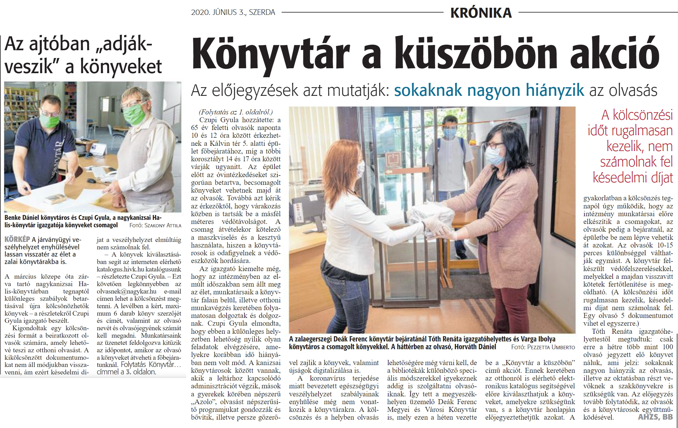Nyilvános 1686 | 2449 | Zalai Hírlap 2020. június 3. 128. szám 1,3 oldal - Könyvtár a küszöbön akció | A járványügyi veszélyhelyzet enyhülésével lassan visszatér az élet a zalai könyvtárakba is. A március közepe óta zárva tartó nagykanizsai Halis-könyvtárban tegnaptól különleges szabályok betartásával újra kölcsönözhetők könyvek - a részletekről Czupi Gyula igazgató beszélt. Kigondoltak egy kölcsönzési formát a beiratkozott olvasók számára, amely lehetővé teszi az otthoni olvasást. A kikölcsönzött dokumentumokat nem áll módjukban visszavenni, ám ezért késedelmi díjat a veszélyhelyzet elmúltáig nem számolnak fel. - A könyvek kiválasztásában segít az interneten elérhető katalogus.hivk.hu katalógusunk - részletezte Czupi Gyula. - Ezt követően legkönnyebben az olvasnek@nagykar.hu e-mail címen lehet a kölcsönzést megtenni. A levélben a kért, maximum 6 darab könyv szerzőjét és címét, valamint az olvasó nevét és olvasójegyének számát kell megadni. Munkatársaink az üzenetet feldolgozva kitűzik az időpontot, amikor az olvasó a könyveket átveheti a főbejáratunknál. Czupi Gyula hozzátette: a 65 év feletti olvasók naponta 10 és 12 óra között érkezhetnek a Kálvin tér 5. alatti épület főbejáratához, míg a többi korosztályt 14 és 17 óra között várják ugyanitt. Az épület előtt az óvintézkedéseket szigorúan betartva, becsomagolt könyveket vehetnek majd át az olvasók. Továbbá azt kérik az érkezőktől, hogy várakozás közben is tartsák be a másfél méteres védőtávolságot. A csomag átvételekor kötelező a maszkviselés és a kesztyű használata, hiszen a könyvtárosok is odafigyelnek a védőeszközök hordására. Az igazgató kiemelte még, hogy az intézményben az elmúlt időszakban sem állt meg az élet, munkatársaik a könyvtár falain belül, illetve otthoni munkavégzés keretében folyamatosan dolgoztak és dolgoznak. Czupi Gyula elmondta, hogy ebben a különleges helyzetben lehetőség nyílik olyan feladatok elvégzésére, amelyekre korábban idő hiányában nem volt mód. A kanizsai könyvtárosok között vannak, akik a leltárhoz kapcsolódó adminisztrációt végzik, mások a gyerekek körében népszerű „Azolo" olvasást népszerűsítő programjukat gondozzák és bővítik, illetve persze gőzerővel zajlik a könyvek, valamint újságok digitalizálása is. A koronavírus terjedése miatt bevezetett egészségügyi veszélyhelyzet szabályainak enyhülése még nem vonatkozik a könyvtárakra. A kölcsönzés és a helyben olvasás lehetőségére még várni kell, de a bibliotékák különböző speciális módszerekkel igyekeznek addig is szolgáltatni olvasóiknak. így tett a megyeszékhelyen üzemelő Deák Ferenc Megyei és Városi Könyvtár is, mely ezen a héten vezette be a „Könyvtár a küszöbön" című akciót. Ennek keretében az otthonról is elérhető elektronikus katalógus segítségével előre kiválaszthatjuk a könyveket, amelyekre szükségünk van, s a könyvtár honlapján előjegyeztethetjük azokat. A gyakorlatban a kölcsönzés tegnapól úgy működik, hogy az intézmény munkatársai előre elkészítik a csomagokat, az olvasók pedig a bejáratnál, az épületbe be nem lépve vehetik át azokat. Az olvasók 10-15 perces különbséggel válthatják egymást. A könyvtár felkészült védőfelszerelésekkel, melyekkel a majdan visszavitt kötetek fertőtlenítése is megoldható. (A kölcsönzési időt rugalmasan kezelik, késedelmi díjat nem számolnak fel. Egy olvasó 5 dokumentumot vihet el egyszerre.) Tóth Renáta igazgatóhelyettestől megtudtuk: csak erre a hétre több mint 100 olvasó jegyzett elő könyvet náluk, ami jelzi: sokaknak nagyon hiányzik az olvasás, illetve az oktatásban részt vevőknek a szakkönyvekre is szükségük van. Az előjegyzés tovább folytatódik, az olvasók és a könyvtárosok együttműködésével. AHZS, BB |