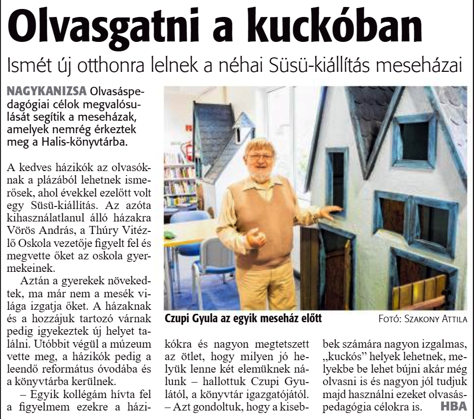 Nyilvános 1794 | 3263 | Zalai Hírlap 2020. június 17. 140. szám 16. oldal | Olvasgatni a kuckóban Ismét új otthonra lelnek a néhai Süsü-kiállítás meseházai NAGYKANIZSA Olvasáspedagógiai célok megvalósulását segítik a meseházak, amelyek nemrég érkeztek meg a Halis-könyvtárba. A kedves házikók az olvasóknak a plázából lehetnek ismerősek, ahol évekkel ezelőtt volt egy Süsü-kiállítás. Az azóta kihasználatlanul álló házakra Vörös András, a Thúry Vitézlő Oskola vezetője figyelt fel és megvette őket az oskola gyermekeinek. Aztán a gyerekek növekedtek, ma már nem a mesék világa izgatja őket. A házaknak és a hozzájuk tartozó várnak pedig igyekeztek új helyet találni. Utóbbit végül a múzeum vette meg, a házikók pedig a leendő református óvodába és a könyvtárba kerülnek. - Egyik kollégám hívta fel a figyelmem ezekre a házikókra és nagyon megtetszett az ötlet, hogy milyen jó helyük lenne két elemüknek nálunk - hallottuk Czupi Gyulától, a könyvtár igazgatójától. - Azt gondoltuk, hogy a kisebbek számára nagyon izgalmas, „kuckós" helyek lehetnek, melyekbe be lehet bújni akár még olvasni is és nagyon jól tudjuk majd használni ezeket olvasáspedagógia célokra is. HBA |