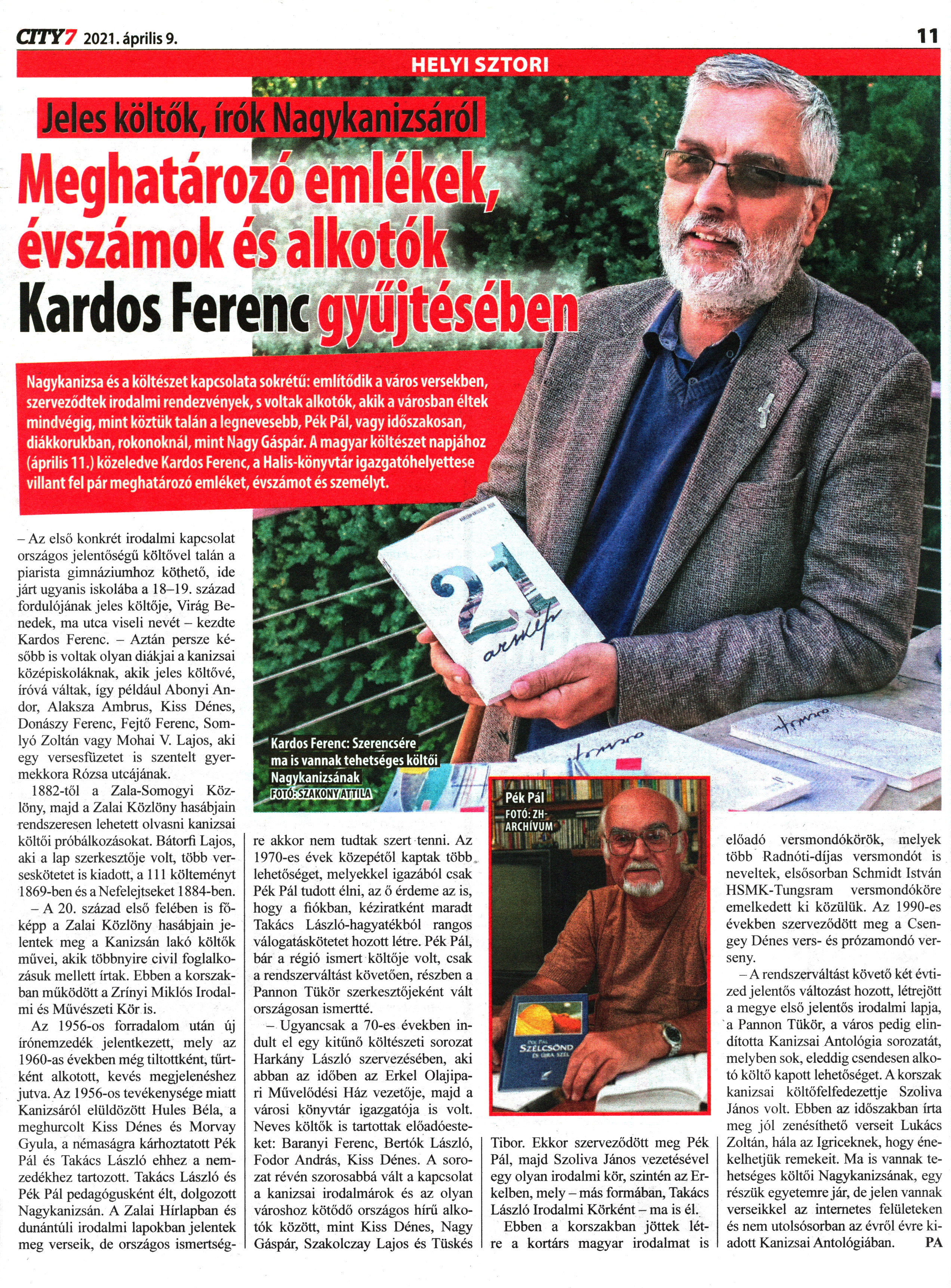 Nyilvános 1611 | 2611 | City7 2021. április 9. 3. szám 11. oldal | Jeles költők, írók Nagykanizsáról Meghatározó emlékek, évszámok és alkotók Kardos Ferenc gyűjtésében Nagykanizsa és a költészet kapcsolata sokrétű: említődik a város versekben, szerveződtek irodalmi rendezvények, s voltak alkotók, akik a városban éltek mindvégig, mint köztük talán a legnevesebb, Pék Pál, vagy időszakosan, diákkorukban, rokonoknál, mint Nagy Gáspár. A magyar költészet napjához (április 11.) közeledve Kardos Ferenc, a Halis-könyvtár igazgatóhelyettese villant fel pár meghatározó emléket, évszámot és személyt. - Az első konkrét irodalmi kapcsolat országos jelentőségű költővel talán a piarista gimnáziumhoz köthető, ide járt ugyanis iskolába a 18-19. század fordulójának jeles költője, Virág Benedek, ma utca viseli nevét - kezdte Kardos Ferenc. - Aztán persze később is voltak olyan diákjai a kanizsai középiskoláknak, akik jeles költővé, íróvá váltak, így például Abonyi Andor, Alaksza Ambrus, Kiss Dénes, Donászy Ferenc, Fejtő Ferenc, Somlyó Zoltán vagy Mohai V. Lajos, aki egy versesfuzetet is szentelt gyermekkora Rózsa utcájának. 1882-től a Zala-Somogyi Közlöny, majd a Zalai Közlöny hasábjain rendszeresen lehetett olvasni kanizsai költői próbálkozásokat. Bátorfi Lajos, aki a lap szerkesztője volt, több verseskötetet is kiadott, a 111 költeményt 1869-ben és a Nefelejtseket 1884-ben. - A 20. század első felében is főképp a Zalai Közlöny hasábjain jelentek meg a Kanizsán lakó költők művei, akik többnyire civil foglalkozásuk mellett írtak. Ebben a korszakban működött a Zrínyi Miklós Irodalmi és Művészeti Kör is. Az 1956-os forradalom után új írónemzedék jelentkezett, mely az 1960-as években még tiltottként, törtként alkotott, kevés megjelenéshez jutva. Az 1956-os tevékenysége miatt Kanizsáról elüldözött Hules Béla, a meghurcolt Kiss Dénes és Morvay Gyula, a némaságra kárhoztatott Pék Pál és Takács László ehhez a nemzedékhez tartozott. Takács László és Pék Pál pedagógusként élt, dolgozott Nagykanizsán. A Zalai Hírlapban és dunántúli irodalmi lapokban jelentek meg verseik, de országos ismertségre akkor nem tudtak szert tenni. Az 1970-es évek közepétől kaptak több lehetőséget, melyekkel igazából csak Pék Pál tudott élni, az ő érdeme az is, hogy a fiókban, kéziratként maradt Takács László-hagyatékból rangos válogatáskötetet hozott létre. Pék Pál, bár a régió ismert költője volt, csak a rendszerváltást követően, részben a Pannon Tükör szerkesztőjeként vált országosan ismertté. - Ugyancsak a 70-es években indult el egy kitűnő költészeti sorozat Harkány László szervezésében, aki abban az időben az Erkel Olajipari Művelődési Ház vezetője, majd a városi könyvtár igazgatója is volt. Neves költők is tartottak előadóesteket: Bárányi Ferenc, Bertók László, Fodor András, Kiss Dénes. A sorozat révén szorosabbá vált a kapcsolat a kanizsai irodalmárok és az olyan városhoz kötődő országos hírű alkotók között, mint Kiss Dénes, Nagy Gáspár, Szakolczay Lajos és Tüskés Tibor. Ekkor szerveződött meg Pék Pál, majd Szoliva János vezetésével egy olyan irodalmi kör, szintén az Erkelben, mely - más formában, Takács László Irodalmi Körként - ma is él. Ebben a korszakban jöttek létre a kortárs magyar irodalmat is előadó versmondókörök, melyek több Radnóti-díjas versmondót is neveltek, elsősorban Schmidt István HSMK-Tungsram versmondóköre emelkedett ki közülük. Az 1990-es években szerveződött meg a Csen-gey Dénes vers- és prózamondó verseny. - A rendszerváltást követő két évtized jelentős változást hozott, létrejött a megye első jelentős irodalmi lapja, a Pannon Tükör, a város pedig elindította Kanizsai Antológia sorozatát, melyben sok, eleddig csendesen alkotó költő kapott lehetőséget. A korszak kanizsai költőfelfedezettje Szoliva János volt. Ebben az időszakban írta meg jól zenésíthető verseit Lukács Zoltán, hála az Igriceknek, hogy énekelhetjük remekeit. Ma is vannak tehetséges költői Nagykanizsának, egy részük egyetemre jár, de jelen vannak verseikkel az internetes felületeken és nem utolsósorban az évről évre kiadott Kanizsai Antológiában. PA |