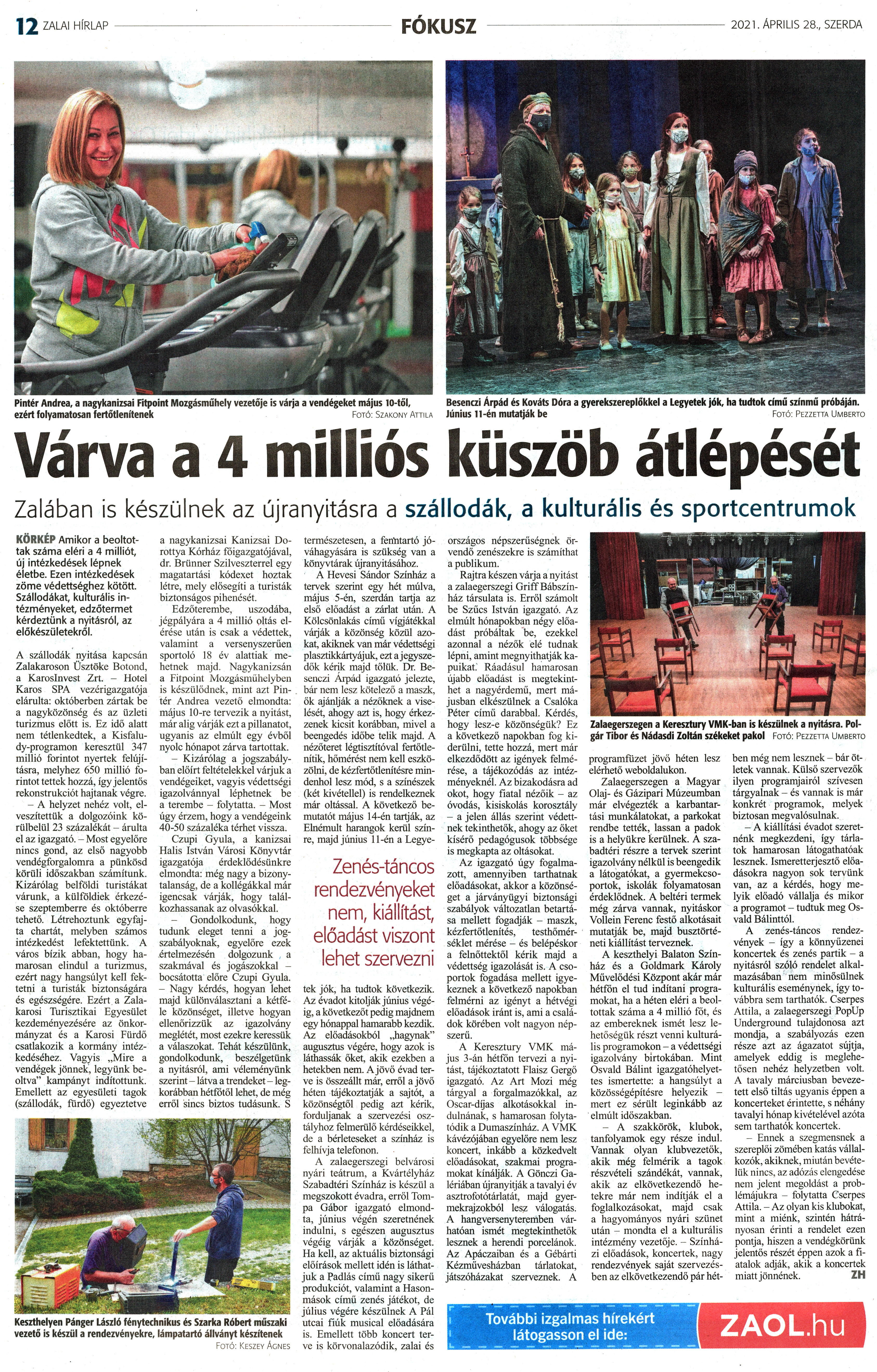 Nyilvános 1295 | 2025 | Zalai Hírlap 2021. április 28. 97. szám 12. oldal | Várva a 4 milliós küszöb átlépését Zalában is készülnek az újranyitásra a szállodák, a kulturális és sportcentrumok KÖRKÉP Amikor a beoltottak száma eléri a 4 milliót, új intézkedések lépnek életbe. Ezen intézkedések zöme védettséghez kötött. Szállodákat, kulturális intézményeket, edzőtermet kérdeztünk a nyitásról, az előkészületekről. A szállodák nyitása kapcsán Zalakaroson Üsztöke Botond, a Karoslnvest Zrt. - Hotel Karos SPA vezérigazgatója elárulta: októberben zártak be a nagyközönség és az üzleti turizmus előtt is. Ez idő alatt nem tétlenkedtek, a Kisfaludy-programon keresztül 347 millió forintot nyertek felújításra, melyhez 650 millió forintot tettek hozzá, így jelentős rekonstrukciót hajtanak végre. - A helyzet nehéz volt, elveszítettük a dolgozóink körülbelül 23 százalékát - árulta el az igazgató. - Most egyelőre nincs gond, az első nagyobb vendégforgalomra a pünkösd körüli időszakban számítunk. Kizárólag belföldi turistákat várunk, a külföldiek érkezése szeptemberre és októberre tehető. Létrehoztunk egyfajta chartát, melyben számos intézkedést lefektettünk. A város bízik abban, hogy hamarosan elindul a turizmus, ezért nagy hangsúlyt kell fektetni a turisták biztonságára és egészségére. Ezért a Zalakarosi Turisztikai Egyesület kezdeményezésére az önkormányzat és a Karosi Fürdő csatlakozik a kormány intézkedéséhez. Vagyis „Mire a vendégek jönnek, legyünk beoltva" kampányt indítottunk. Emellett az egyesületi tagok (szállodák, fürdő) egyeztetve a nagykanizsai Kanizsai Dorottya Kórház főigazgatójával, dr. Brünner Szilveszterrel egy magatartási kódexet hoztak létre, mely elősegíti a turisták biztonságos pihenését. Edzőterembe, uszodába, jégpályára a 4 millió oltás elérése után is csak a védettek, valamint a versenyszerűen sportoló 18 év alattiak mehetnek majd. Nagykanizsán a Fitpoint Mozgásmühelyben is készülődnek, mint azt Pintér Andrea vezető elmondta: május 10-re tervezik a nyitást, már alig várják ezt a pillanatot, ugyanis az elmúlt egy évből nyolc hónapot zárva tartottak. - Kizárólag a jogszabályban előírt feltételekkel várjuk a vendégeiket, vagyis védettségi igazolvánnyal léphetnek be a terembe - folytatta. - Most úgy érzem, hogy a vendégeink 40-50 százaléka térhet vissza. Czupi Gyula, a kanizsai Halis István Városi Könyvtár igazgatója érdeklődésünkre elmondta: még nagy a bizonytalanság, de a kollégákkal már igencsak várják, hogy találkozhassanak az olvasókkal. - Gondolkodunk, hogy tudunk eleget tenni a jogszabályoknak, egyelőre ezek értelmezésén dolgozunk a szakmával és jogászokkal - bocsátotta előre Czupi Gyula. - Nagy kérdés, hogyan lehet majd különválasztani a kétféle közönséget, illetve hogyan ellenőrizzük az igazolvány meglétét, most ezekre keressük a válaszokat. Tehát készülünk, gondolkodunk, beszélgetünk a nyitásról, ami véleményünk szerint - látva a trendeket - legkorábban hétfőtől lehet, de még erről sincs biztos tudásunk. S természetesen, a fenntartó jóváhagyására is szükség van a könyvtárak újranyitásához. A Hevesi Sándor Színház a tervek szerint egy hét múlva, május 5-én, szerdán tartja az első előadást a zárlat után. A Kölcsönlakás című vígjátékkal várják a közönség közül azokat, akiknek van már védettségi plasztikkártyájuk, ezt a jegyszedők kérik majd tőlük. Dr. Besenczi Árpád igazgató jelezte, bár nem lesz kötelező a maszk, ők ajánlják a nézőknek a viselését, ahogy azt is, hogy érkezzenek kicsit korábban, mivel a beengedés időbe telik majd. A nézőteret légtisztítóval fertőtlenítik, hőmérést nem kell eszközölni, de kézfertőtlenítésre mindenhol lesz mód, s a színészek (két kivétellel) is rendelkeznek már oltással. A következő bemutatót május 14-én tartják, az Elnémult harangok kerül színre, majd június 11-én a Legyetek jók, ha tudtok következik. Az évadot kitolják június végéig, a következőt pedig majdnem egy hónappal hamarabb kezdik. Az előadásokból „hagynak" augusztus végére, hogy azok is láthassák őket, akik ezekben a hetekben nem. A jövő évad terve is összeállt már, erről a jövő héten tájékoztatják a sajtót, a közönségtől pedig azt kérik, forduljanak a szervezési osztályhoz felmerülő kérdéseikkel, de a bérleteseket a színház is felhívja telefonon. A zalaegerszegi belvárosi nyári teátrum, a Kvártélyház Szabadtéri Színház is készül a megszokott évadra, erről Tompa Gábor igazgató elmondta, június végén szeretnének indulni, s egészen augusztus végéig várják a közönséget. Ha kell, az aktuális biztonsági előírások mellett idén is láthatjuk a Padlás című nagy sikerű produkciót, valamint a Hasonmások című zenés játékot, de július végére készülnek A Pál utcai fiúk musical előadására is. Emellett több koncert terve is körvonalazódik, zalai és országos népszerűségnek örvendő zenészekre is számíthat a publikum. Rajtra készen várja a nyitást a zalaegerszegi Griff Bábszínház társulata is. Erről számolt be Szűcs István igazgató. Az elmúlt hónapokban négy előadást próbáltak be, ezekkel azonnal a nézők élé tudnak lépni, amint megnyithatják kapuikat." Ráadásul hamarosan újabb előadást is megtekinthet a nagyérdemű, mert májusban elkészülnek a Csalóka Péter című darabbal. Kérdés, hogy lesz-e közönségük? Ez a következő napokban fog kiderülni, tette hozzá, mert már elkezdődött az igények felmérése, a tájékozódás az intézményeknél. Az bizakodásra ad okot, hogy fiatal nézőik - az óvodás, kisiskolás korosztály - a jelen állás szerint védettnek t