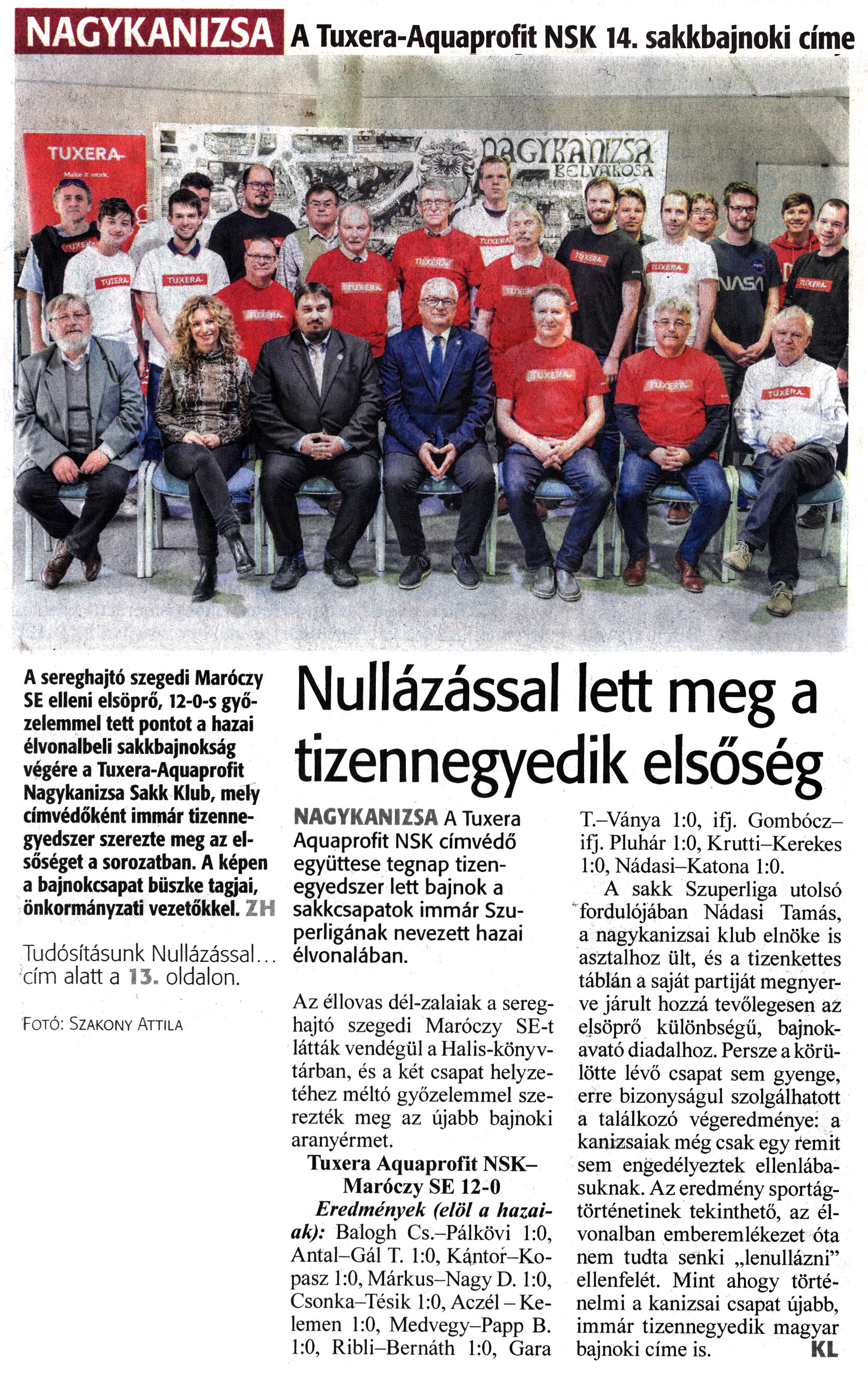 Nyilvános 1163 | 1467 | Zalai Hírlap 2022. április 11. 84. szám 1, 13. oldal | A Tuxera-Aquaprofit NSK 14. sakkbajnoki címe A sereghajtó szegedi Maróczy SE elleni elsöprő, 12-0-s győzelemmel tett pontot a hazai élvonalbeli sakkbajnokság végére a Tuxera-Aquaprofit Nagykanizsa Sakk Klub, mely címvédőként immár tizenne-gyedszer szerezte meg az elsőséget a sorozatban. A képen a bajnokcsapat büszke tagjai, önkormányzati vezetőkkel. ZH Tudósításunk Nullázással... cím alatt a 13. oldalon. Fotó: Szakony Attila Nullázással lett meg a tizennegyedik elsőség NAGYKANIZSA A Tuxera Aquaprofit NSK címvédő együttese tegnap tizenegyedszer lett bajnok a sakkcsapatok immár Szuperligának nevezett hazai élvonalában. Az éllovas dél-zalaiak a sereghajtó szegedi Maróczy SE-t látták vendégül a Halis-köny v-tárban, és a két csapat helyzetéhez méltó győzelemmel szerezték meg az újabb bajnoki aranyérmet. Tuxera Aquaprofit NSK-Maróczy SE 12-0 Eredmények (elöl a hazaiak): Balogh Cs.-Pálkövi 1:0, Antal-Gál T. 1:0, Kántor-Kopasz 1:0, Márkus-Nagy D. 1:0, Csonka-Tésik 1:0, Aczél - Kelemen 1:0, Medvegy-Papp B. 1:0, Ribli-Bernáth 1:0, Gara T.-Ványa 1:0, ifj. Gombócz-ifj. Pluhár 1:0, Krutti-Kerekes 1:0, Nádasi-Katona 1:0. A sakk Szuperliga utolsó fordulójában Nádasi Tamás, a nagykanizsai klub elnöke is asztalhoz ült, és a tizenkettes táblán a saját partiját megnyerve járult hozzá tevőlegesen az elsöprő különbségű, bajnokavató diadalhoz. Persze a körülötte lévő csapat sem gyenge, erre bizonyságul szolgálhatott a találkozó végeredménye: a kanizsaiak még csak egy remit sem engedélyeztek ellenlábasuknak. Az eredmény sportágtörténetinek tekinthető, az élvonalban emberemlékezet óta nem tudta senki „lenullázni" ellenfelét. Mint ahogy történelmi a kanizsai csapat újabb, immár tizennegyedik magyar bajnoki címe is. KL |