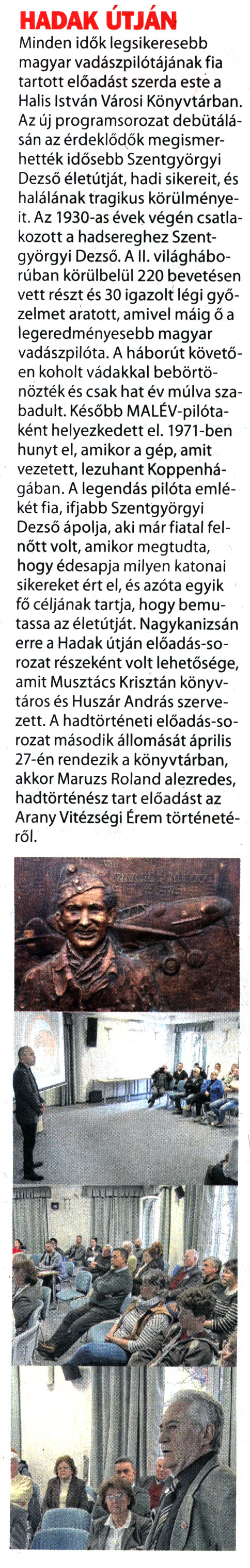 Nyilvános 1287 | 1664 | Kanizsa 2022. április 8. 7. szám 3. oldal | HADAK ÚTJÁN Minden idők legsikeresebb magyar vadászpilótájának fia tartott előadást szerda este a Halis István Városi Könyvtárban. Az új programsorozat debütálásán az érdeklődők megismerhették idősebb Szentgyörgyi Dezső életútját, hadi sikereit, és halálának tragikus körülményeit. Az 1930-as évek végén csatlakozott a hadsereghez Szentgyörgyi Dezső. A II. világháborúban körülbelül 220 bevetésen vett részt és 30 igazolt légi győzelmet aratott, amivel máig ő a legeredményesebb magyar vadászpilóta. A háborút követően koholt vádakkal bebörtönözték és csak hat év múlva szabadult. Később MALÉV-pilótaként helyezkedettel. 1971-ben hunyt el, amikor a gép, amit vezetett, lezuhant Koppenhágában. A legendás pilóta emlékét fia, ifjabb Szentgyörgyi Dezső ápolja, aki már fiatal felnőtt volt, amikor megtudta, hogy édesapja milyen katonai sikereket ért el, és azóta egyik fő céljának tartja, hogy bemutassa az életútját. Nagykanizsán erre a Hadak útján előadás-sorozat részeként volt lehetősége, amit Musztács Krisztán könyvtáros és Huszár András szervezett. A hadtörténeti előadás-sorozat második állomását április 27-én rendezik a könyvtárban, akkor Maruzs Roland alezredes, hadtörténész tart előadást az Arany Vitézségi Érem történetéről. |