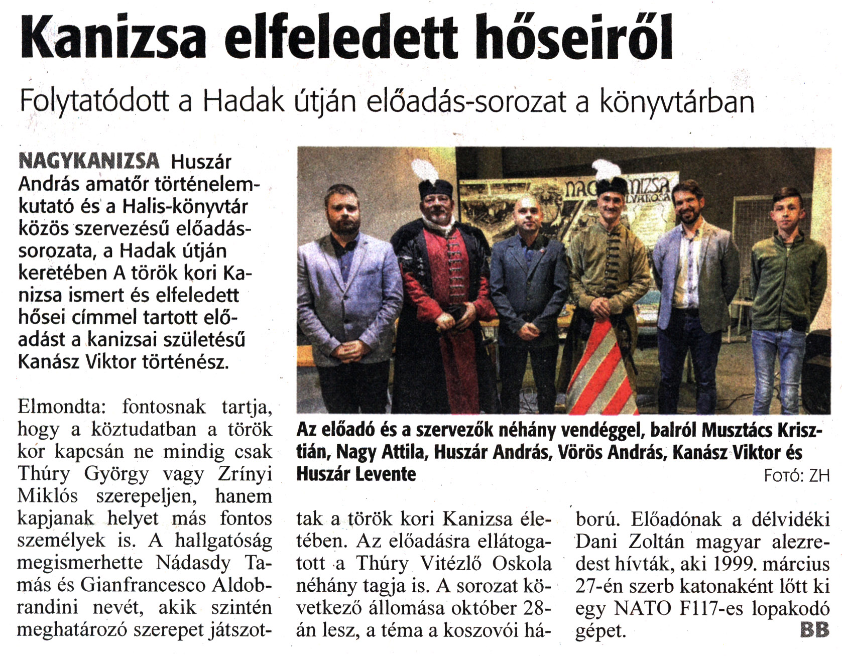 Nyilvános 1537 | 1733 | Zalai Hírlap 2022. október 19. 244. szám 3. oldal | Kanizsa elfeledett hőseiről Folytatódott a Hadak útján előadás-sorozat a könyvtárban NAGYKANIZSA Huszár András amatőr történelemkutató és a Halis-könyvtár közös szervezésű előadássorozata, a Hadak útján keretében A török kori Kanizsa ismert és elfeledett hősei címmel tartott előadást a kanizsai születésű Kanász Viktor történész. Elmondta: fontosnak tartja, hogy a köztudatban a török kor kapcsán ne mindig csak Thúry György vagy Zrínyi Miklós szerepeljen, hanem kapjanak helyet más fontos személyek is. A hallgatóság megismerhette Nádasdy Tamás és Gianfrancesco Aldobrandini nevét, akik szintén meghatározó szerepet játszottak a török kori Kanizsa életében. Az előadásra ellátogatott a Thúry Vitézlő Oskola néhány tagja is. A sorozat következő állomása október 28-án lesz, a téma a koszovói háború. Előadónak a délvidéki Dani Zoltán magyar alezredest hívták, aki 1999. március 27-én szerb katonaként lőtt ki egy NATO F117-es lopakodó gépet. BB Az előadó és a szervezők néhány vendéggel, balról Musztács Krisztián, Nagy Attila, Huszár András, Vörös András, Kanász Viktor és Huszár Levente Fotó: ZH |