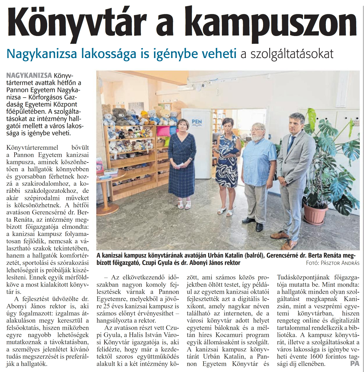 Nyilvános 895 | 1266 | Zalai Hírlap 2024. szeptember 3. 205. szám 2. oldal | Könyvtár a kampuszon Nagykanizsa lakossága is igénybe veheti a szolgáltatásokat NAGYKANIZSA Könyvtártermet avattak hétfőn a Pannon Egyetem Nagykanizsa - Körforgásos Gazdaság Egyetemi Központ főépületében. A szolgáltatásokat az intézmény hallgatói mellett a város lakossága is igénybe veheti. Könyvtárteremmel bővült a Pannon Egyetem kanizsai kampusza, aminek köszönhetően a hallgatók könnyebben és gyorsabban férhetnek hozzá a szakirodalomhoz, a korábbi szakdolgozatokhoz, de akár szépirodalmi műveket is kölcsönözhetnek. A hétfői avatáson Gerencsérné dr. Berta Renáta, az intézmény megbízott főigazgatója elmondta: a kanizsai kampusz folyamatosan fejlődik, nemcsak a választható szakok tekintetében, hanem a hallgatók komfortérzetét, sportolási és szórakozási lehetőségeit is próbálják kiszélesíteni. Ennek egyik mérföldköve a most kialakított könyvtár is. A fejlesztést üdvözölte dr. Abonyi János rektor is, aki úgy fogalmazott: izgalmas átalakuláson megy keresztül a felsőoktatás, hiszen miközben egyre nagyobb lehetőségek mutatkoznak a távoktatásban, a személyes jelenlétet kívánó tudás megszerzését is preferálják a hallgatók. - Az elkövetkezendő időszakban nagyon komoly fejlesztések várnak a Pannon Egyetemre, melyekből a jövőre 25 éves kanizsai kampusz is számos előnyt érvényesíthet -hangsúlyozta a rektor. Az avatáson részt vett Czupi Gyula, a Halis István Városi Könyvtár igazgatója is, aki felidézte, hogy már a kezdetektől szoros együttműködés alakult ki a két intézmény között, ami számos közös projektben öltött testet, így például az egyetem kanizsai oktatói fejlesztették azt a digitális lexikont, amely nagykar néven található az interneten, de a városi könyvtár adott helyet egyetemi báloknak és a méltán híres Kocamuri program egyik állomásaként is szolgált. A kanizsai kampusz könyvtárát Urbán Katalin, a Pannon Egyetem Könyvtár és Tudásközpontjának főigazgatója mutatta be. Mint mondta: a hallgatók minden olyan szolgáltatást megkapnak Kanizsán, mint a veszprémi egyetemi könyvtárban, hiszen rengeteg online és digitalizált tartalommal rendelkezik a bibliotéka. A kampusz könyvtárát, illetve a szolgáltatásokat a város lakossága is igénybe veheti évente 1600 forintos tagsági díj ellenében. PA A kanizsai kampusz könyvtárának avatóján Urbán Katalin (balról), Gerencsérné dr. Berta Renáta megbízott főigazgató, Czupi Gyula és dr. Abonyi János rektor Fotó: Pásztor András |