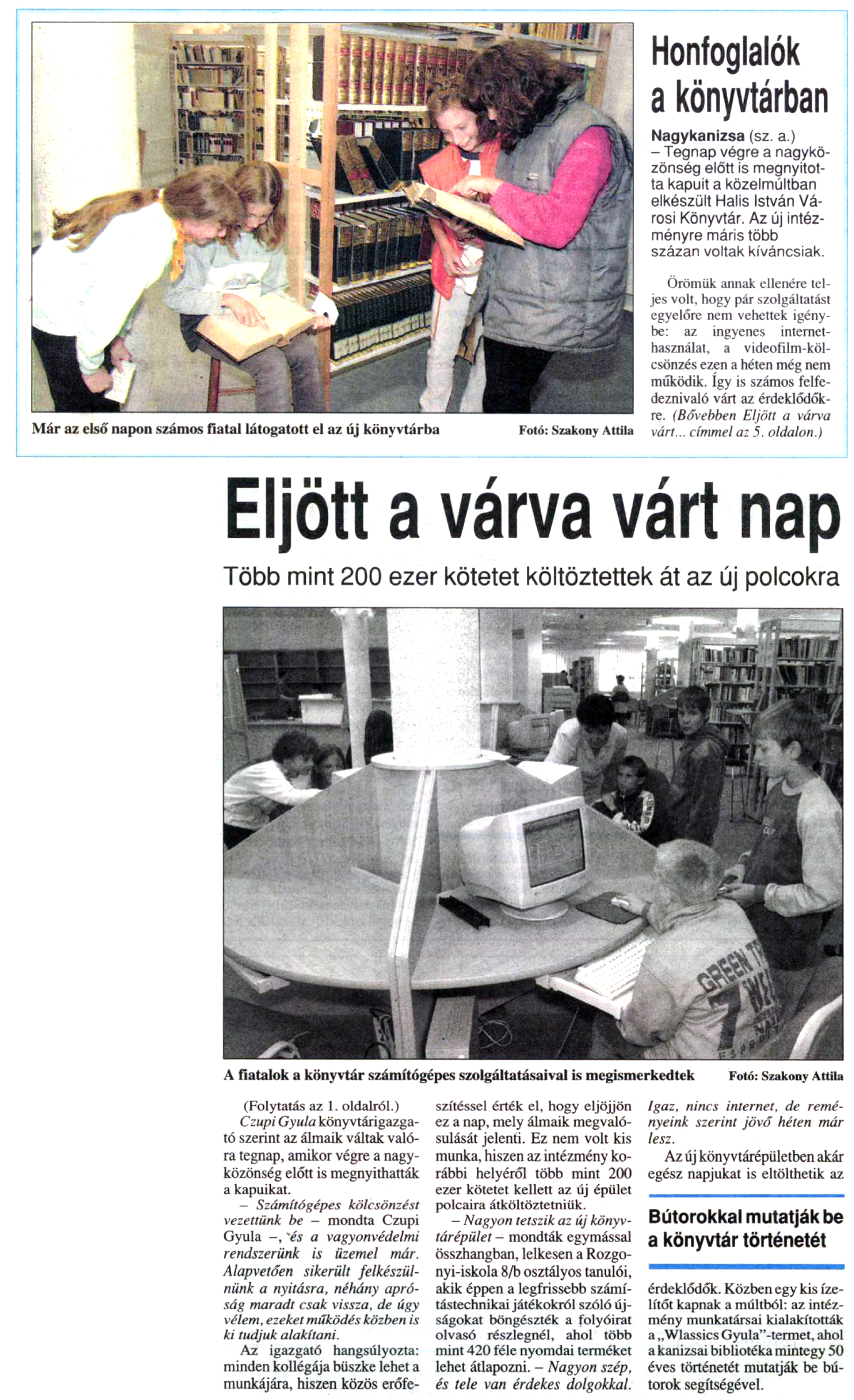 Nyilvános 874 | 990 | Zalai Hírlap 2001. október 2. 230. szám 1, 5. oldal | Már az első napon számos fiatal látogatott el az új könyvtárba Fotó: Szakony Attila Honfoglalók a könyvtárban Nagykanizsa (sz. a.) - Tegnap végre a nagyközönség előtt is megnyitotta kapuit a közelmúltban elkészült Halis István Városi Könyvtár. Az új intézményre máris több százan voltak kíváncsiak. Örömük annak ellenére teljes volt, hogy pár szolgáltatást egyelőre nem vehettek igénybe: az ingyenes internethasználat, a videofilm-kölcsönzés ezen a héten még nem működik. így is számos felfe-deznivaló várt az érdeklődőkre. (Bővebben Eljött a várva várt... címmel az 5. oldalon.) Eljött a várva várt nap Több mint 200 ezer kötetet költöztettek át az új polcokra A fiatalok a könyvtár számítógépes szolgáltatásaival is megismerkedtek Fotó: Szakony Attila (Folytatás az 1. oldalról.) Czupi Gyula könyvtárigazgató szerint az álmaik váltak valóra tegnap, amikor végre a nagyközönség előtt is megnyithatták a kapuikat. - Számítógépes kölcsönzést vezettünk be - mondta Czupi Gyula -, és a vagyonvédelmi rendszerünk is üzemel már. Alapvetően sikerült felkészülnünk a nyitásra, néhány apróság maradt csak vissza, de úgy vélem, ezeket működés közben is ki tudjuk alakítani. Az igazgató hangsúlyozta: minden kollégája büszke lehet a munkájára, hiszen közös erőfeszítéssel érték el, hogy eljöjjön ez a nap, mely álmaik megvalósulását jelenti. Ez nem volt kis munka, hiszen az intézmény korábbi helyéről több mint 200 ezer kötetet kellett az új épület polcaira átköltöztetniük. — Nagyon tetszik az új könyvtárépület - mondták egymással összhangban, lelkesen a Rozgonyi-iskola 8/b osztályos tanulói, akik éppen a legfrissebb számítástechnikai játékokról szóló újságokat böngészték a folyóirat olvasó részlegnél, ahol több mint 420 féle nyomdai terméket lehet átlapozni. - Nagyon szép, és tele van érdekes dolgokkal. Igaz, nincs internet, de reményeink szerint jövő héten már lesz. Az új könyvtárépületben akár egész napjukat is eltölthetik az érdeklődők. Közben egy kis ízelítőt kapnak a múltból: az intézmény munkatársai kialakították a „Wlassics Gyula"-termet, ahol a kanizsai bibliotéka mintegy 50 éves történetét mutatják be bútorok segítségével. |