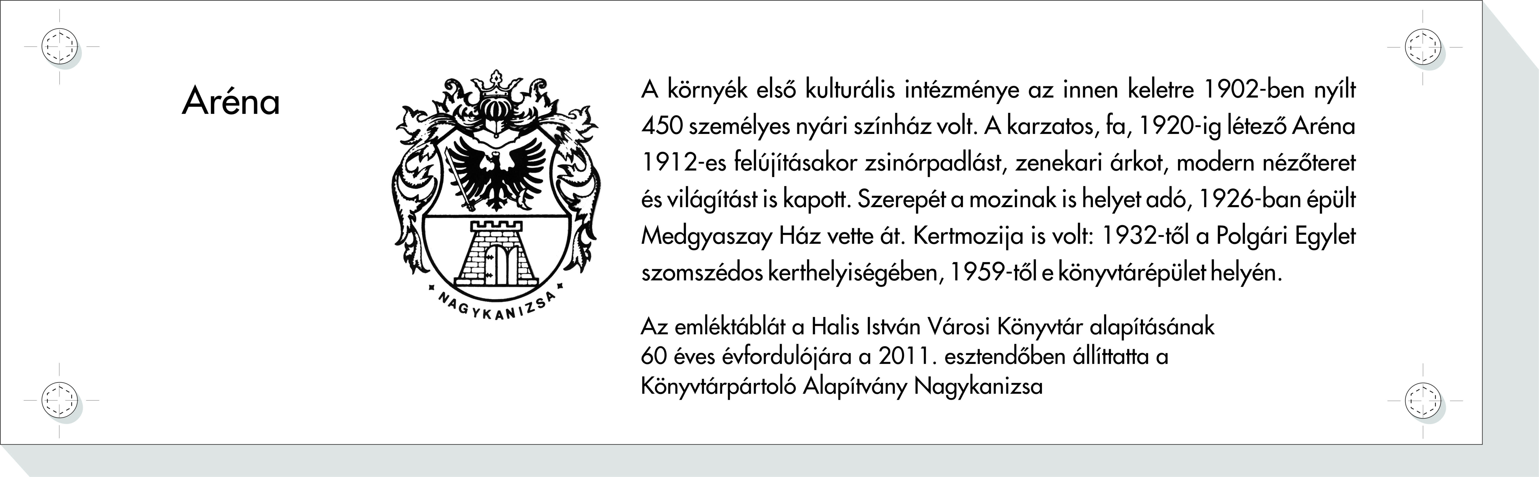 Nyilvános 1892 | 4637 | Rövid leírás | Teljes leírás (665 B) | Aréna A környék első kulturális intézménye az innen keletre 1902-ben nyílt 450 személyes nyári színház volt. A karzatos, fa, 1920-ig létező Aréna 1912-es felújításakor zsinórpadlást, zenekari árkot, modern nézőteret és világítást is kapott. Szerepét a mozinak is helyet adó, 1926-ban épült Medgyaszay Ház vette át. Kertmozija is volt: 1932-től a Polgári Egylet szomszédos kerthelyiségében, 1959-től e könyvtárépület helyén. Az emléktáblát a Halis István Városi Könyvtár alapításának 60 éves évfordulójára a 2011. esztendőben állíttatta a Könyvtárpártoló Alapítvány Nagykanizsa |