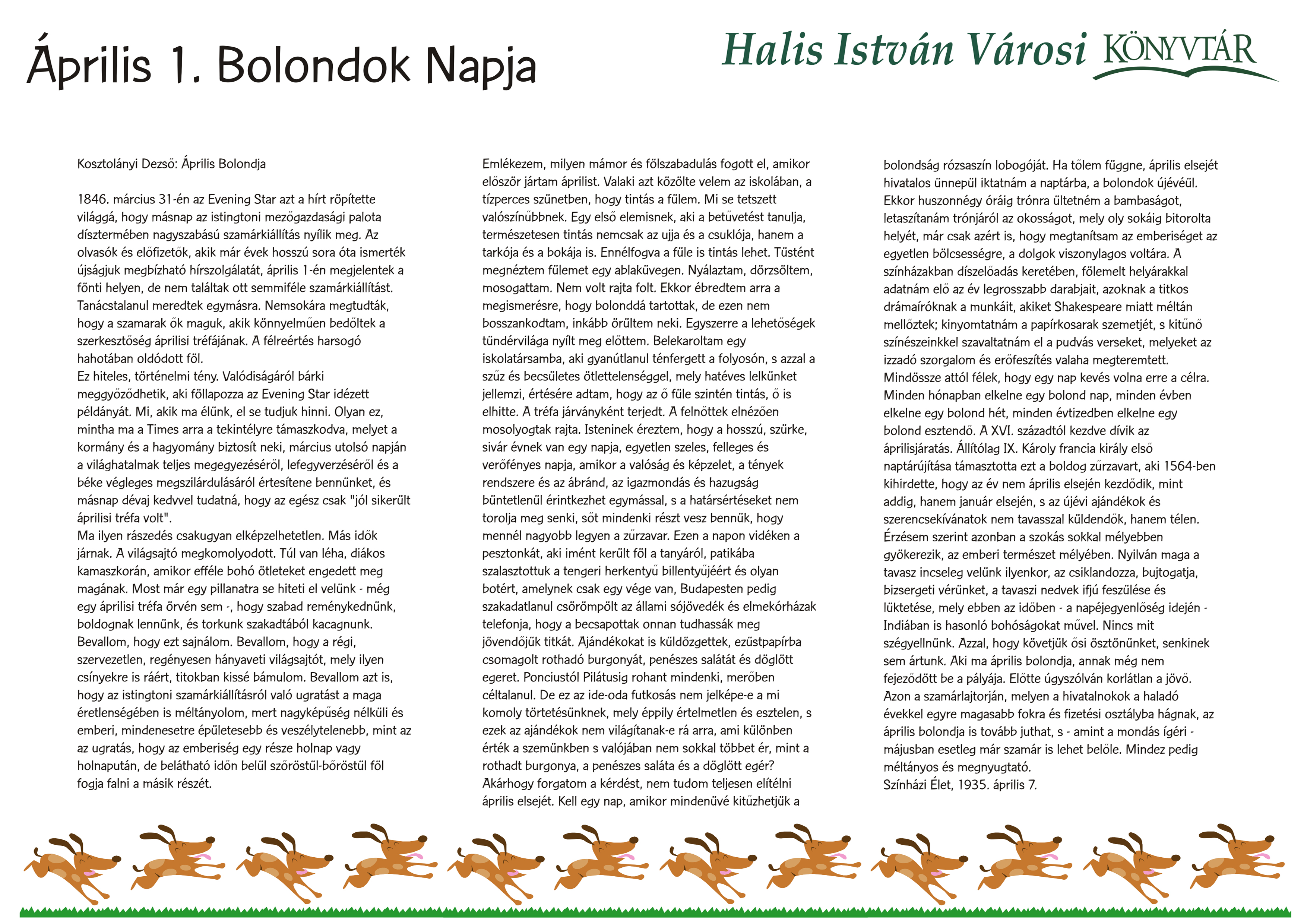Nyilvános 1211 | 3738 | Április 1 - Bolondok Napja | Kosztolányi Dezső: Április Bolondja 1846. március 31-én az Evening Star azt a hírt röpítette világgá, hogy másnap az istingtoni mezőgazdasági palota dísztermében nagyszabású szamárkiállítás nyílik meg. Az olvasók és előfizetők, akik már évek hosszú sora óta ismerték újságjuk megbízható hírszolgálatát, április 1-én megjelentek a fönti helyen, de nem találtak ott semmiféle szamárkiállítást. Tanácstalanul meredtek egymásra. Nemsokára megtudták, hogy a szamarak ők maguk, akik könnyelműen bedőltek a szerkesztőség áprilisi tréfájának. A félreértés harsogó hahotában oldódott föl. Ez hiteles, történelmi tény. Valódiságáról bárki meggyőződhetik, aki föllapozza az Evening Star idézett példányát. Mi, akik ma élünk, el se tudjuk hinni. Olyan ez, mintha ma a Times arra a tekintélyre támaszkodva, melyet a kormány és a hagyomány biztosít neki, március utolsó napján a világhatalmak teljes megegyezéséről, lefegyverzéséről és a béke végleges megszilárdulásáról értesítene bennünket, és másnap dévaj kedvvel tudatná, hogy az egész csak "jól sikerült áprilisi tréfa volt". Ma ilyen rászedés csakugyan elképzelhetetlen. Más idők járnak. A világsajtó megkomolyodott. Túl van léha, diákos kamaszkorán, amikor efféle bohó ötleteket engedett meg magának. Most már egy pillanatra se hiteti el velünk - még egy áprilisi tréfa örvén sem -, hogy szabad reménykednünk, boldognak lennünk, és torkunk szakadtából kacagnunk. Bevallom, hogy ezt sajnálom. Bevallom, hogy a régi, szervezetlen, regényesen hányaveti világsajtót, mely ilyen csínyekre is ráért, titokban kissé bámulom. Bevallom azt is, hogy az istingtoni szamárkiállításról való ugratást a maga éretlenségében is méltányolom, mert nagyképűség nélküli és emberi, mindenesetre épületesebb és veszélytelenebb, mint az az ugratás, hogy az emberiség egy része holnap vagy holnapután, de belátható időn belül szőröstül-bőröstül föl fogja falni a másik részét. Emlékezem, milyen mámor és fölszabadulás fogott el, amikor először jártam áprilist. Valaki azt közölte velem az iskolában, a tízperces szünetben, hogy tintás a fülem. Mi se tetszett valószínűbbnek. Egy első elemisnek, aki a betűvetést tanulja, természetesen tintás nemcsak az ujja és a csuklója, hanem a tarkója és a bokája is. Ennélfogva a füle is tintás lehet. Tüstént megnéztem fülemet egy ablaküvegen. Nyálaztam, dörzsöltem, mosogattam. Nem volt rajta folt. Ekkor ébredtem arra a megismerésre, hogy bolonddá tartottak, de ezen nem bosszankodtam, inkább örültem neki. Egyszerre a lehetőségek tündérvilága nyílt meg előttem. Belekaroltam egy iskolatársamba, aki gyanútlanul ténfergett a folyosón, s azzal a szűz és becsületes ötlettelenséggel, mely hatéves lelkünket jellemzi, értésére adtam, hogy az ő füle szintén tintás, ő is elhitte. A tréfa járványként terjedt. A felnőttek elnézően mosolyogtak rajta. Isteninek éreztem, hogy a hosszú, szürke, sivár évnek van egy napja, egyetlen szeles, felleges és verőfényes napja, amikor a valóság és képzelet, a tények rendszere és az ábránd, az igazmondás és hazugság büntetlenül érintkezhet egymással, s a határsértéseket nem torolja meg senki, sőt mindenki részt vesz bennük, hogy mennél nagyobb legyen a zűrzavar. Ezen a napon vidéken a pesztonkát, aki imént került föl a tanyáról, patikába szalasztottuk a tengeri herkentyű billentyűjéért és olyan botért, amelynek csak egy vége van, Budapesten pedig szakadatlanul csörömpölt az állami sójövedék és elmekórházak telefonja, hogy a becsapottak onnan tudhassák meg jövendőjük titkát. Ajándékokat is küldözgettek, ezüstpapírba csomagolt rothadó burgonyát, penészes salátát és döglött egeret. Ponciustól Pilátusig rohant mindenki, merőben céltalanul. De ez az ide-oda futkosás nem jelképe-e a mi komoly törtetésünknek, mely éppily értelmetlen és esztelen, s ezek az ajándékok nem világítanak-e rá arra, ami különben érték a szemünkben s valójában nem sokkal többet ér, mint a rothadt burgonya, a penészes saláta és a döglött egér? Akárhogy forgatom a kérdést, nem tudom teljesen elítélni április elsejét. Kell egy nap, amikor mindenüvé kitűzhetjük a bolondság rózsaszín lobogóját. Ha tőlem függne, április elsejét hivatalos ünnepül iktatnám a naptárba, a bolondok újévéül. Ekkor huszonnégy óráig trónra ültetném a bambaságot, letaszítanám trónjáról az okosságot, mely oly sokáig bitorolta helyét, már csak azért is, hogy megtanítsam az emberiséget az egyetlen bölcsességre, a dolgok viszonylagos voltára. A színházakban díszelőadás keretében, fölemelt helyárakkal adatnám elő az év legrosszabb darabjait, azoknak a titkos drámaíróknak a munkáit, akiket Shakespeare miatt méltán mellőztek; kinyomtatnám a papírkosarak szemetjét, s kitűnő színészeinkkel szavaltatnám el a pudvás verseket, melyeket az izzadó szorgalom és erőfeszítés valaha megteremtett. Mindössze attól félek, hogy egy nap kevés volna erre a célra. Minden hónapban elkelne egy bolond nap, minden évben elkelne egy bolond hét, minden évtizedben elkelne egy bolond esztendő. A XVI. századtól kezdve dívik az áprilisjáratás. Állítólag IX. Károly francia király első naptárújítása támasztotta ezt a boldog zűrzavart, aki 1564-ben kihirdette, hogy az év nem április elsején kezdődik, mint addig, hanem január elsején, s az újévi ajándékok és szerencsekívánatok nem tavasszal küldendők, hanem télen. Érzésem szerint azonban a szokás sokkal mélyebben gyökerezik, az emberi természet mélyében. Nyilván maga a tavasz incseleg velünk ilyenkor, az csiklandozza, bujtogatja, bizs