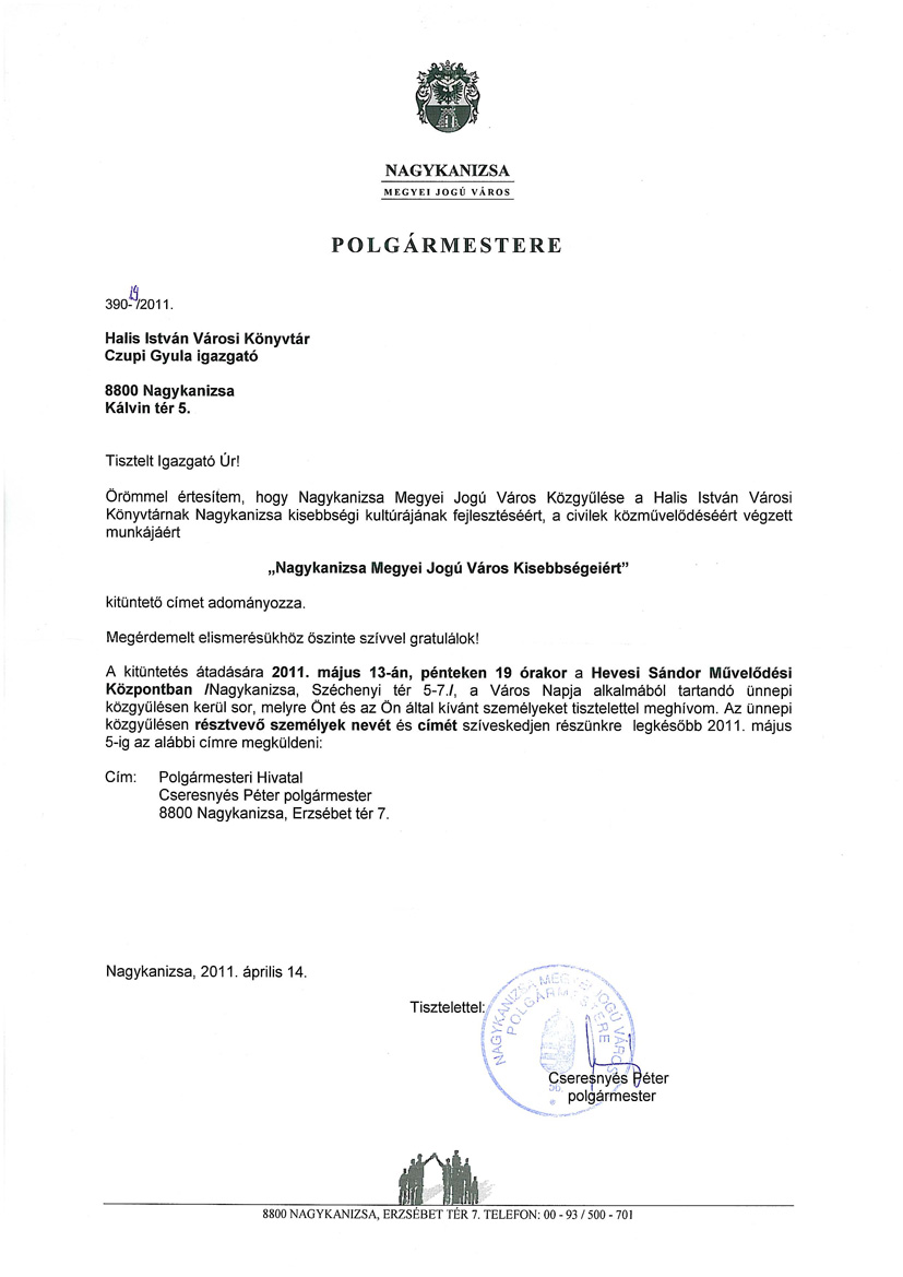 Nyilvános 1406 | 3274 | NAGYKANIZSA | MEGYEI JOGÚ VÁROS POLGÁRMESTERE 390-19/2011. Halis István Városi Könyvtár Czupi Gyula igazgató 8800 Nagykanizsa Kálvin tér 5. Tisztelt Igazgató Úr! Örömmel értesítem, hogy Nagykanizsa Megyei Jogú Város Közgyűlése a Halis István Városi Könyvtárnak Nagykanizsa kisebbségi kultúrájának fejlesztéséért, a civilek közművelődéséért végzett munkájáért „Nagykanizsa Megyei Jogú Város Kisebbségeiért” kitüntető címet adományozza. Megérdemelt elismerésükhöz őszinte szívvel gratulálok! A kitüntetés átadására 2011. május 13-án, pénteken 19 órakor a Hevesi Sándor Művelődési Központban /Nagykanizsa, Széchenyi tér 5-7./, a Város Napja alkalmából tartandó ünnepi közgyűlésen kerül sor, melyre Önt és az Ön által kívánt személyeket tisztelettel meghívom. Az ünnepi közgyűlésen résztvevő személyek nevét és címét szíveskedjen részünkre legkésőbb 2011. május 5-ig az alábbi címre megküldeni: Cím: Polgármesteri Hivatal Cseresnyés Péter polgármester 8800 Nagykanizsa, Erzsébet tér 7. Nagykanizsa, 2011. április 14. Tisztelettel: Cseresnyés Péter polgármester |