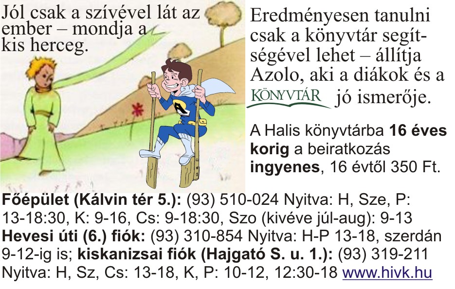 Nyilvános 1173 | 2612 | Jól csak a szívével lát az ember – mondja a kis herceg. | Eredményesen tanulni csak a könyvtár segítségével lehet – állítja Azolo, aki a diákok és a könyvtár jó ismerője. A Halis könyvtárba 16 éves korig a beiratkozás ingyenes, 16 évtől 350 Ft. Főépület (Kálvin tér 5.): (93) 510-024 Nyitva: H, Sze, P: 13-18:30, K: 9-16, Cs: 9-18:30, Szo (kivéve júl-aug): 9-13 Hevesi úti (6.) fiók: (93) 310-854 Nyitva: H-P 13-18, szerdán 9-12-ig is; kiskanizsai fiók (Hajgató S. u. 1.): (93) 319-211 Nyitva: H, Sz, Cs: 13-18, K, P: 10-12, 12:30-18 www.hivk.hu |