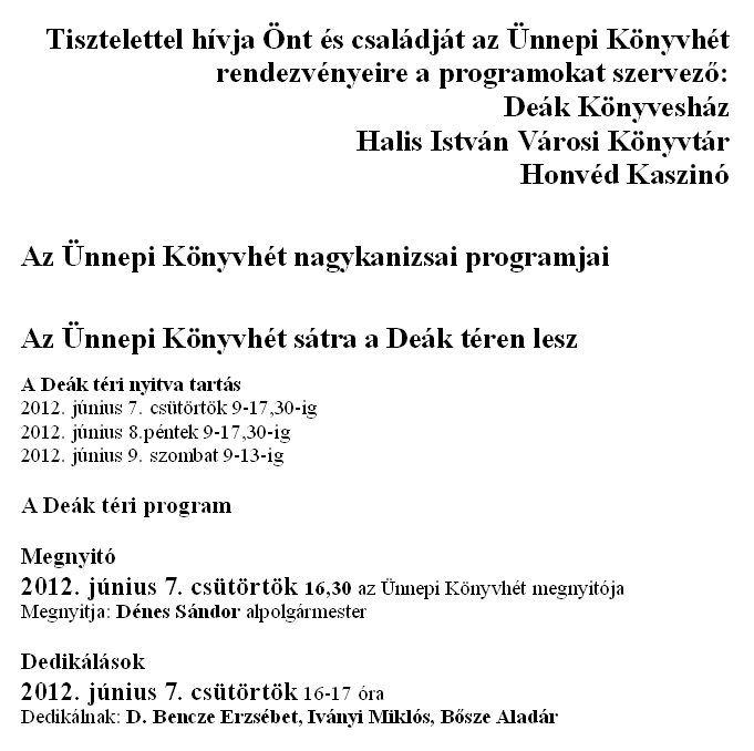 Nyilvános 1325 | 2645 | Tisztelettel hívja Önt és családját az Ünnepi Könyvhét rendezvényeire a programokat szervező: | Deák Könyvesház Halis István Városi Könyvtár Honvéd Kaszinó Az Ünnepi Könyvhét nagykanizsai programjai Az Ünnepi Könyvhét sátra a Deák téren lesz A Deák téri nyitva tartás 2012. június 7. csütörtök 9-17,30-ig 2012. június 8.péntek 9-17,30-ig 2012. június 9. szombat 9-13-ig A Deák téri program Megnyitó 2012. június 7. csütörtök 16,30 az Ünnepi Könyvhét megnyitója Megnyitja: Dénes Sándor alpolgármester Dedikálások 2012. június 7. csütörtök 16-17 óra Dedikálnak: D. Bencze Erzsébet, Iványi Miklós, Bősze Aladár |
