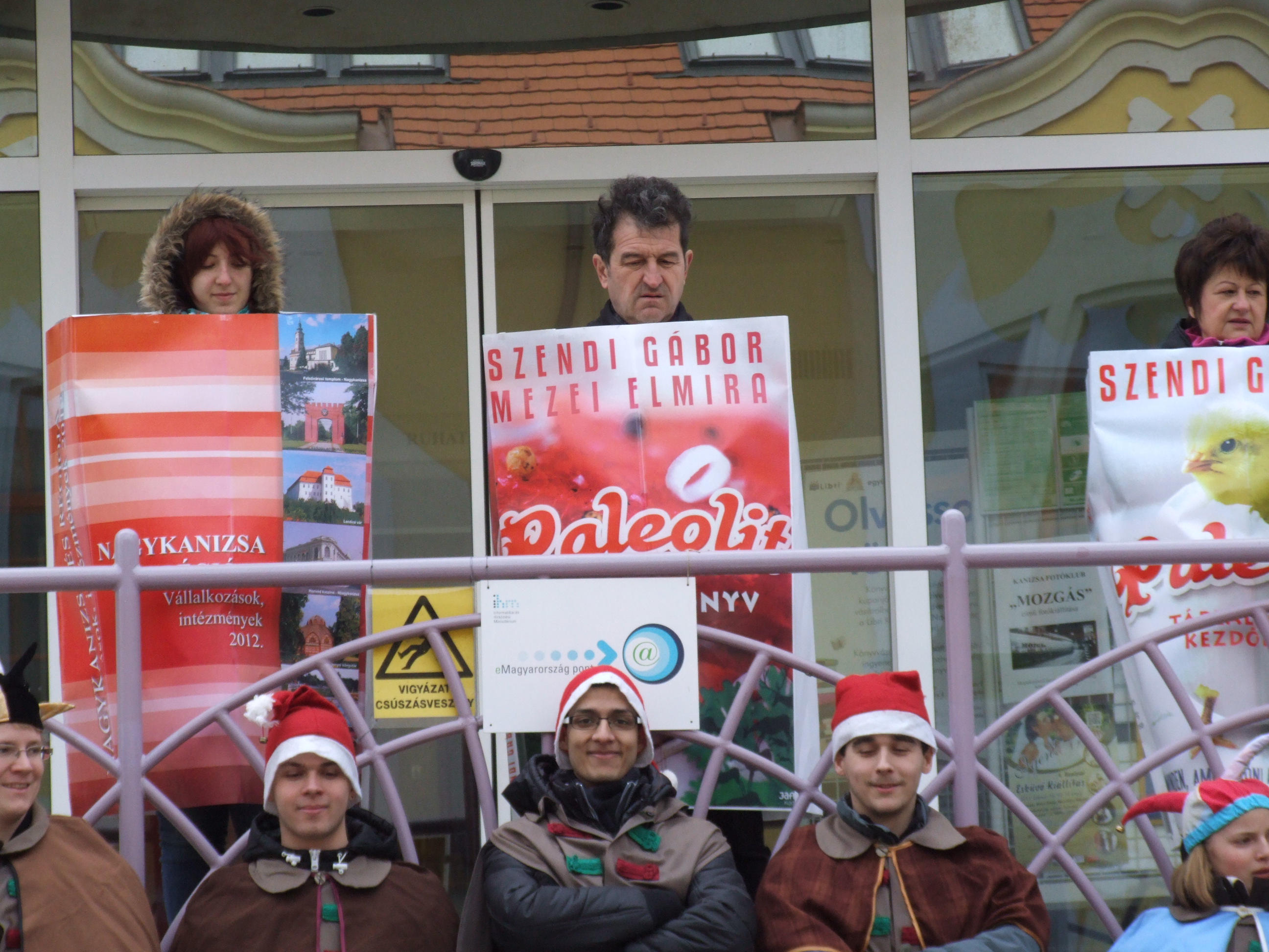 Nyilvános 1414 | 3130 | 2013. február 9. A farsangi fánkfesztiválra készülve felhívásban kértük olvasóinkat, hogy öltsék magukra kedves könyvüket. Egy „könyvespolcnyi” jelentkező vette magára kedves olvasmányát, az ő vonulásukról készültek ezek a képek. A környezetükben néhol láthatók a Nagykanizsai Gólyalábasok, akik szintén a könyvtárhoz kötődnek. A „felvonuló kötetek” a könyvtár épületében még megtekinthetők. | |