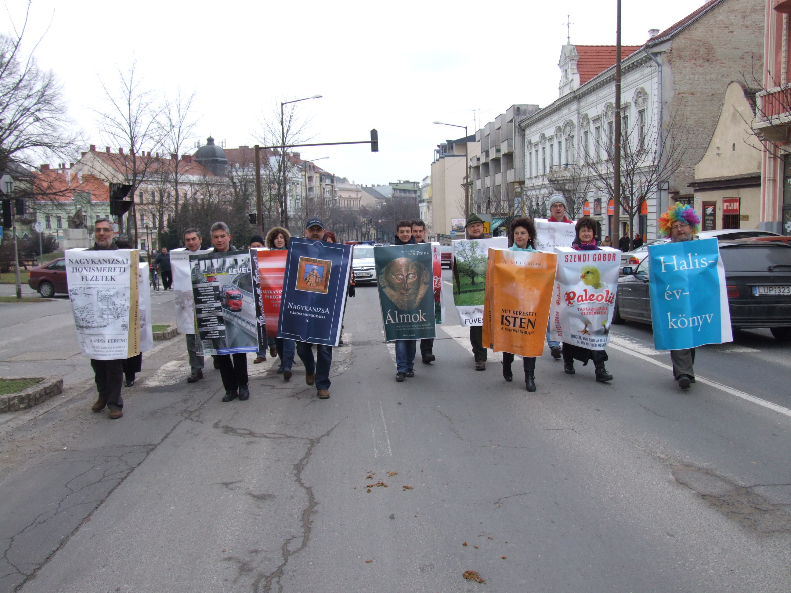 Nyilvános 1047 | 1399 | 2013. február 9. A farsangi fánkfesztiválra készülve felhívásban kértük olvasóinkat, hogy öltsék magukra kedves könyvüket. Egy „könyvespolcnyi” jelentkező vette magára kedves olvasmányát, az ő vonulásukról készültek ezek a képek. A környezetükben néhol láthatók a Nagykanizsai Gólyalábasok, akik szintén a könyvtárhoz kötődnek. A „felvonuló kötetek” a könyvtár épületében még megtekinthetők. | |