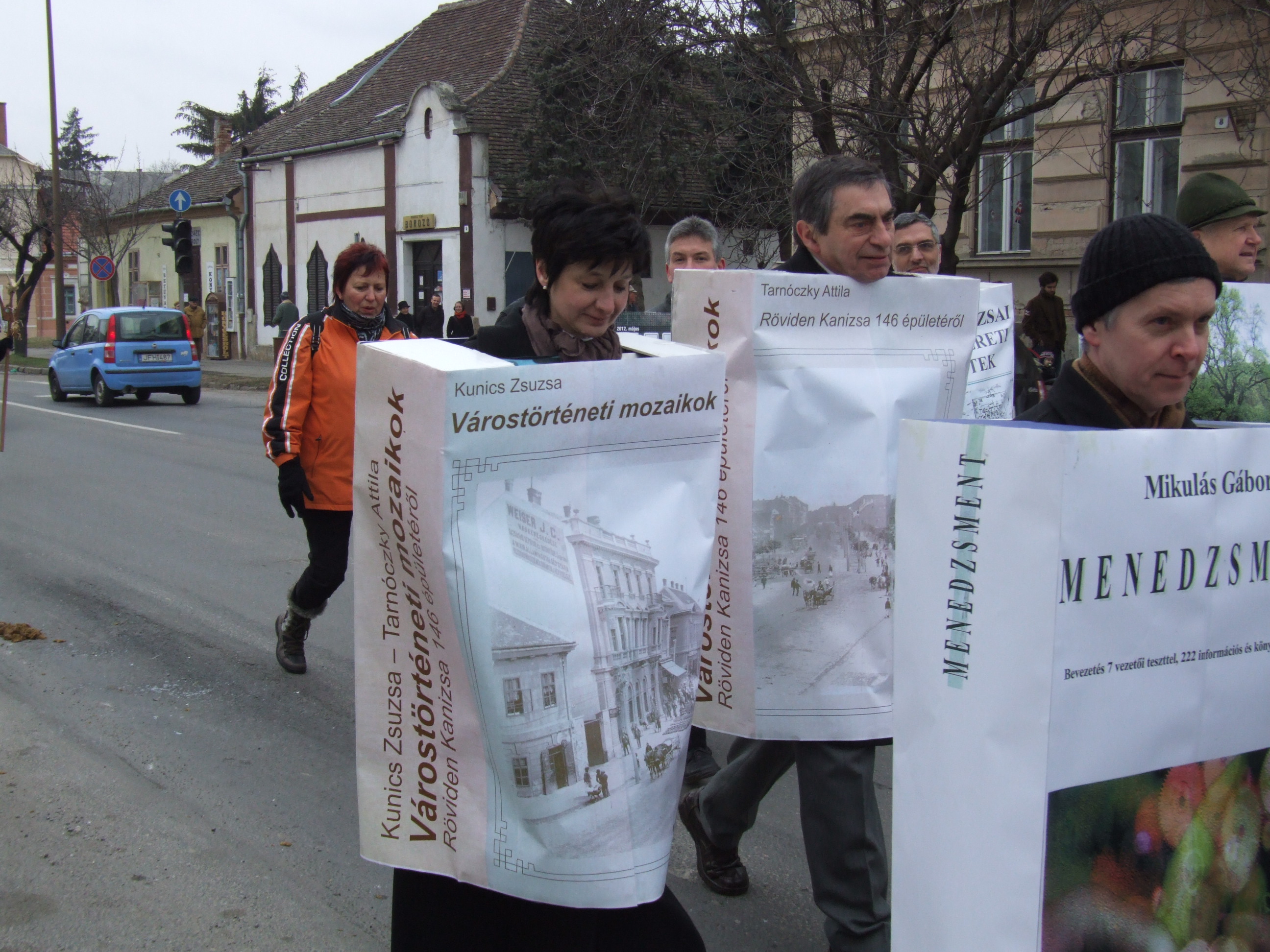 Nyilvános 1065 | 1416 | 2013. február 9. A farsangi fánkfesztiválra készülve felhívásban kértük olvasóinkat, hogy öltsék magukra kedves könyvüket. Egy „könyvespolcnyi” jelentkező vette magára kedves olvasmányát, az ő vonulásukról készültek ezek a képek. A környezetükben néhol láthatók a Nagykanizsai Gólyalábasok, akik szintén a könyvtárhoz kötődnek. A „felvonuló kötetek” a könyvtár épületében még megtekinthetők. | |