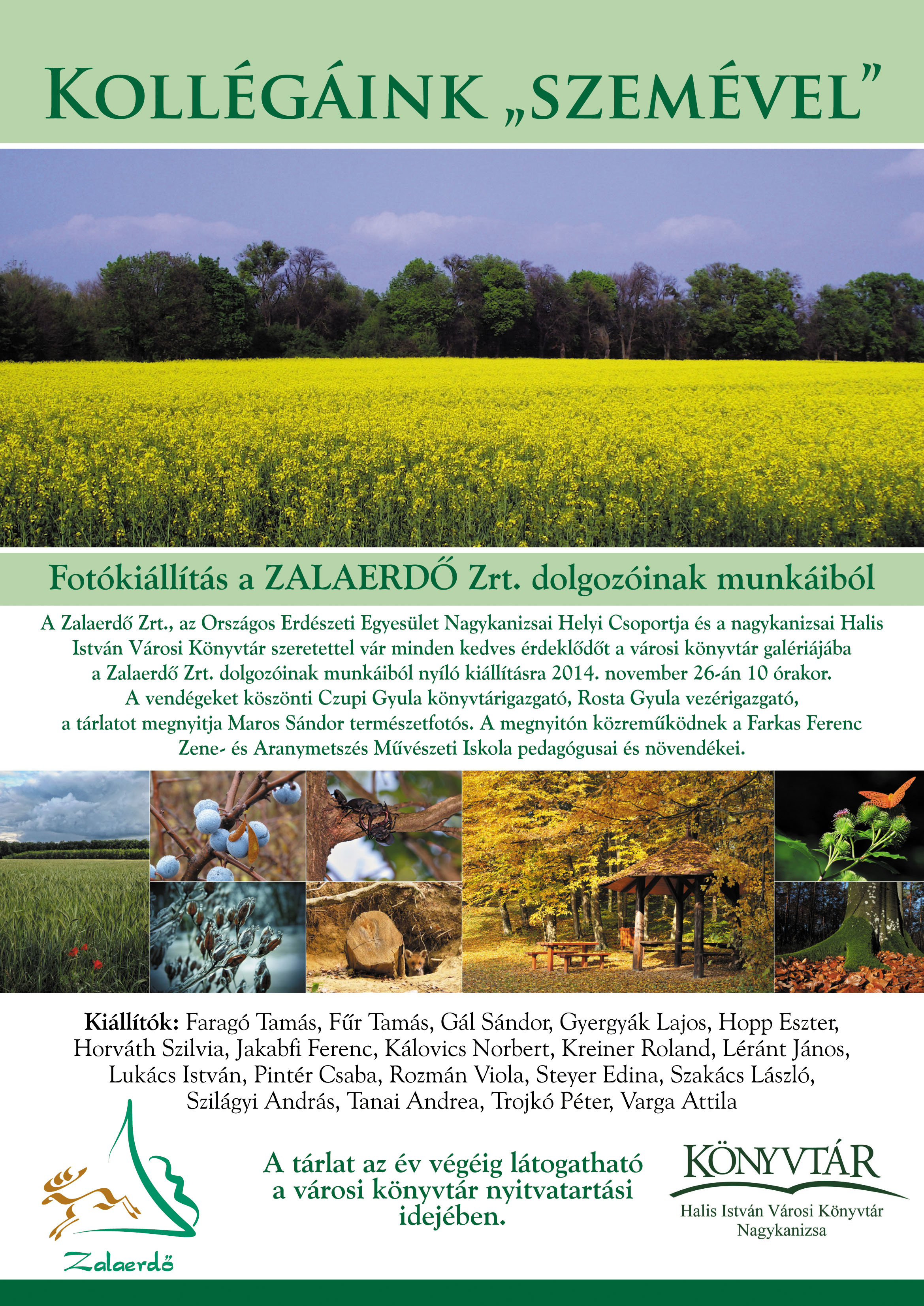 Nyilvános 1563 | 3011 | Kollégáink szemével | Fotókiállítás a ZALAERDŐ Zrt. dolgozóinak munkáiból A Zalaerdő Zrt., az Országos Erdészeti Egyesület Nagykanizsai Helyi Csoportja és a nagykanizsai Halis István Városi Könyvtár szeretettel vár minden kedves érdeklődőt a városi könyvtár galériájába a Zalaerdő Zrt. dolgozóinak munkáiból nyíló kiállításra 2014. november 26-án 10 órakor. A vendégeket köszönti Czupi Gyula könyvtárigazgató, Rosta Gyula vezérigazgató, a tárlatot megnyitja Maros Sándor természetfotós. A megnyitón közreműködnek a Farkas Ferenc Zene- és Aranymetszés Művészeti Iskola pedagógusai és növendékei. Kiállítók: Faragó Tamás, Fűr Tamás, Gál Sándor, Gyergyák Lajos, Hopp Eszter, Horváth Szilvia, Jakabfi Ferenc, Kálovics Norbert, Kreiner Roland, Léránt János, Lukács István, Pintér Csaba, Rozmán Viola, Steyer Edina, Szakács László, Szilágyi András, Tanai Andrea, Trojkó Péter, Varga Attila A tárlat az év végéig látogatható a városi könyvtár nyitvatartási idejében. |