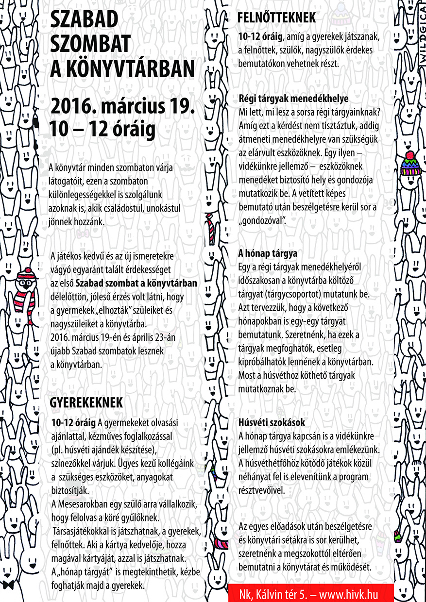 Nyilvános 1295 | 2558 | Rövid leírás | Teljes leírás (2.93 KB) | SZABAD SZOMBAT A KÖNYVTÁRBAN 2016. március 19. 10 – 12 óráig A könyvtár minden szombaton várja látogatóit, ezen a szombaton különlegességekkel is szolgálunk azoknak is, akik családostul, unokástul jönnek hozzánk. A játékos kedvű és az új ismeretekre vágyó egyaránt talált érdekességet az első Szabad szombat a könyvtárban délelőttön, jóleső érzés volt látni, hogy a gyermekek „elhozták” szüleiket és nagyszüleiket a könyvtárba. 2016. március 19-én és április 23-án újabb Szabad szombatok lesznek a könyvtárban. GYEREKEKNEK 10-12 óráig A gyermekeket olvasási ajánlattal, kézműves foglalkozással (pl. húsvéti ajándék készítése), színezőkkel várjuk. Ügyes kezű kollégáink a szükséges eszközöket, anyagokat biztosítják. A Mesesarokban egy szülő arra vállalkozik, hogy felolvas a köré gyűlőknek. Társasjátékokkal is játszhatnak, a gyerekek, felnőttek. Aki a kártya kedvelője, hozza magával kártyáját, azzal is játszhatnak. A „hónap tárgyát” is megtekinthetik, kézbe foghatják majd a gyerekek. FELNŐTTEKNEK 10-12 óráig, amíg a gyerekek játszanak, a felnőttek, szülők, nagyszülők érdekes bemutatókon vehetnek részt. Régi tárgyak menedékhelye Mi lett, mi lesz a sorsa régi tárgyainknak? Amíg ezt a kérdést nem tisztáztuk, addig átmeneti menedékhelyre van szükségük az elárvult eszközöknek. Egy ilyen – vidékünkre jellemző – eszközöknek menedéket biztosító hely és gondozója mutatkozik be. A vetített képes bemutató után beszélgetésre kerül sor a „gondozóval”. A hónap tárgya Egy a régi tárgyak menedékhelyéről időszakosan a könyvtárba költöző tárgyat (tárgycsoportot) mutatunk be. Azt tervezzük, hogy a következő hónapokban is egy-egy tárgyat bemutatunk. Szeretnénk, ha ezek a tárgyak megfoghatók, esetleg kipróbálhatók lennének a könyvtárban. Most a húsvéthoz köthető tárgyak mutatkoznak be. Húsvéti szokások A hónap tárgya kapcsán is a vidékünkre jellemző húsvéti szokásokra emlékezünk. A húsvéthétfőhöz kötődő játékok közül néhányat fel is elevenítünk a program résztvevőivel. Az egyes előadások után beszélgetésre és könyvtári sétákra is sor kerülhet, szeretnénk a megszokottól eltérően bemutatni a könyvtárat és működését. Nk, Kálvin tér 5. – www.hivk.hu |