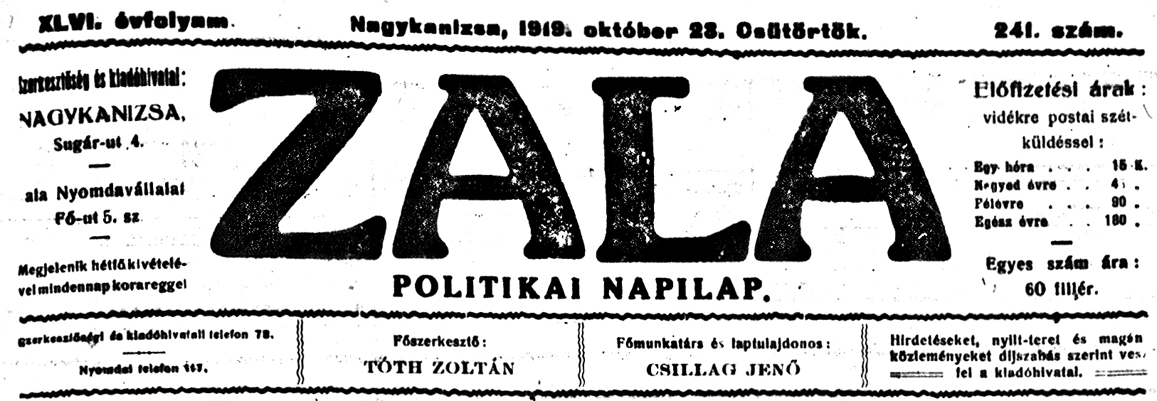 Újság fejléc - Zala 1919 10 23 241sz 01old - Búcsúzás Lehár ezredestől.jpg