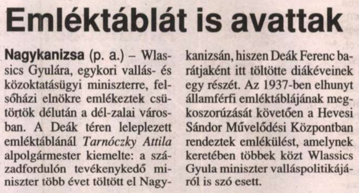 Nyilvános 874 | 1098 | Zalai Hirlap 2002. március 16. 5. oldal | Emléktáblát is avattak Nagykanizsa (p. a.) - Wlassics Gyulára, egykori vallás- és közoktatásügyi miniszterre, felsőházi elnökre emlékeztek csütörtök délután a dél-zalai városban. A Deák téren leleplezett emléktáblánál Tarnóczky Attila alpolgármester kiemelte: a századfordulón tevékenykedő miniszter több évet töltött el Nagykanizsán, hiszen Deák Ferenc barátjaként itt töltötte diákéveinek egy részét. Az 1937-ben elhunyt államférfi emléktáblájának megkoszorúzását követően a Hevesi Sándor Művelődési Központban rendeztek emlékülést, amelynek keretében többek közt Wlassics Gyula miniszter valláspolitikájáról is szó esett. |